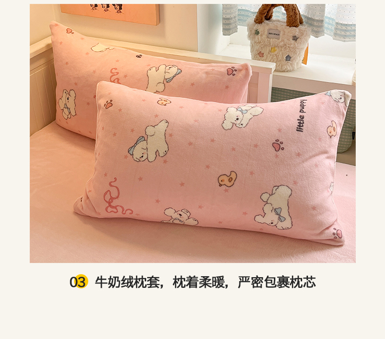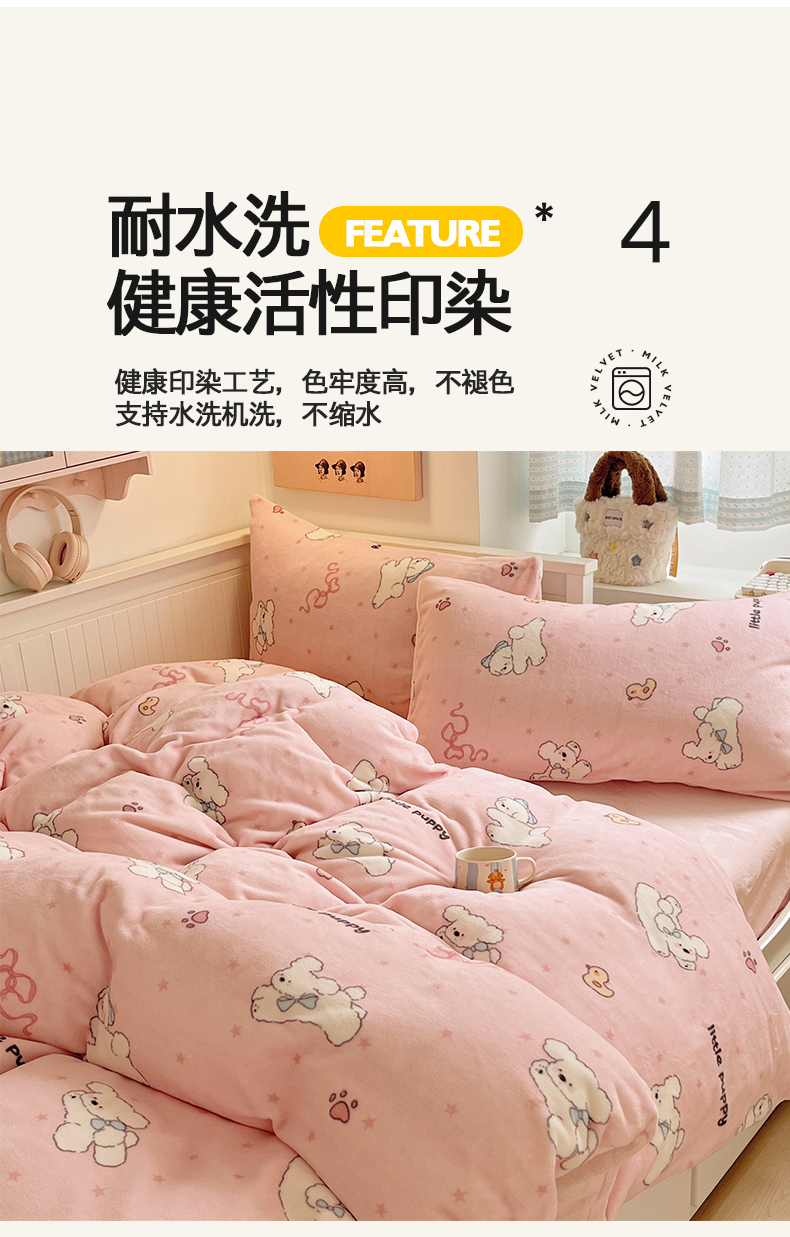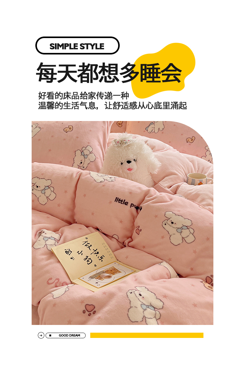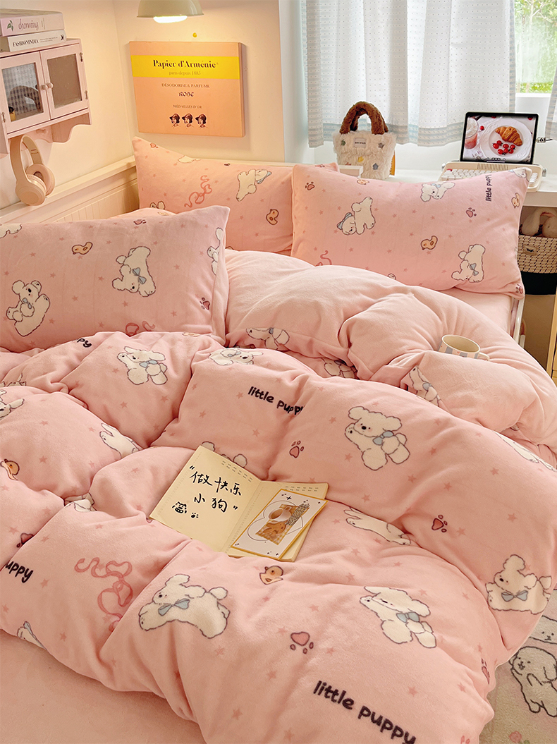 商品名称:金爱家 2025新款A类ins小清新少女奶油卡通可爱加厚牛奶绒四件套 绒-粉小狗