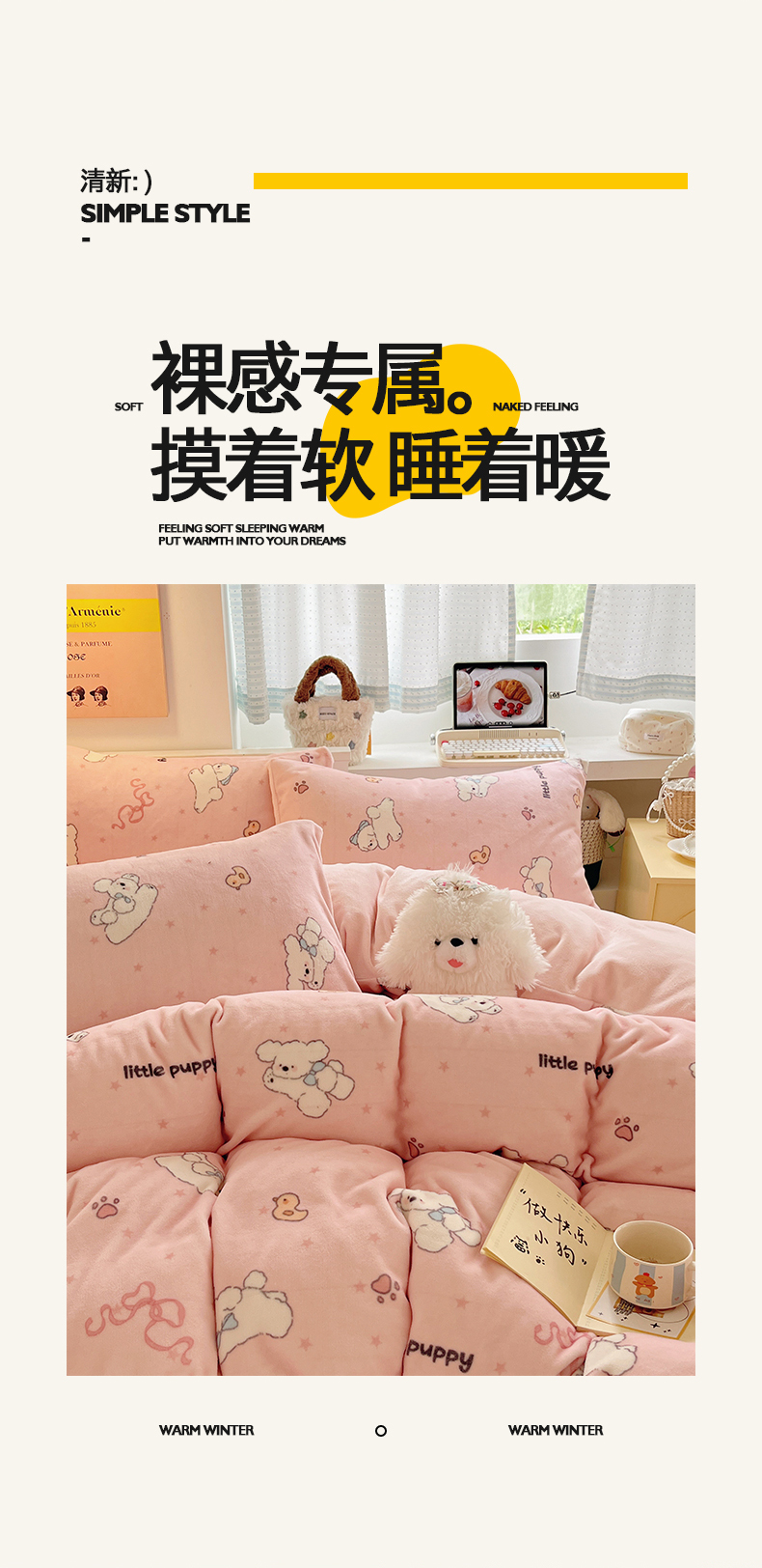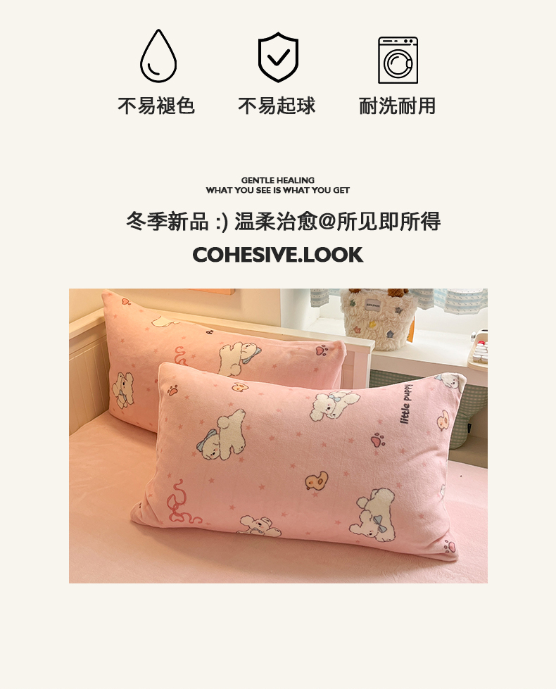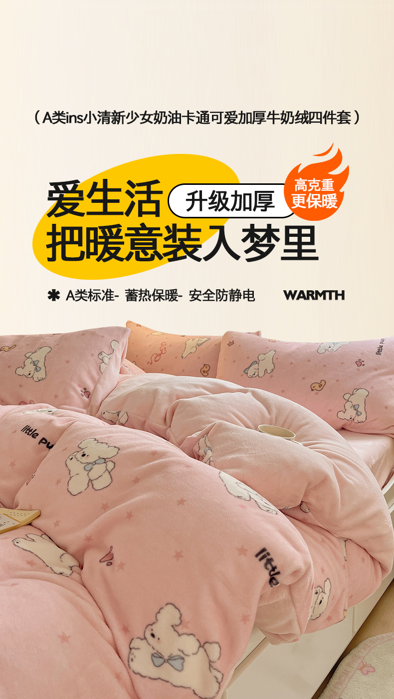 商品名称:金爱家 2025新款A类ins小清新少女奶油卡通可爱加厚牛奶绒四件套 绒-粉小狗