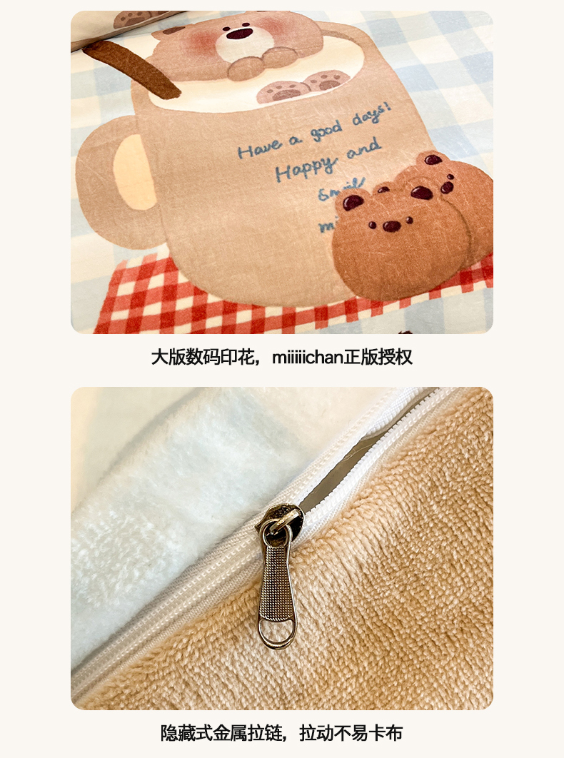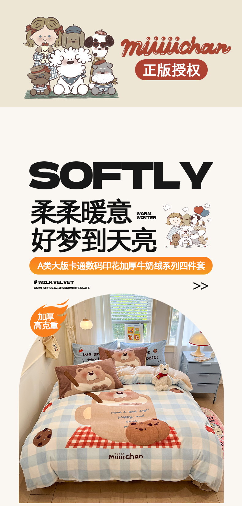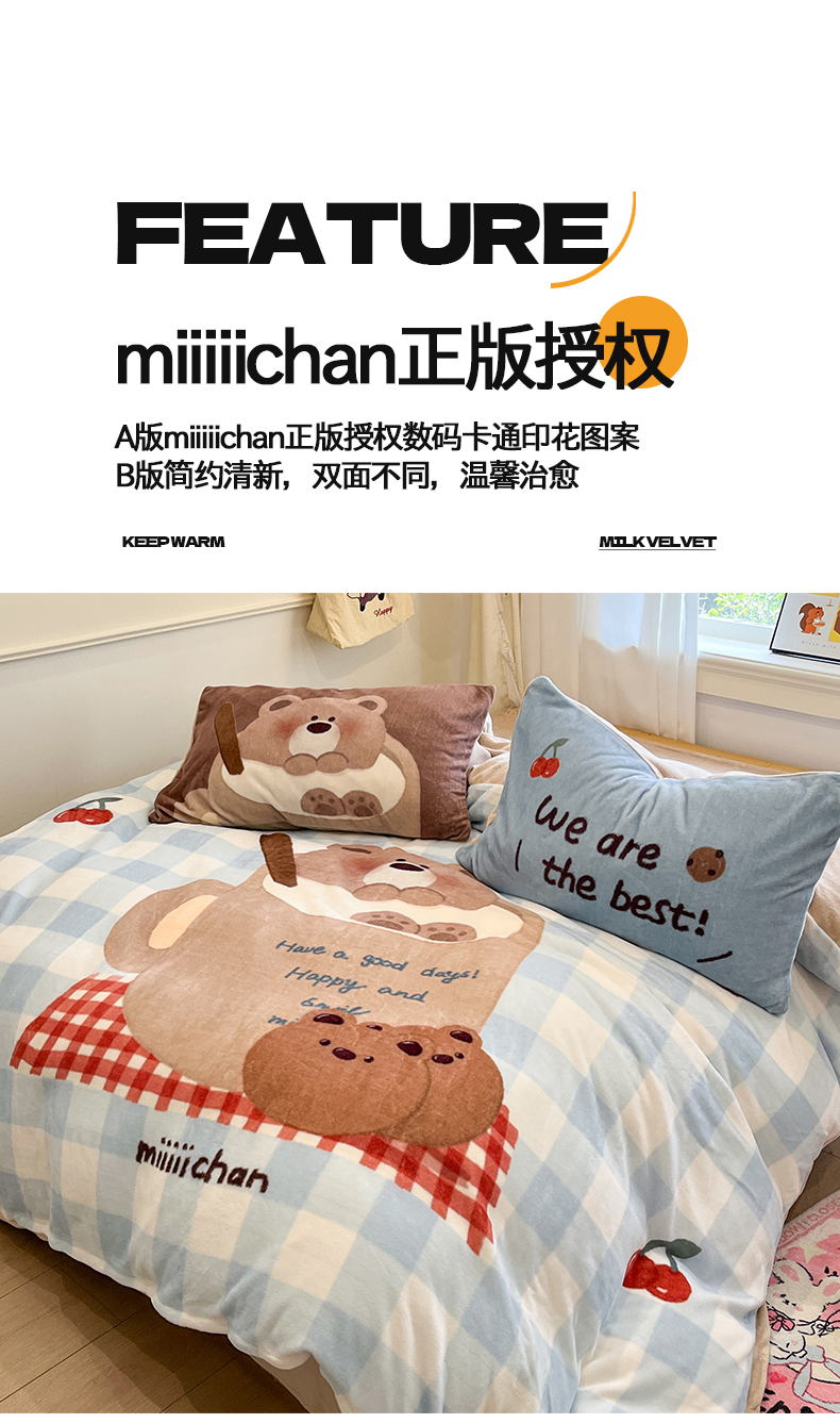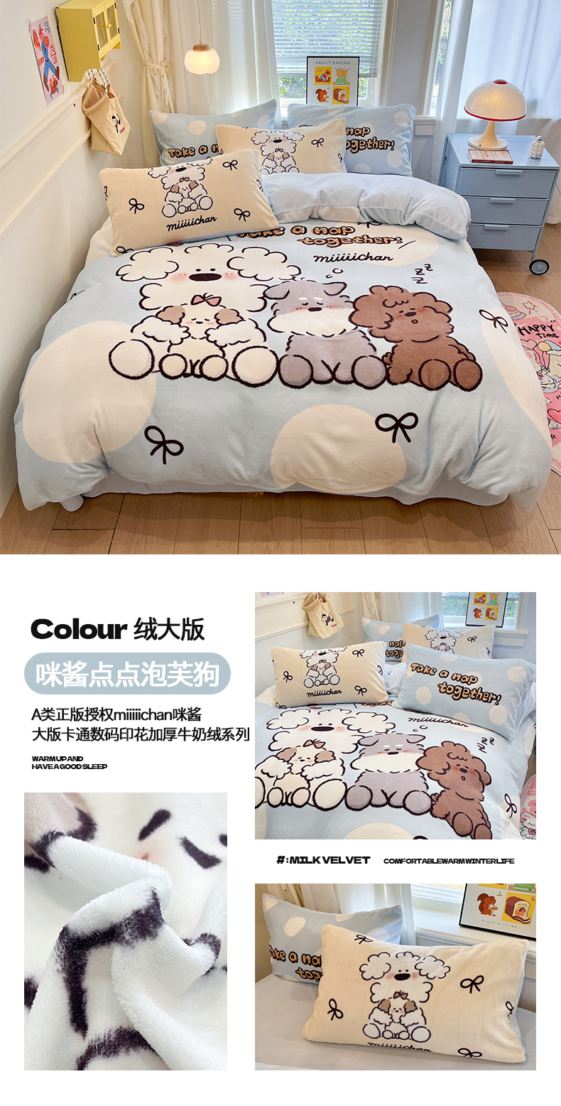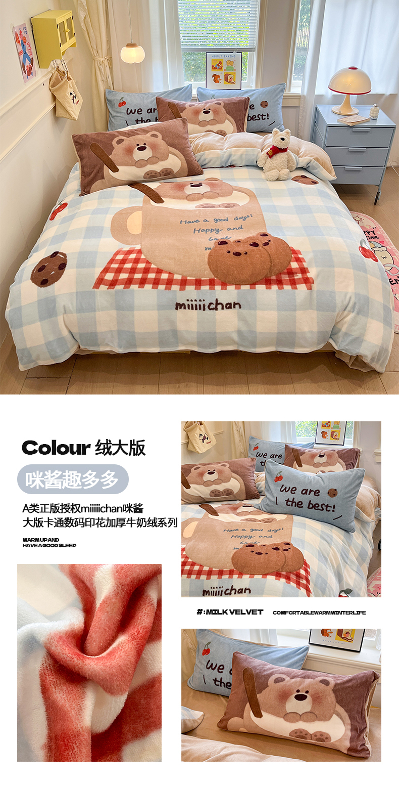 商品名称:金爱家 2025新品A类正版授权miiiiichan咪酱大版卡通数码印花加厚牛奶绒系列四件套 绒大版-咪酱趣多多