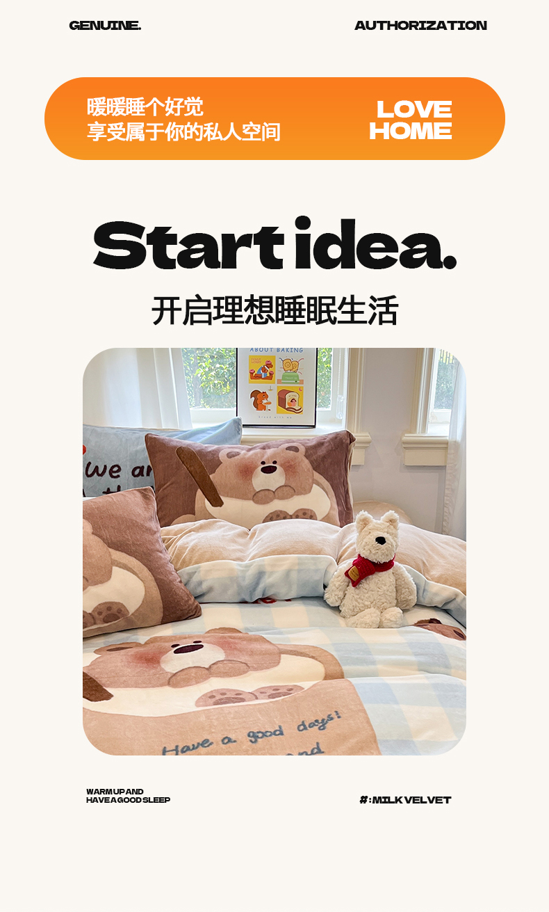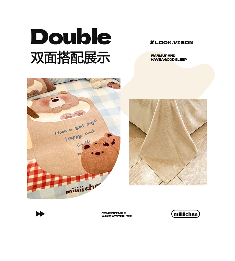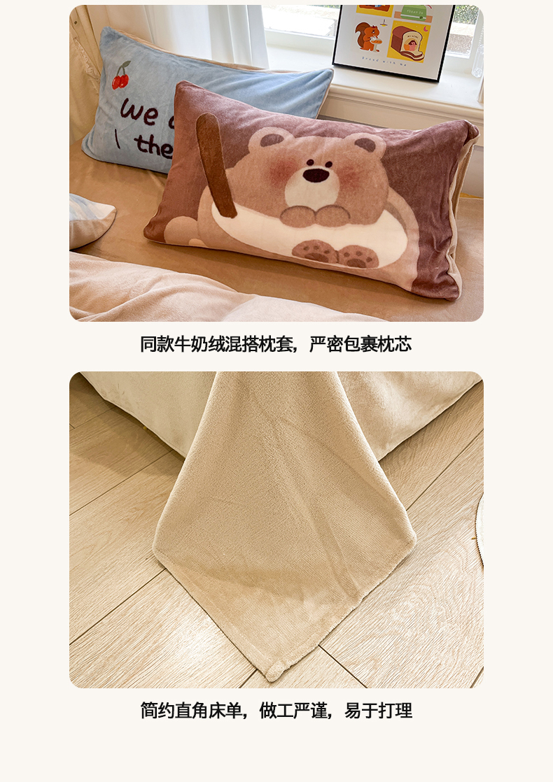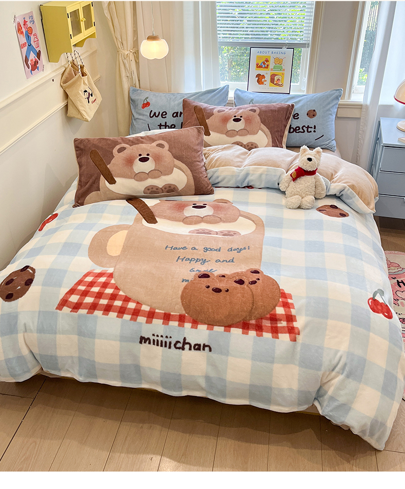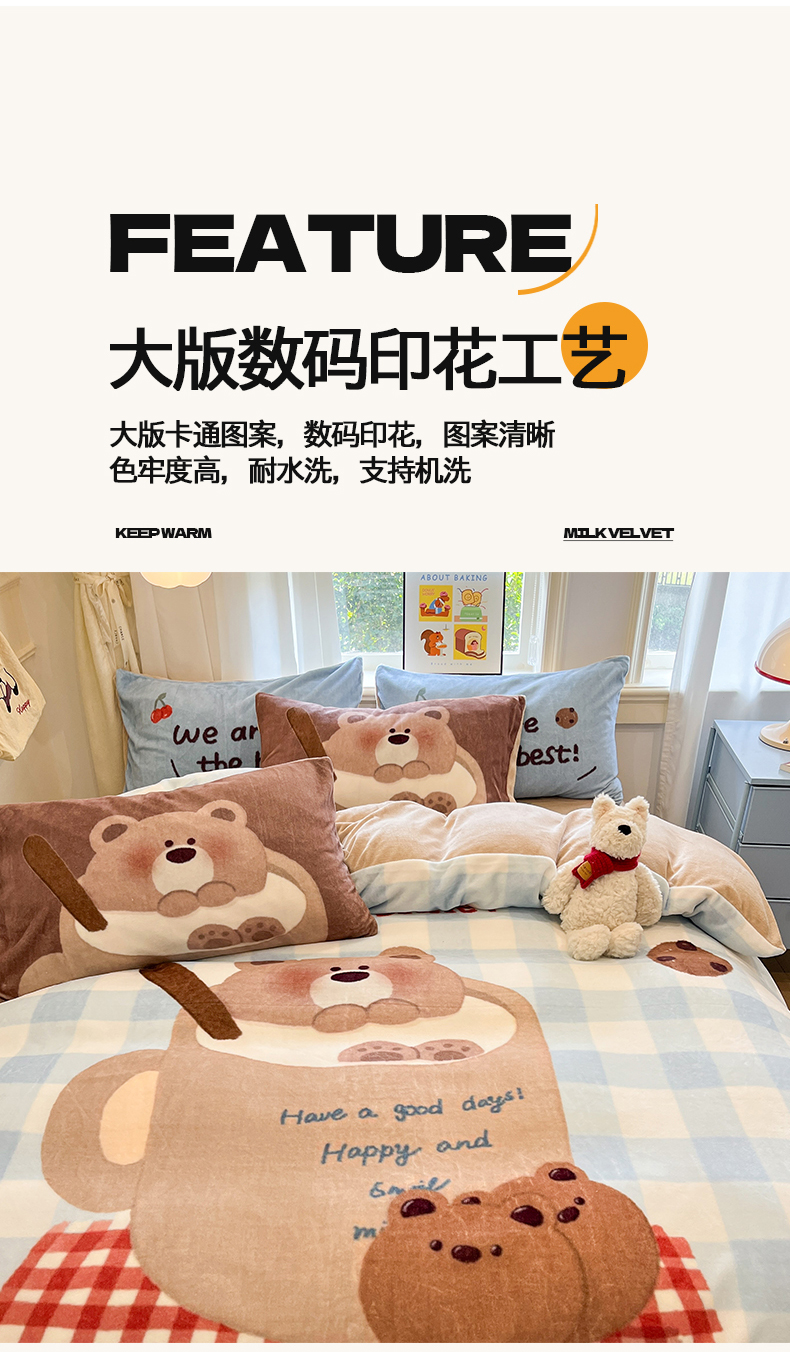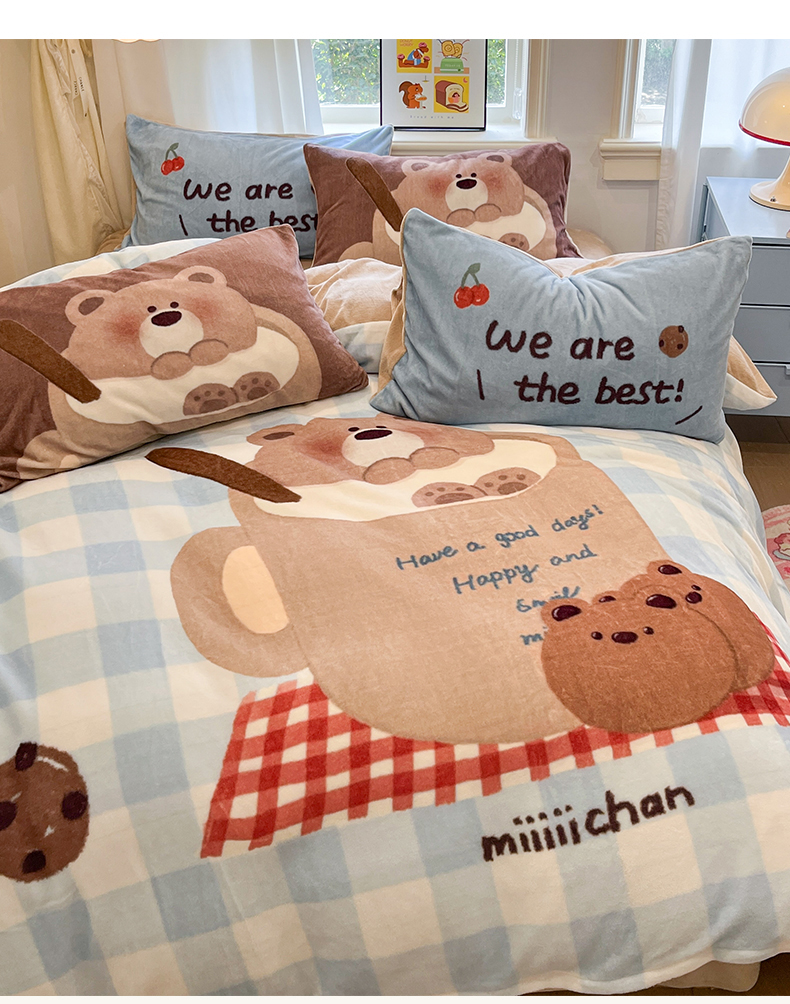 商品名称:金爱家 2025新品A类正版授权miiiiichan咪酱大版卡通数码印花加厚牛奶绒系列四件套 绒大版-咪酱趣多多