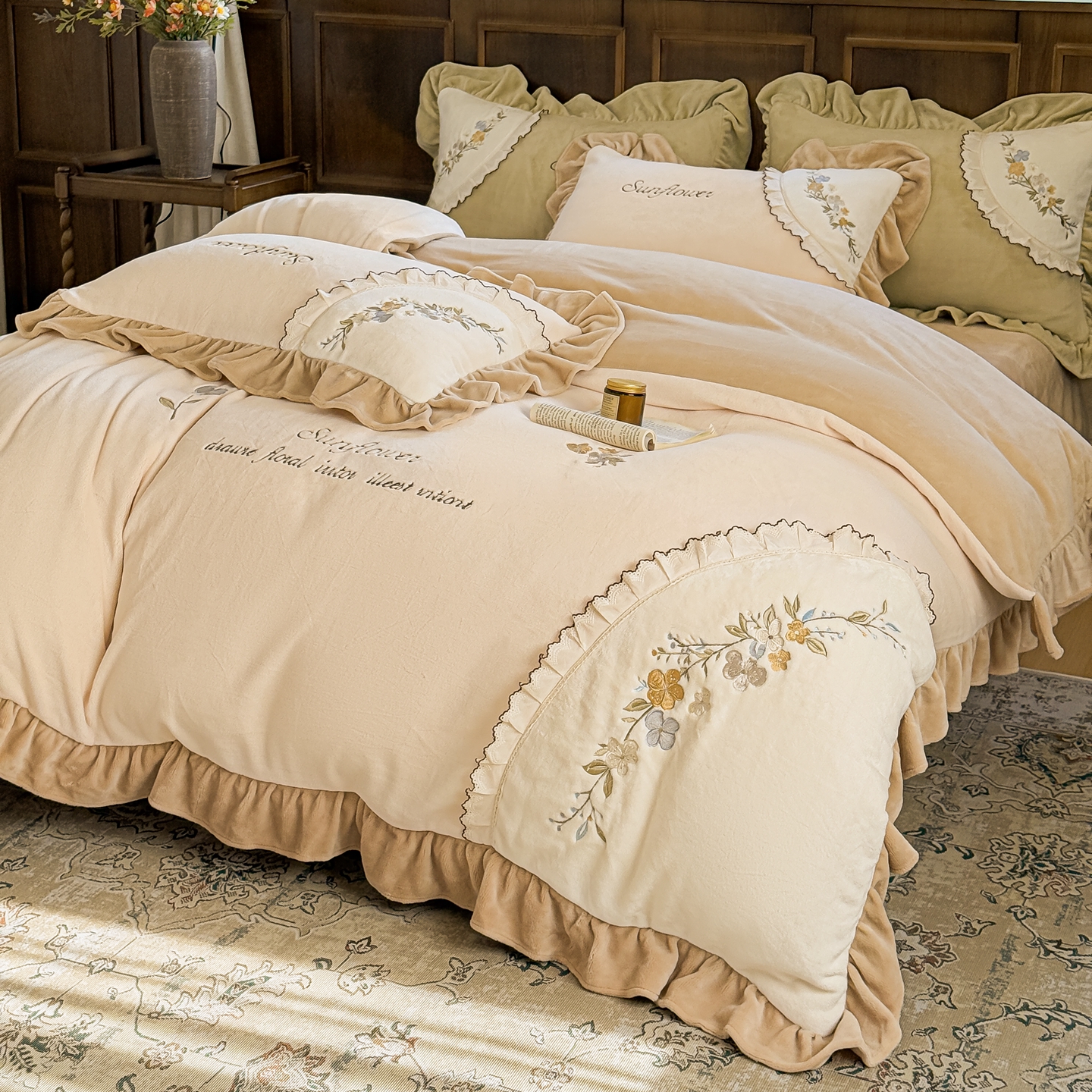 (总)阿那亚 2025新款加厚煦暖绒牛奶绒四件套韩版花边四件套刺绣四件套,安娜卡其,繁华果绿,伊贝浅蓝,伊贝米驼,伊贝果绿,繁华奶白,繁华粉,安娜奶白