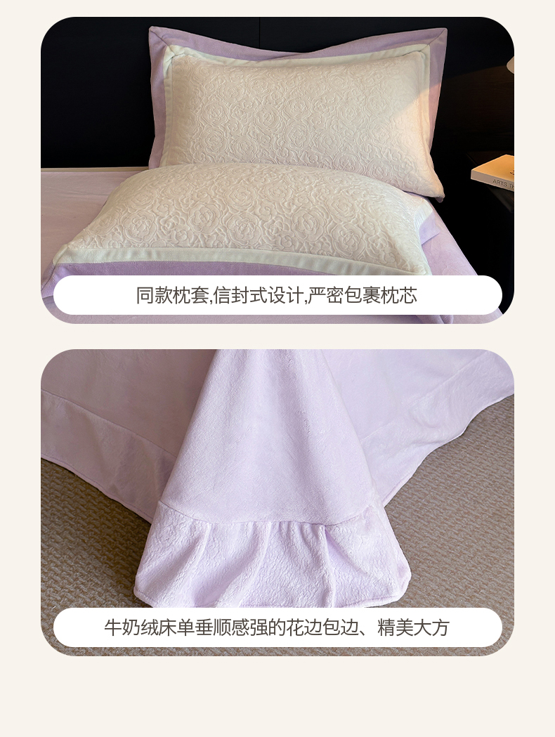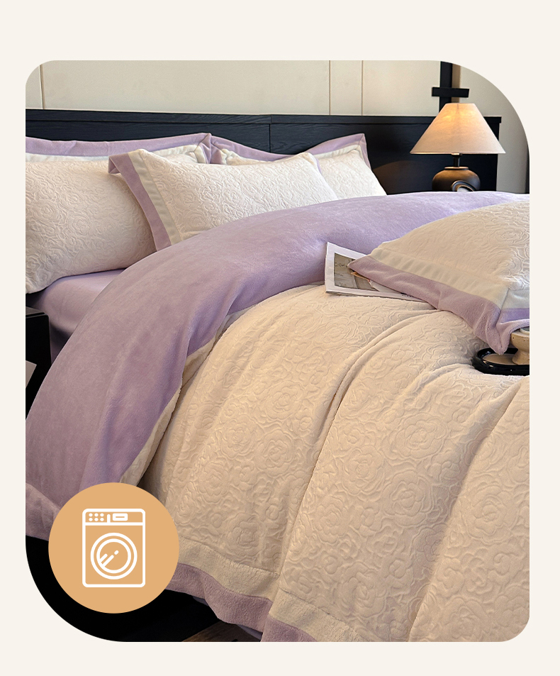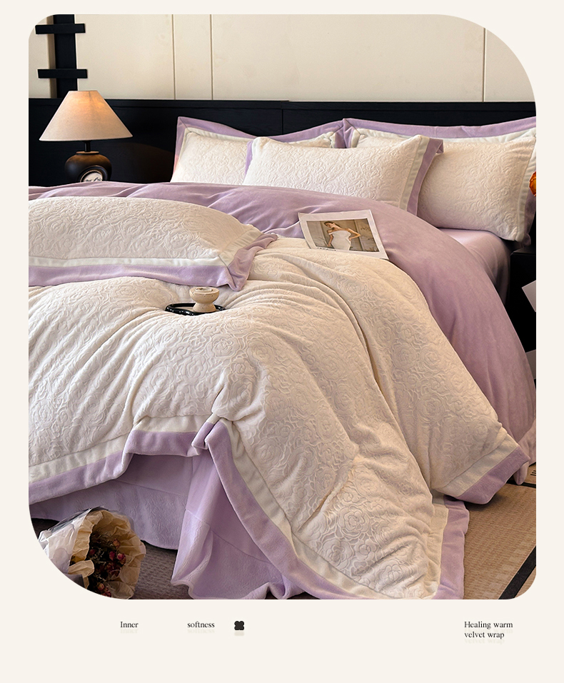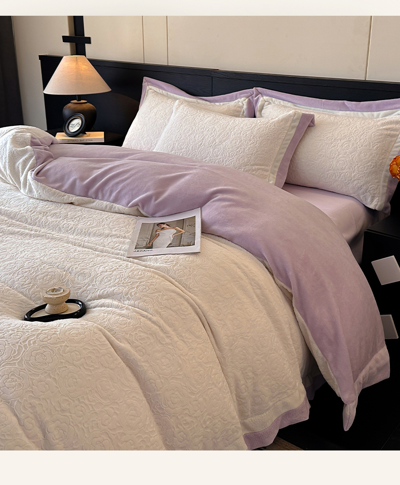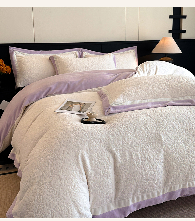 绘萱家居 2025新品热款高密消光双拼边雕花牛奶绒四件套拼角纯色 艾米丽-白紫