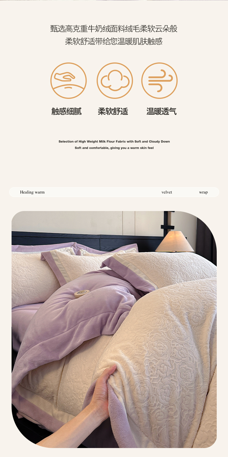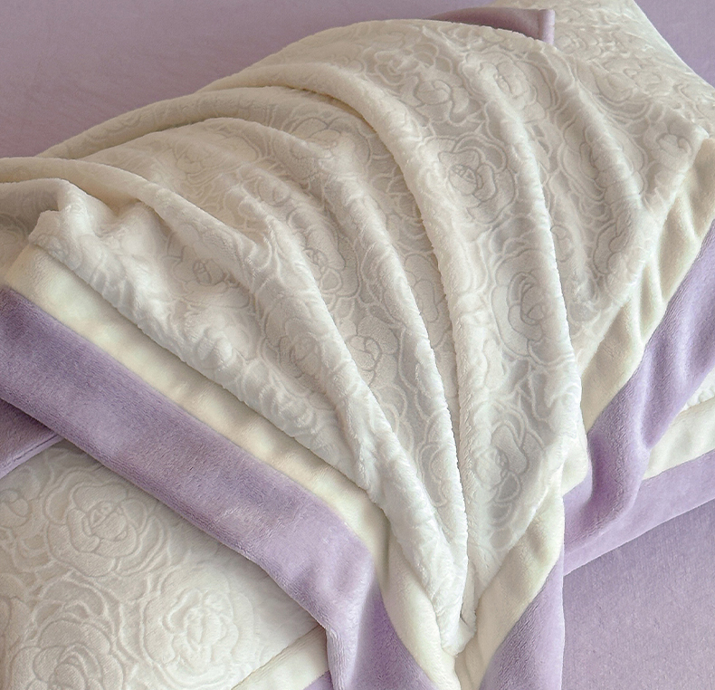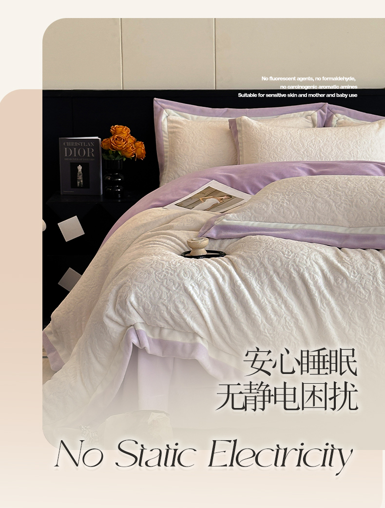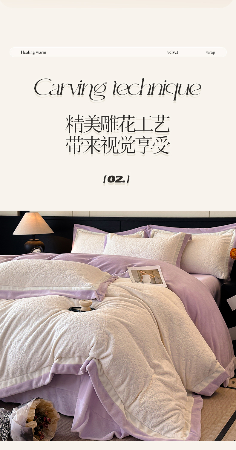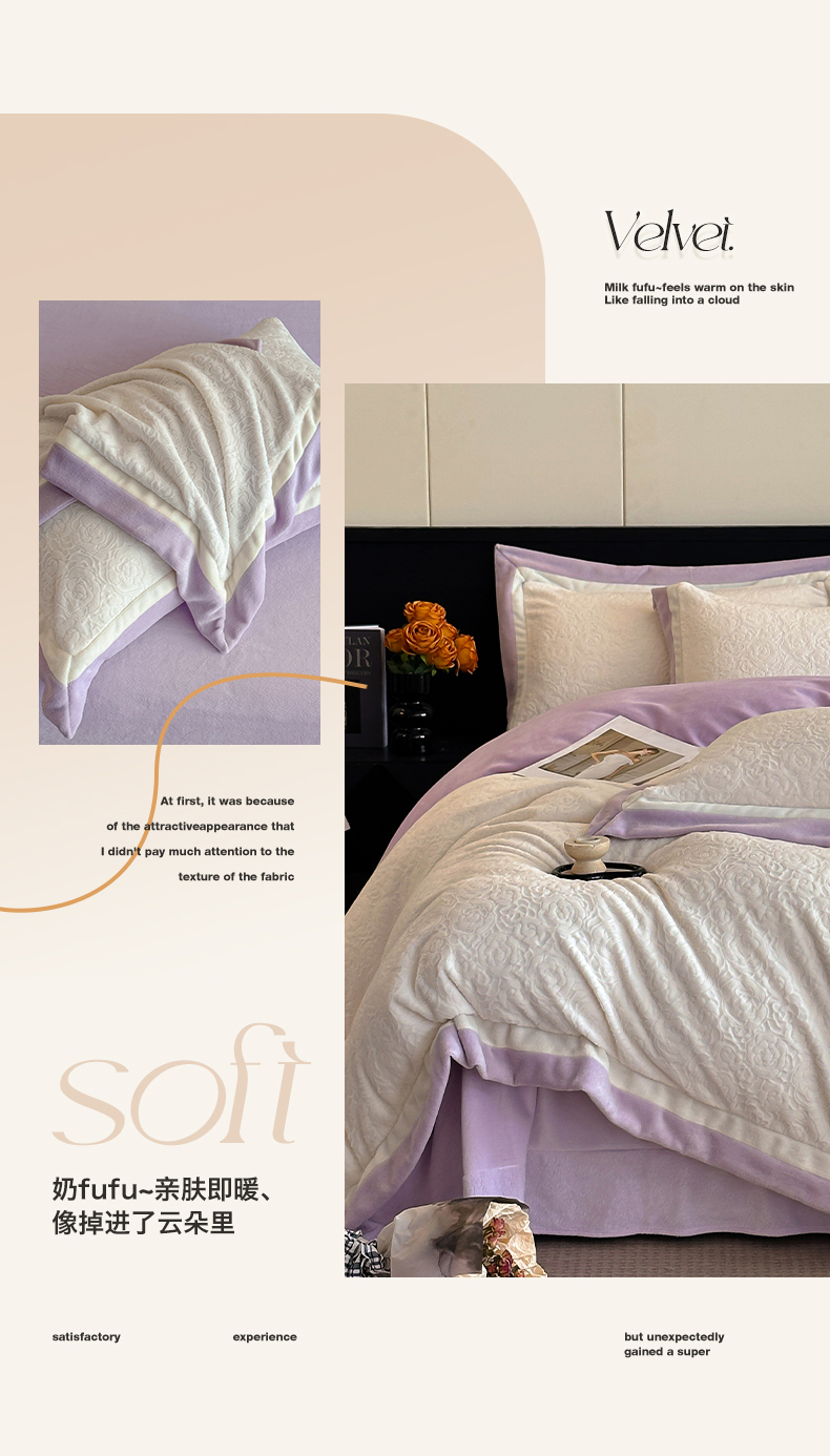 绘萱家居 2025新品热款高密消光双拼边雕花牛奶绒四件套拼角纯色 艾米丽-白紫
