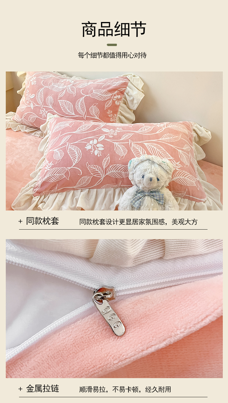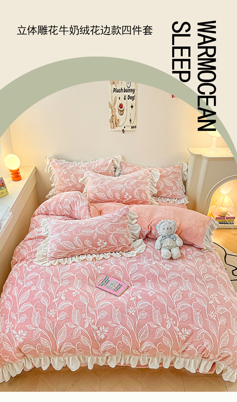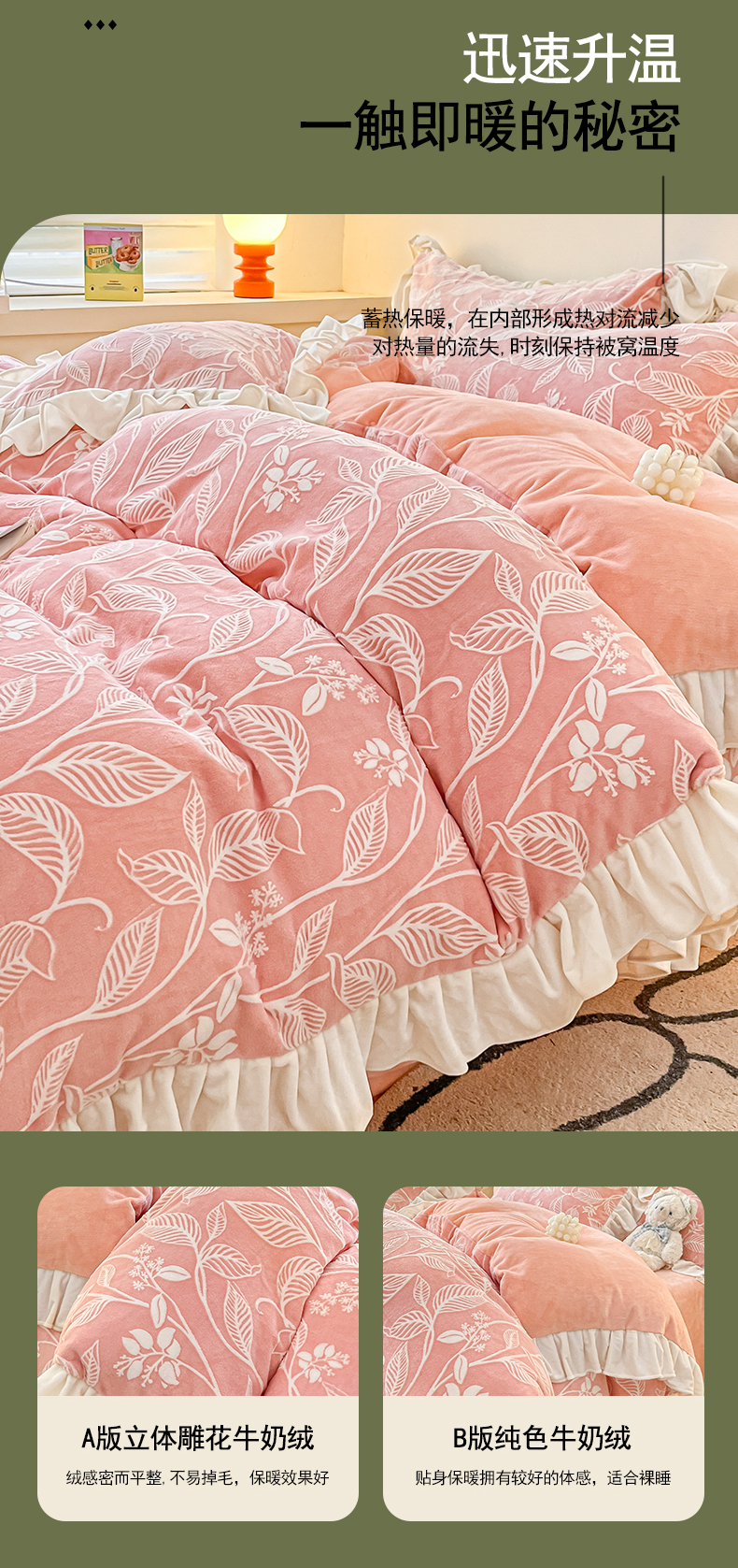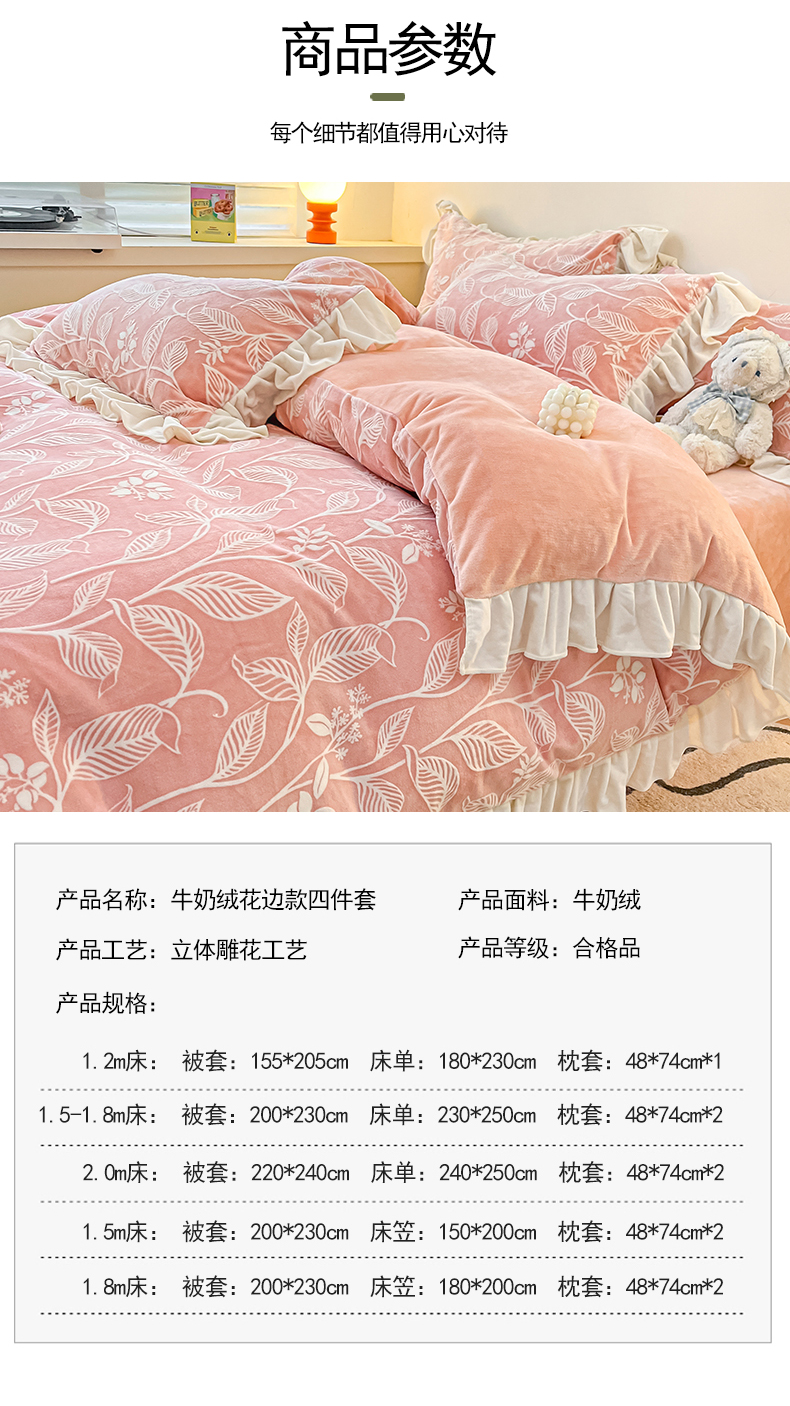 当前位置: 91家纺网 > 商品网购 > 床品套件 > 四件套 > 牛奶绒四件套 > 琪格格纺织 2025新款全消光小清新花边款雕花牛奶绒四件套 雕花绒花边 迪娅妮 粉
