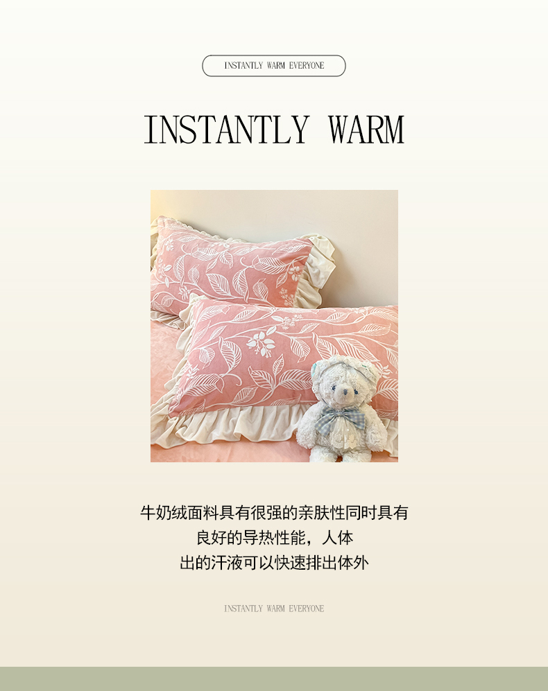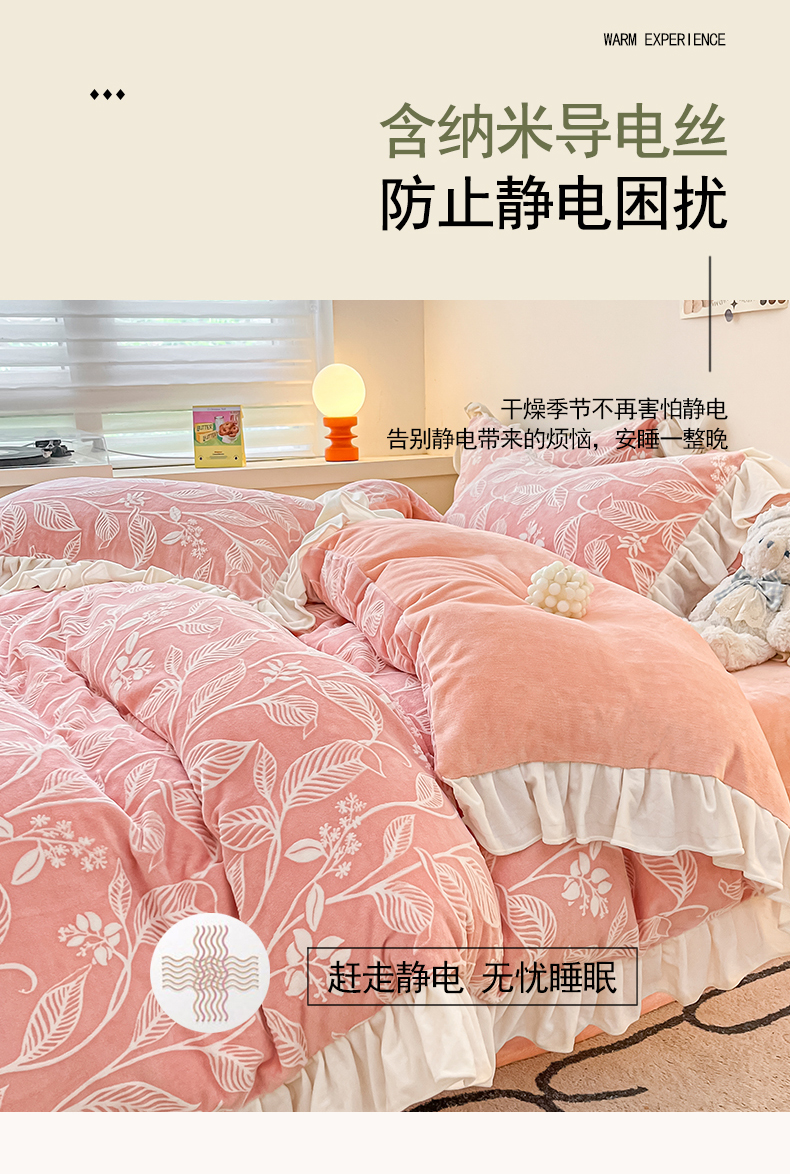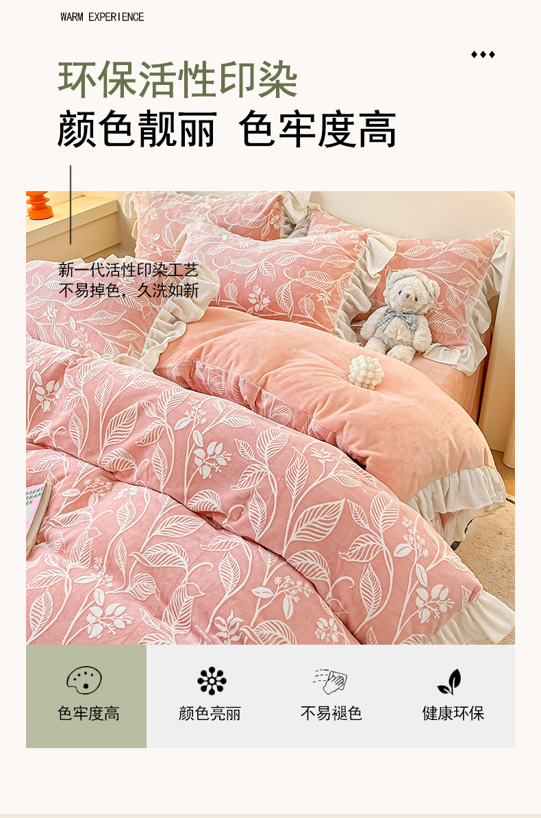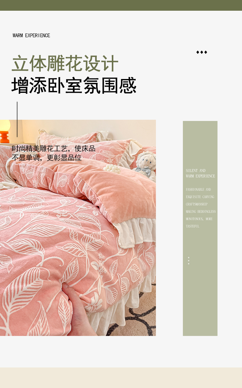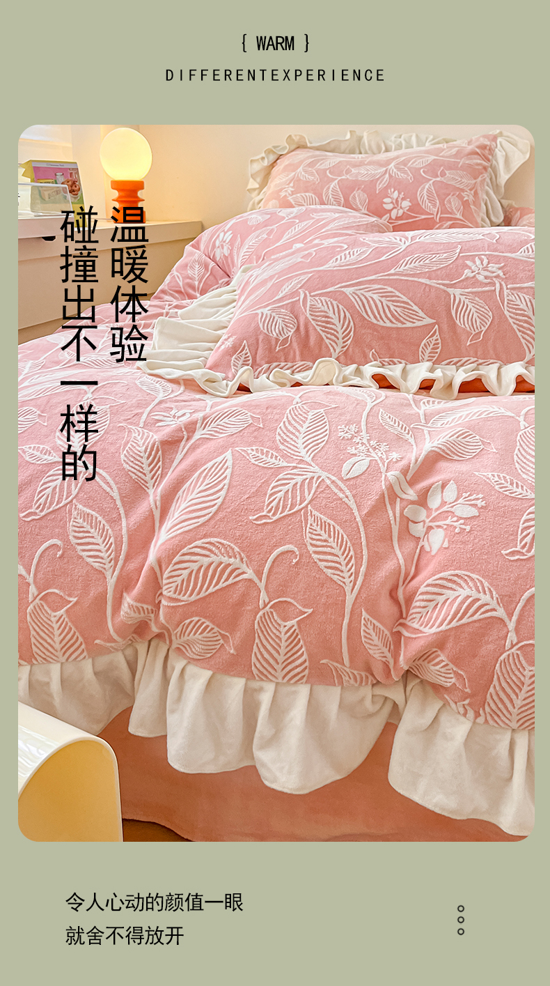 当前位置: 91家纺网 > 商品网购 > 床品套件 > 四件套 > 牛奶绒四件套 > 琪格格纺织 2025新款全消光小清新花边款雕花牛奶绒四件套 雕花绒花边 迪娅妮 粉