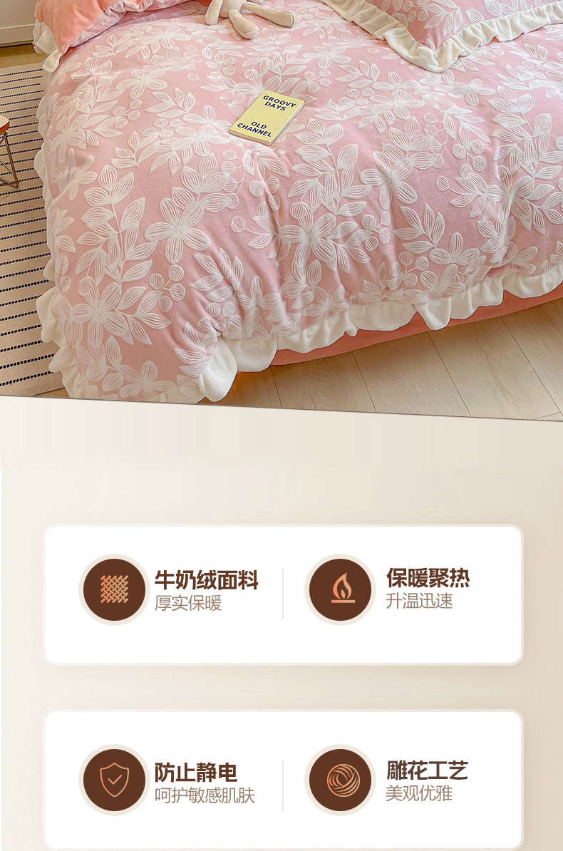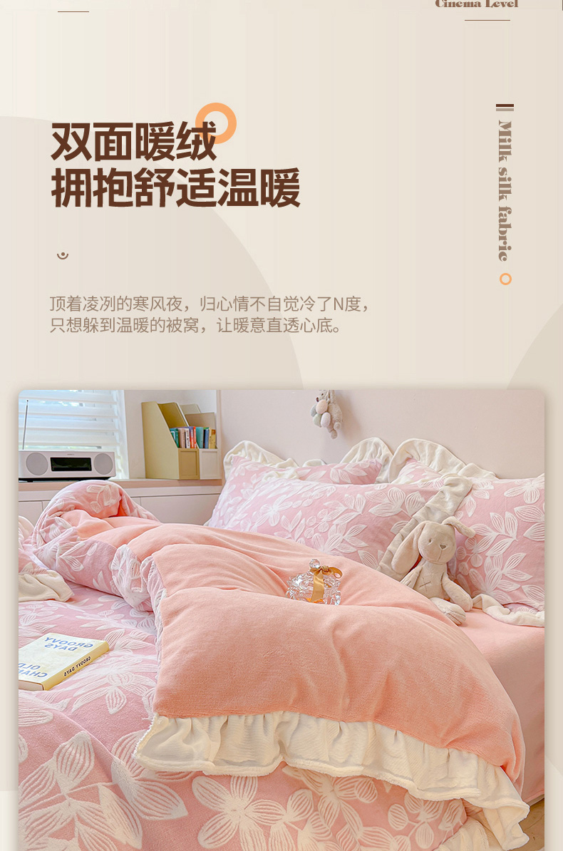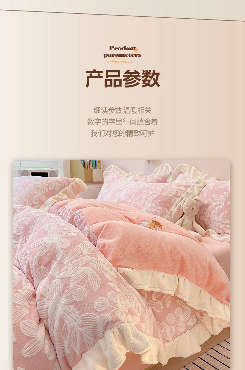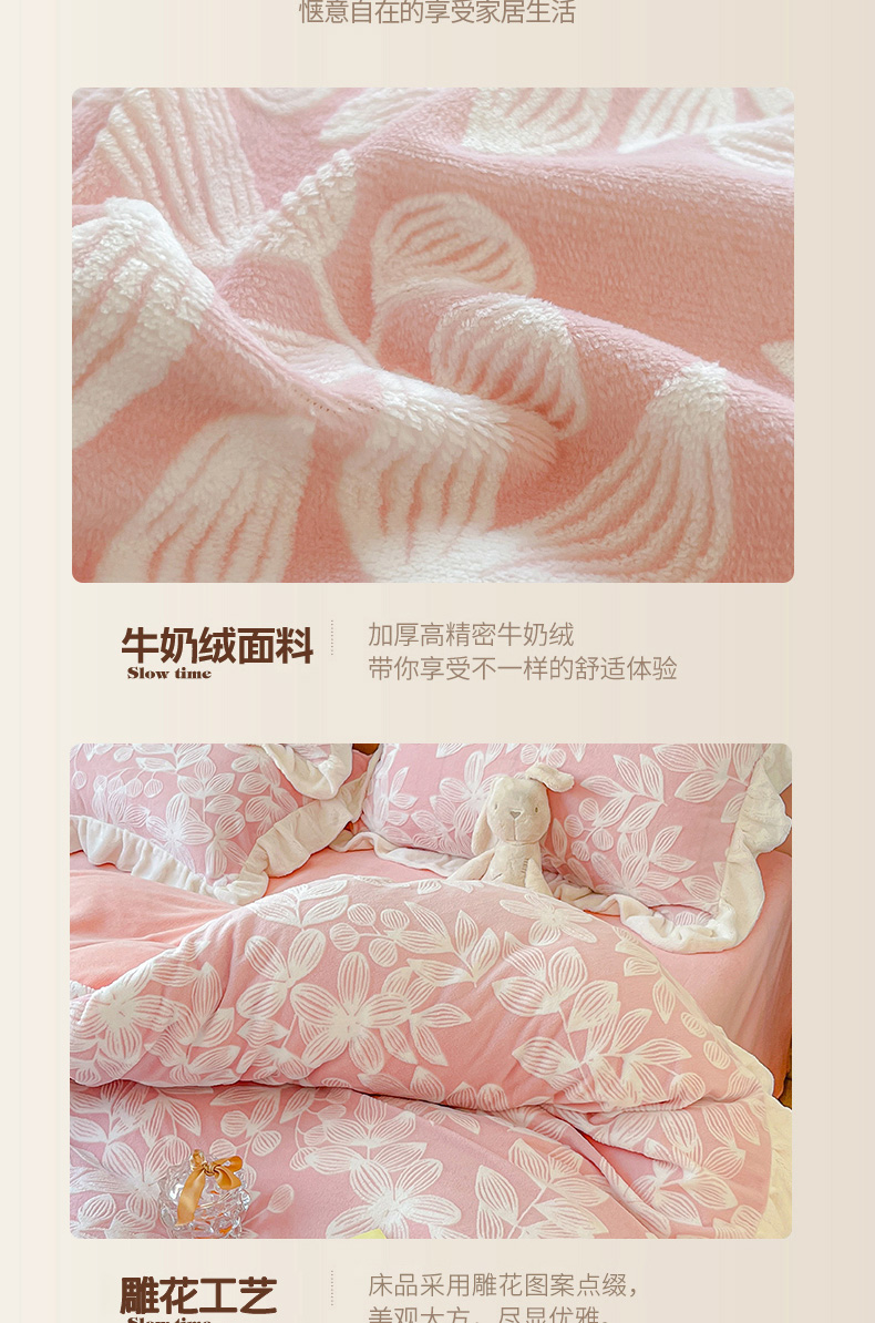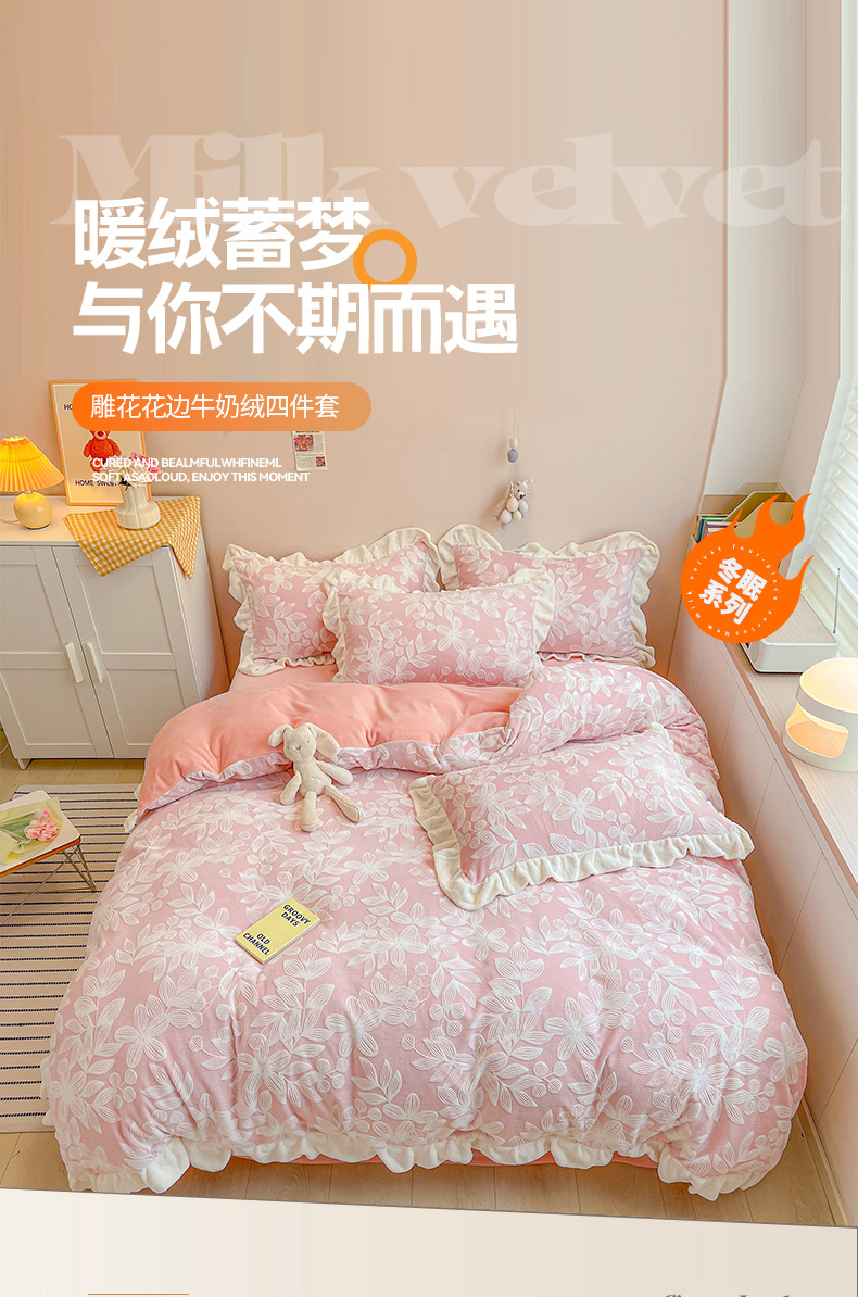 当前位置: 91家纺网 > 商品网购 > 床品套件 > 四件套 > 牛奶绒四件套 > 琪格格纺织 2025新款全消光小清新花边款雕花牛奶绒四件套 雕花绒花边-爱在秋冬樱花粉