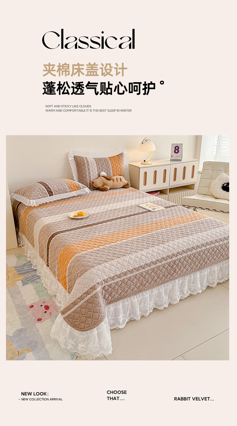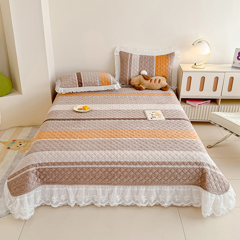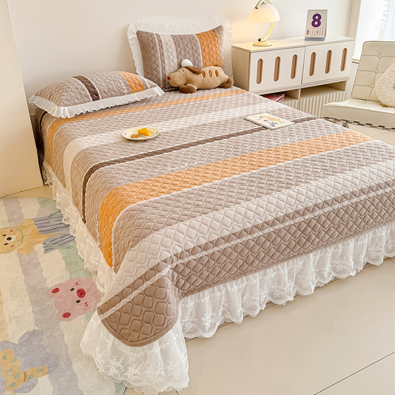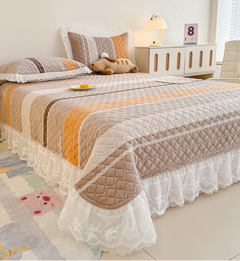 冬然家纺 2025新款高克重牛奶绒蕾丝花边床盖系列 经典条纹
