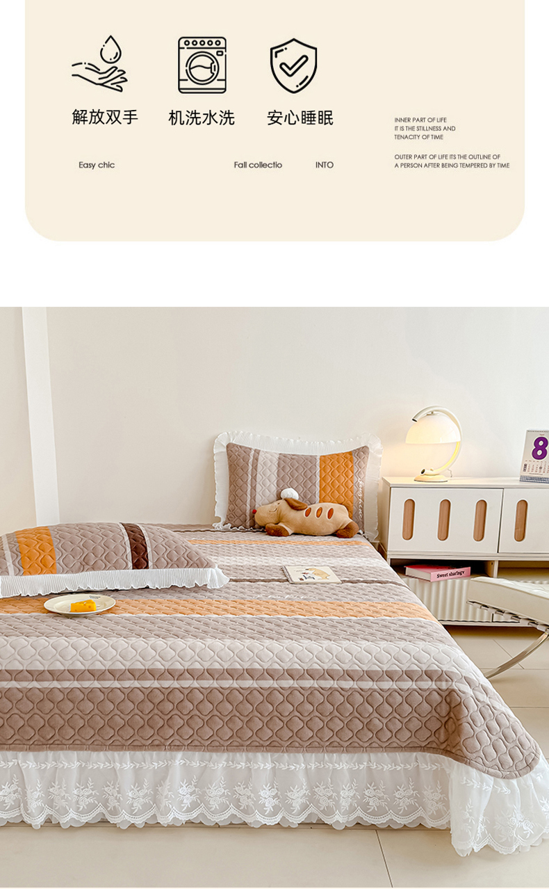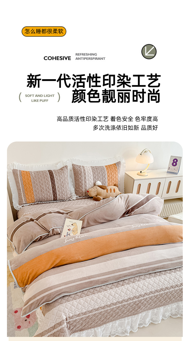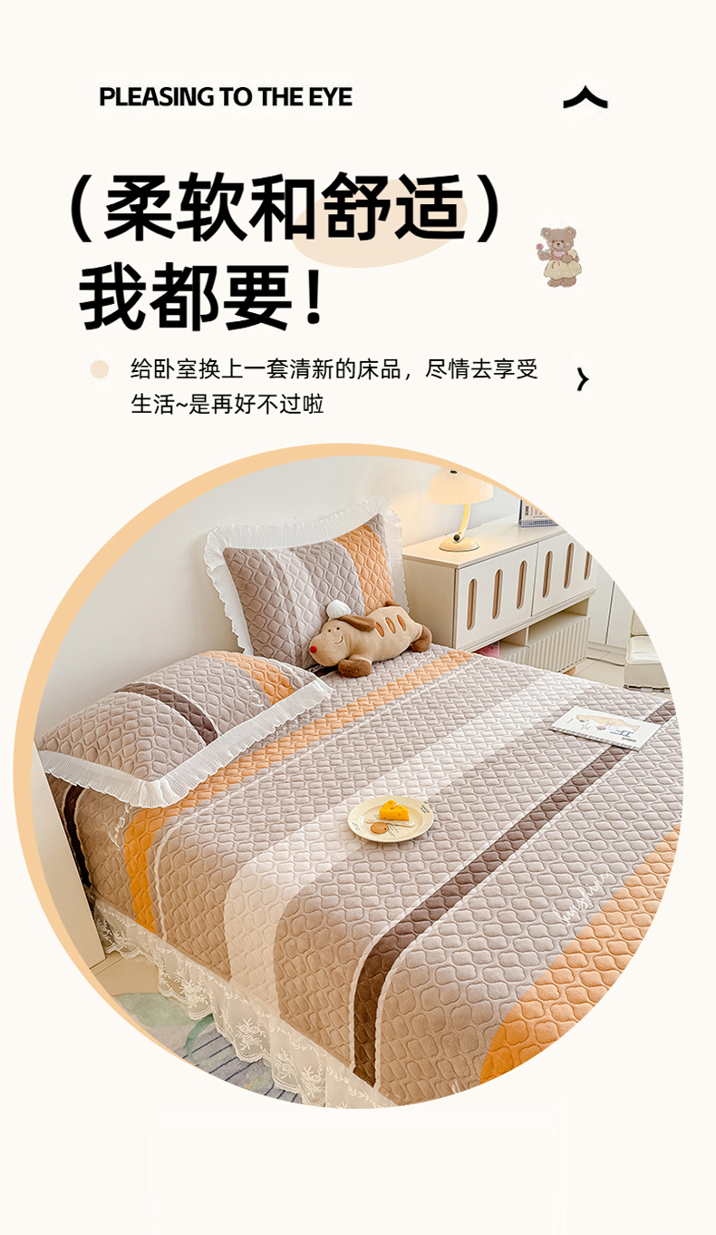 冬然家纺 2025新款高克重牛奶绒蕾丝花边床盖系列 经典条纹