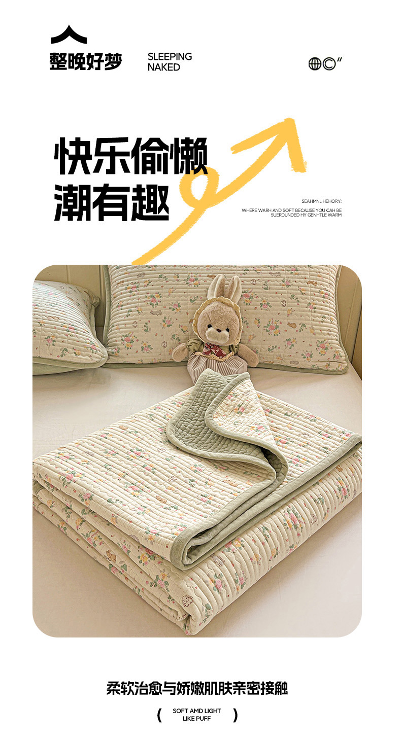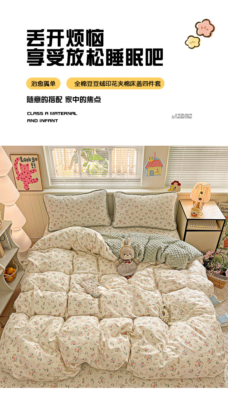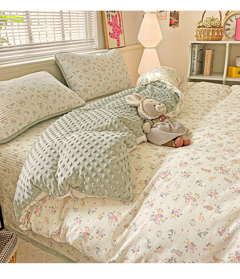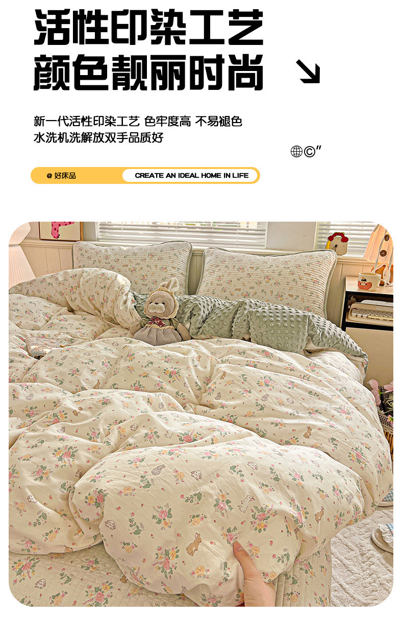 漫时光 2025新款正面纯棉反面宝宝绒印花夹棉砂洗床盖四件套 花园兔