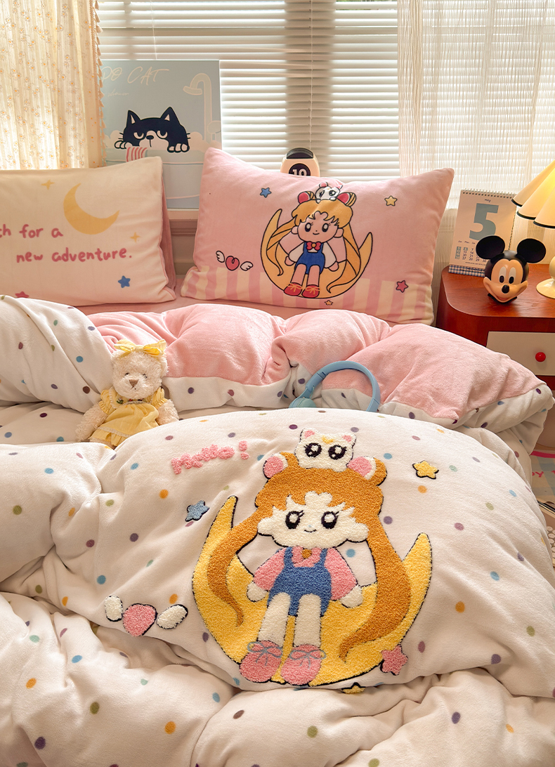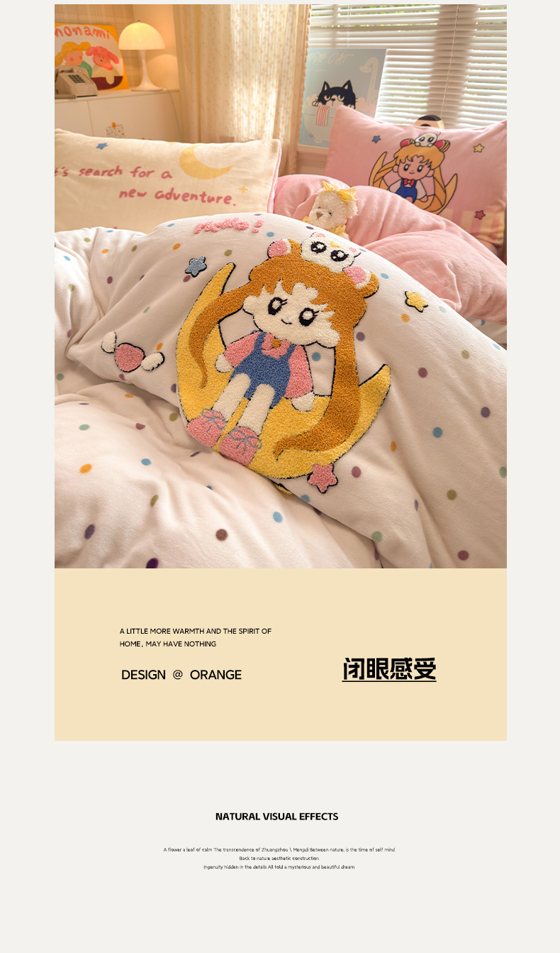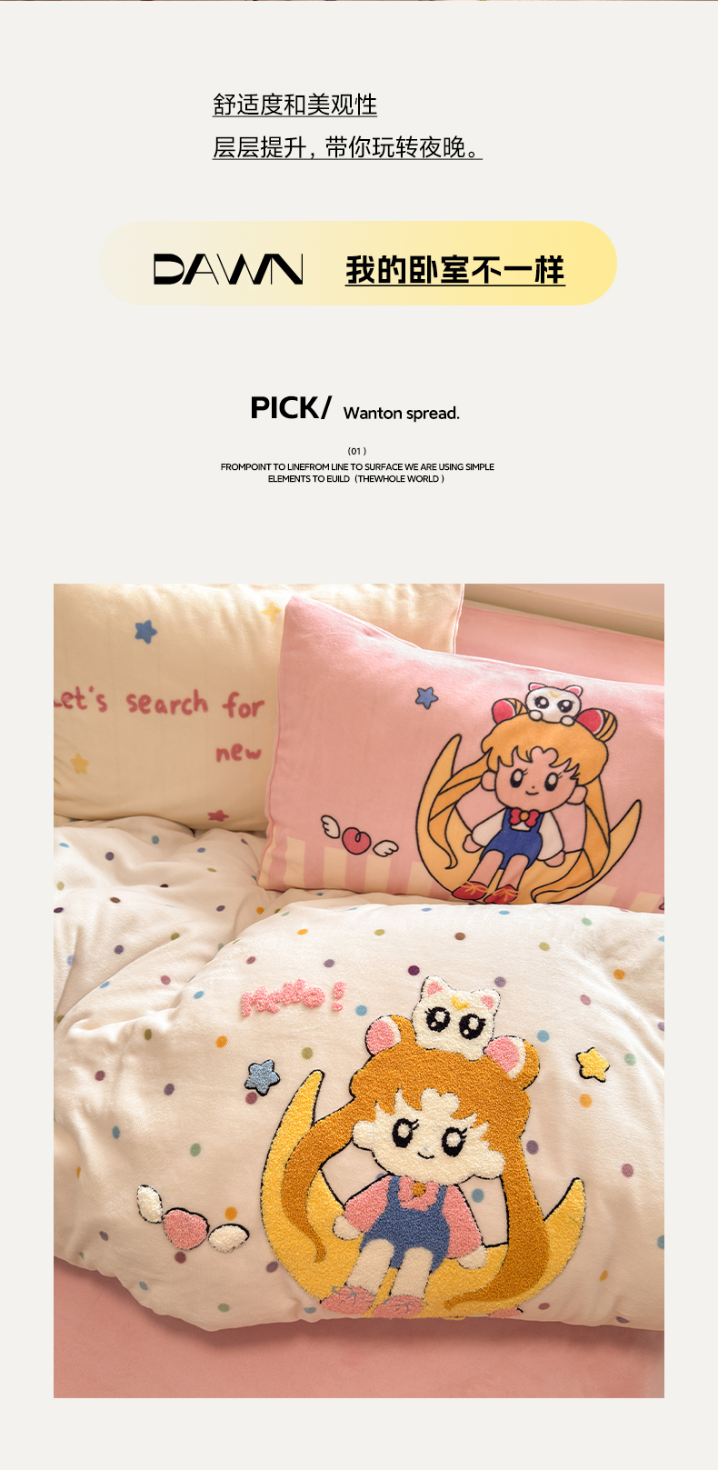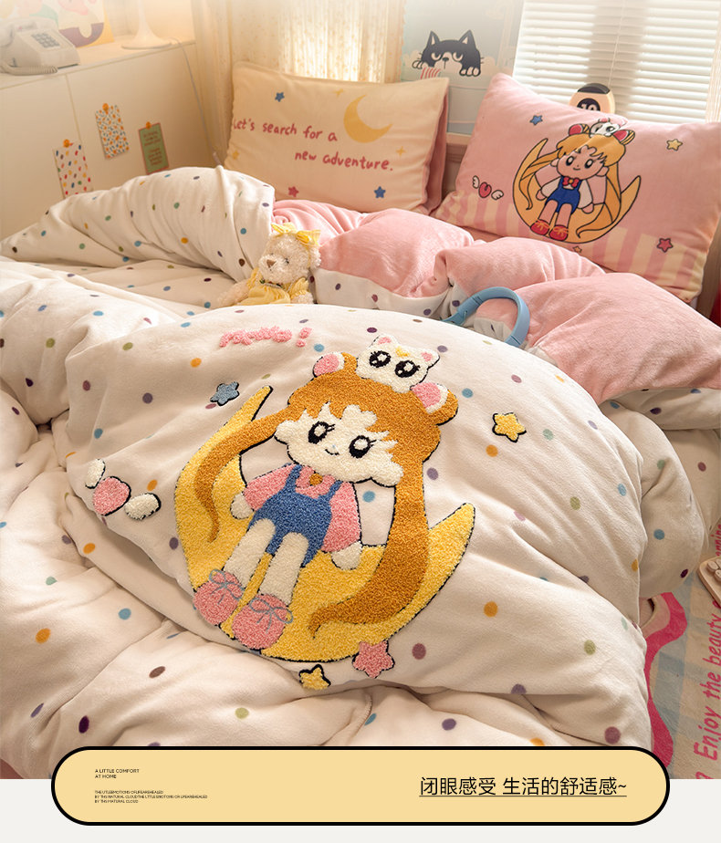 当前位置: 91家纺网 > 商品网购 > 床品套件 > 四件套 > 牛奶绒四件套 > 罗亿家纺 2025新款高克重200g牛奶绒数码印花毛巾绣卡通四件套(小红书推荐)提供买家秀 月光美少女