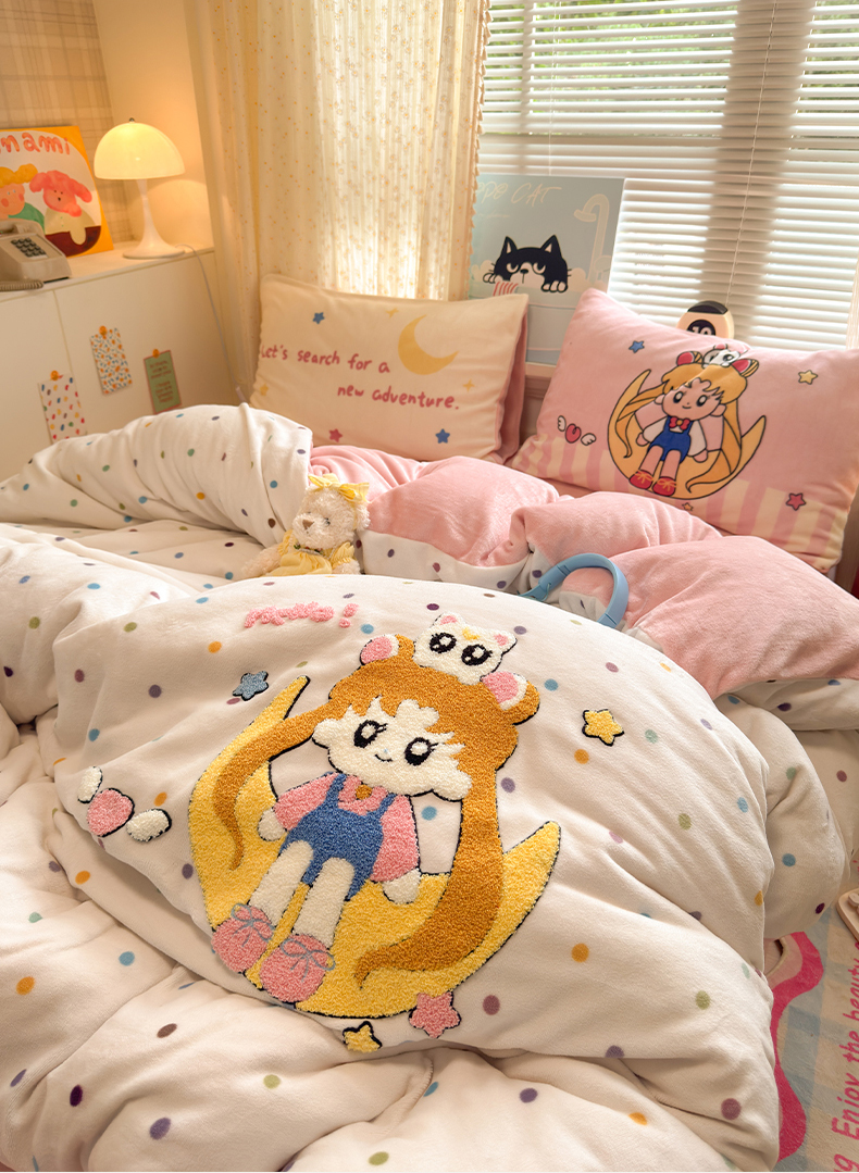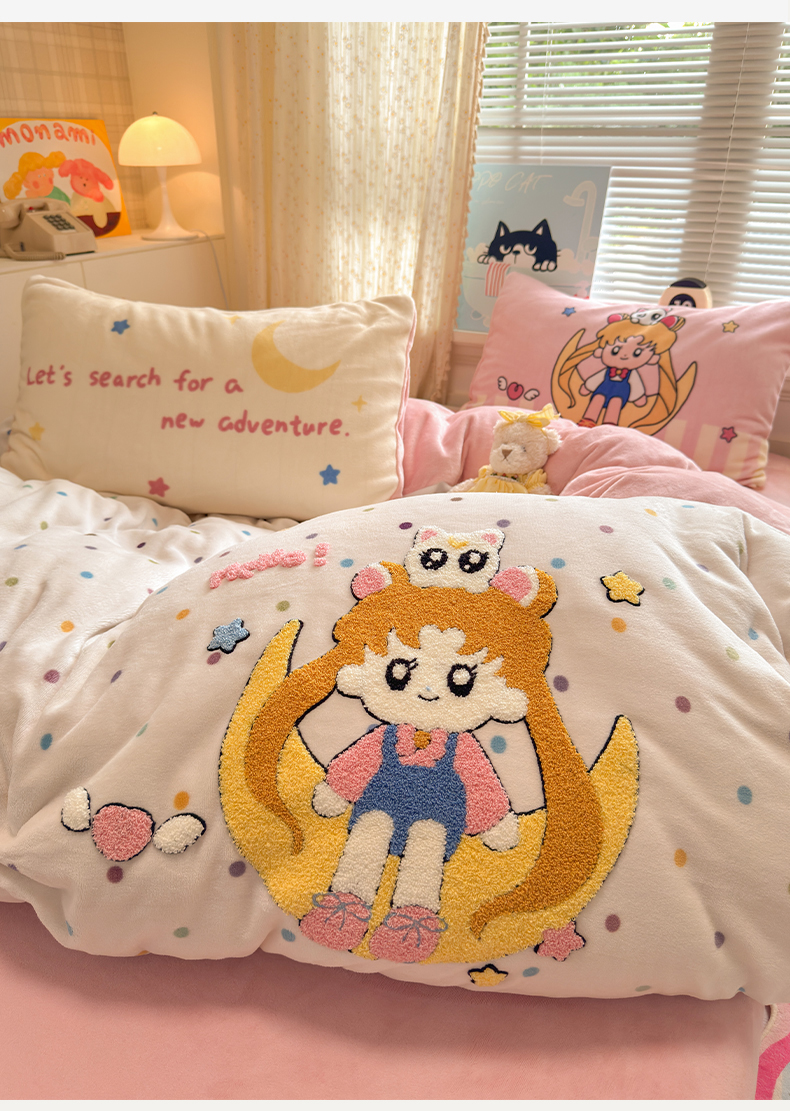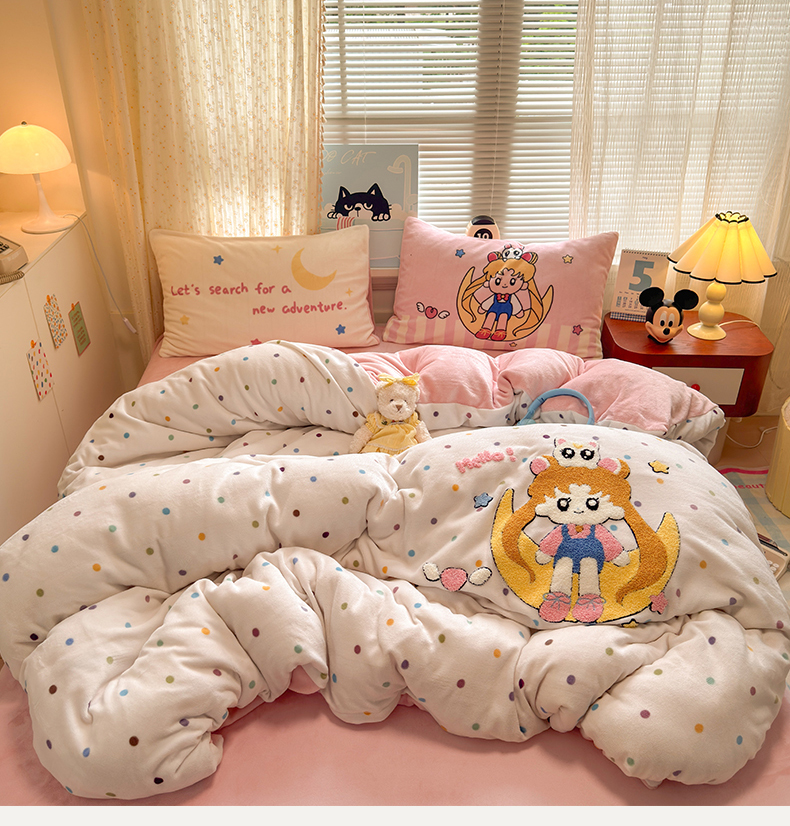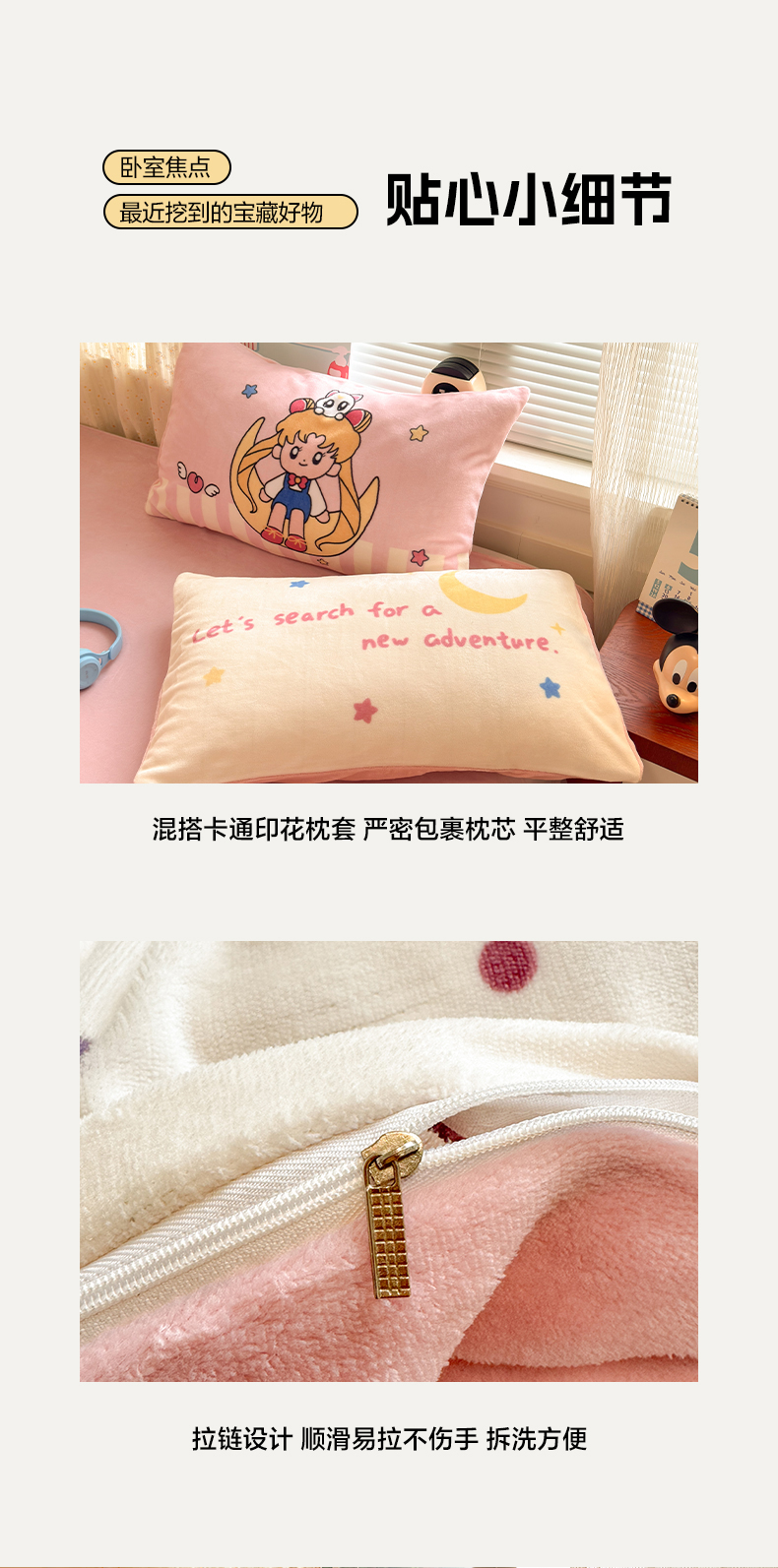 当前位置: 91家纺网 > 商品网购 > 床品套件 > 四件套 > 牛奶绒四件套 > 罗亿家纺 2025新款高克重200g牛奶绒数码印花毛巾绣卡通四件套(小红书推荐)提供买家秀 月光美少女
