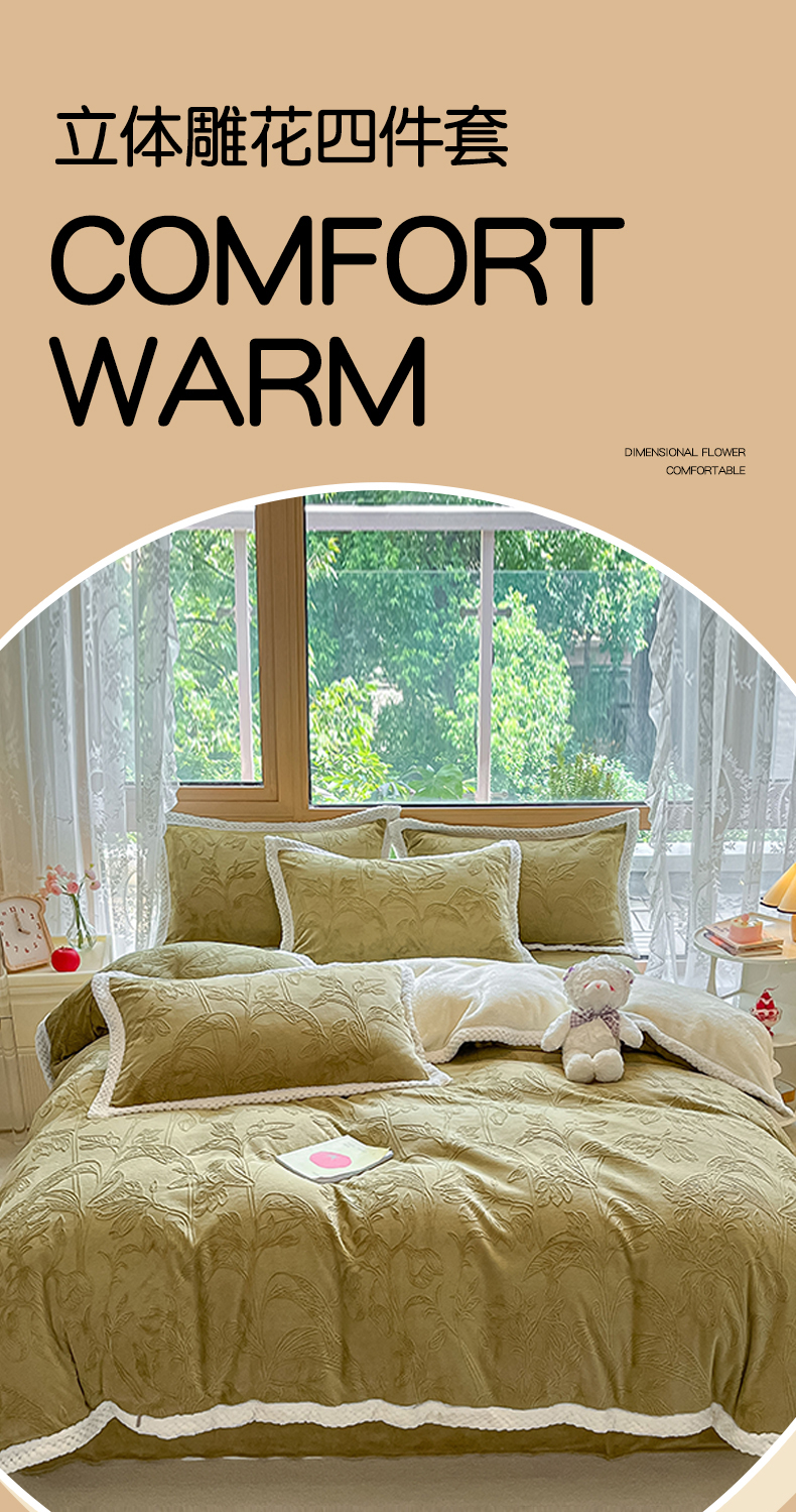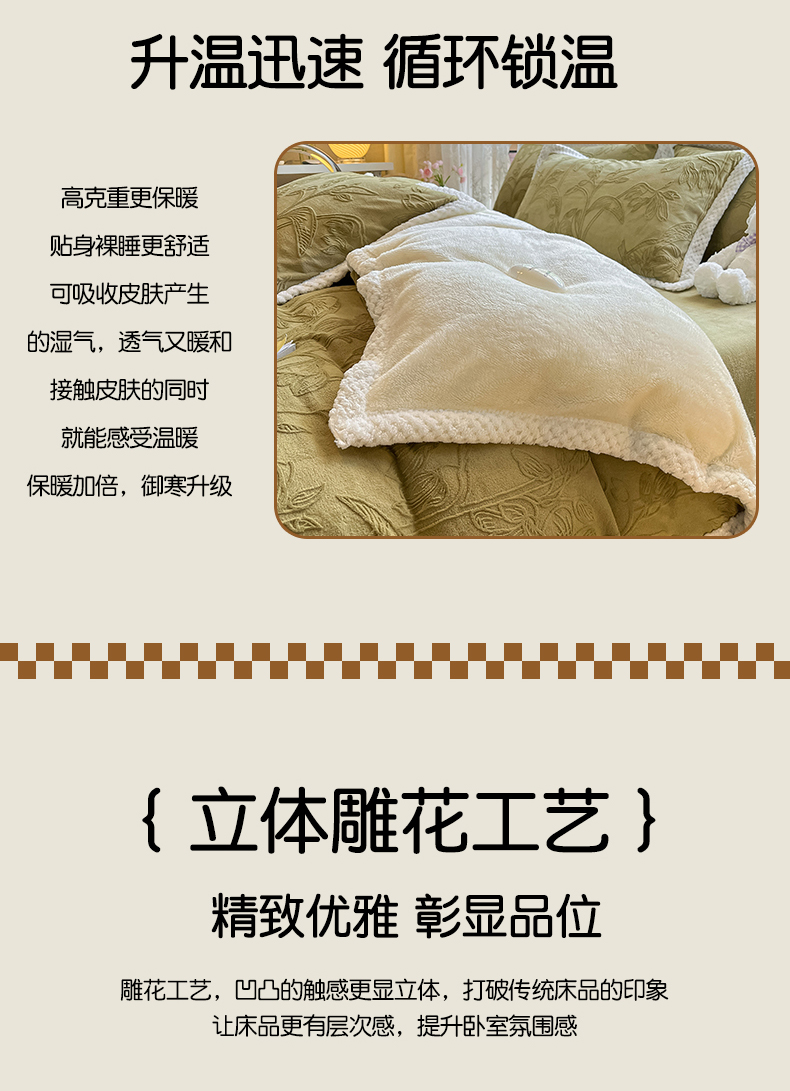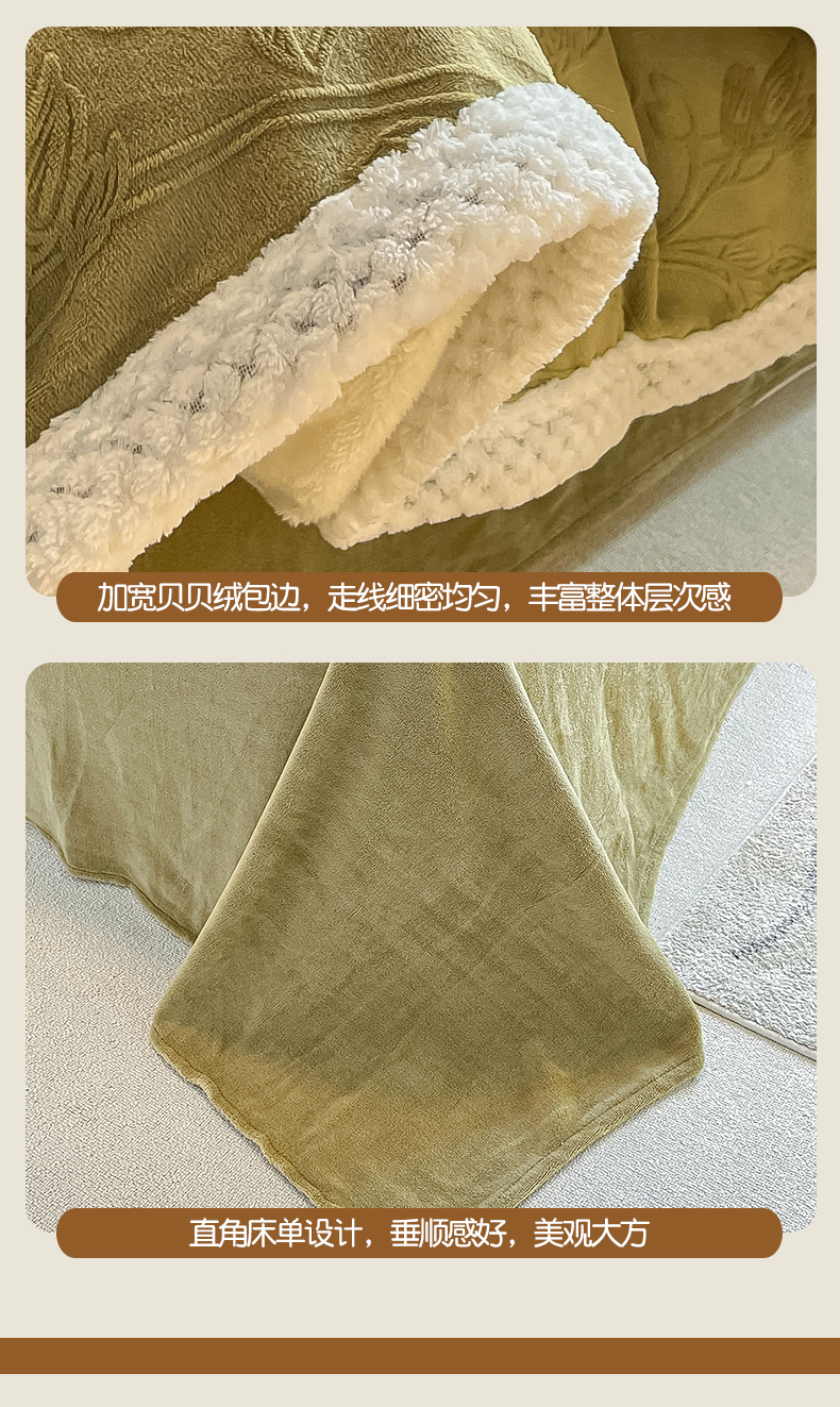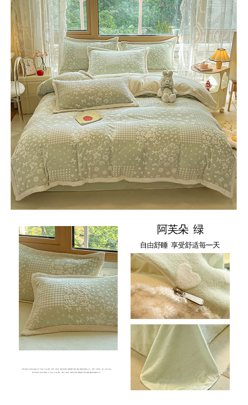 当前位置: 91家纺网 > 商品网购 > 床品套件 > 四件套 > 其它四件套 > 琪格格纺织 2025新款全消光包边立体简约清新雕花绒四件套 雕花包边- 枝枝叶叶 海棠绿