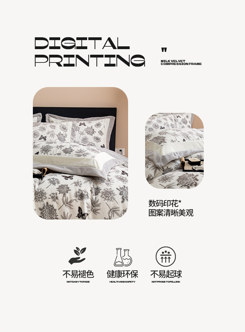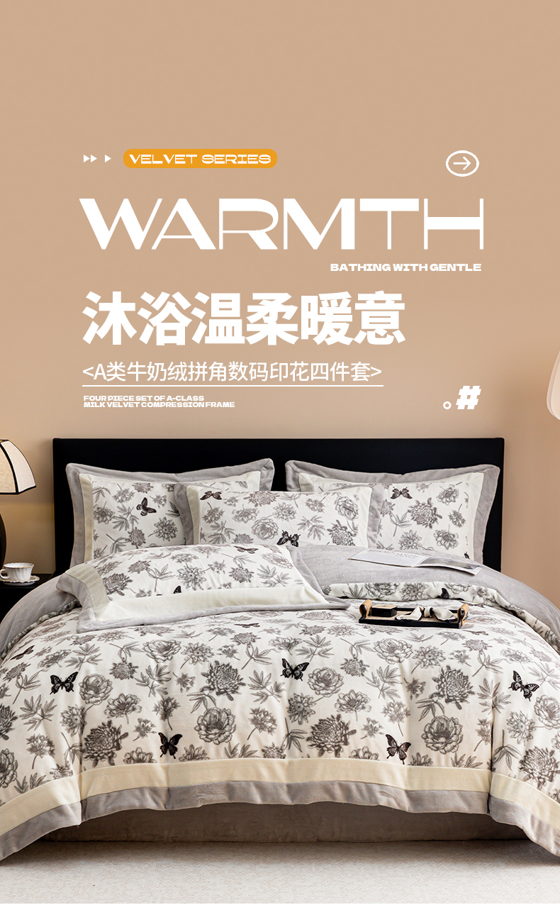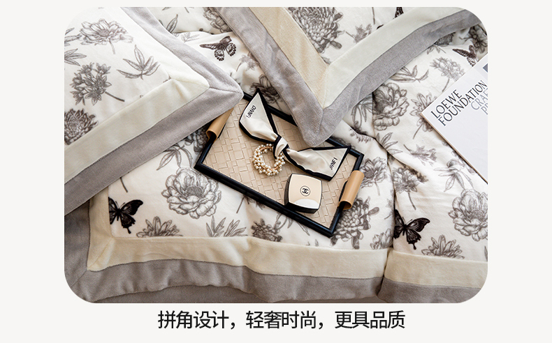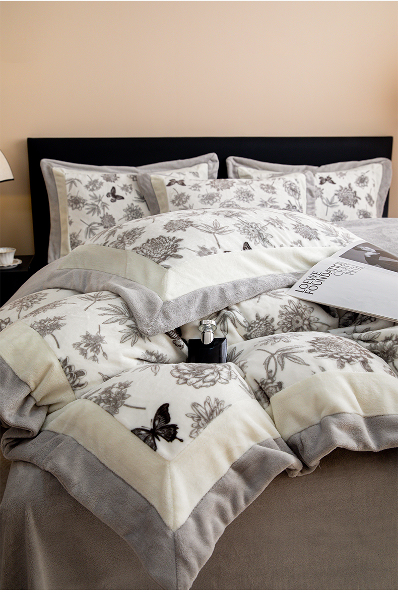 商品名称:懒猫家纺 2025新款牛奶绒拼角印花轻奢风四件套 浪漫花蝶-灰