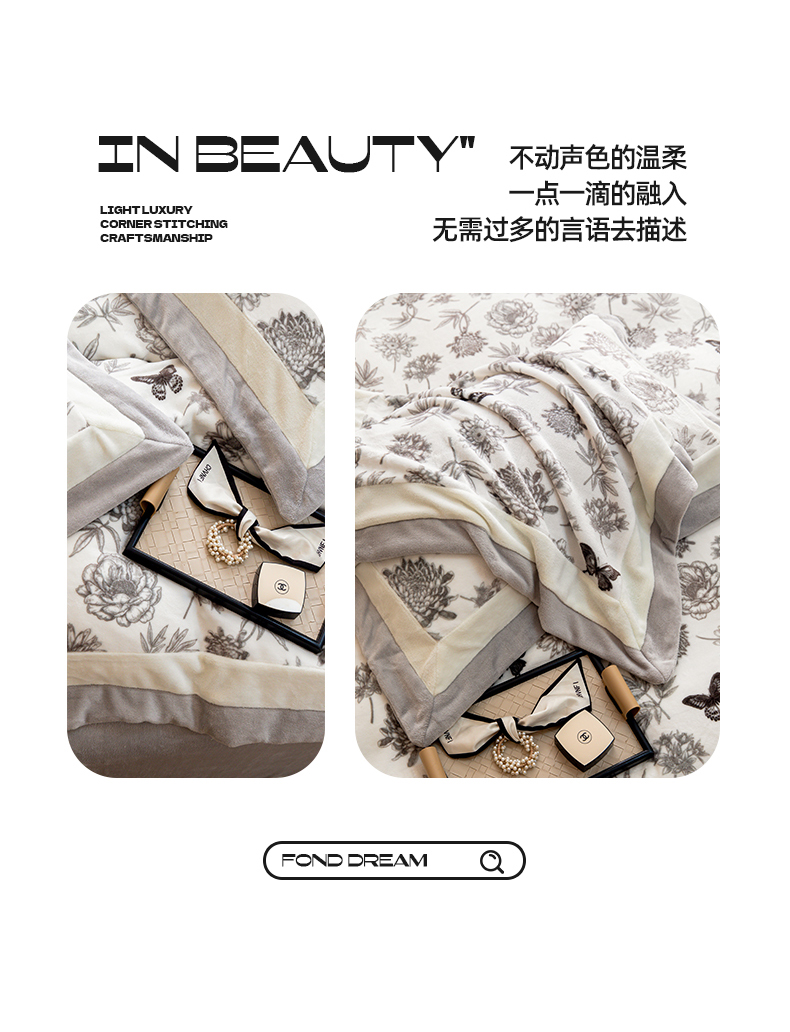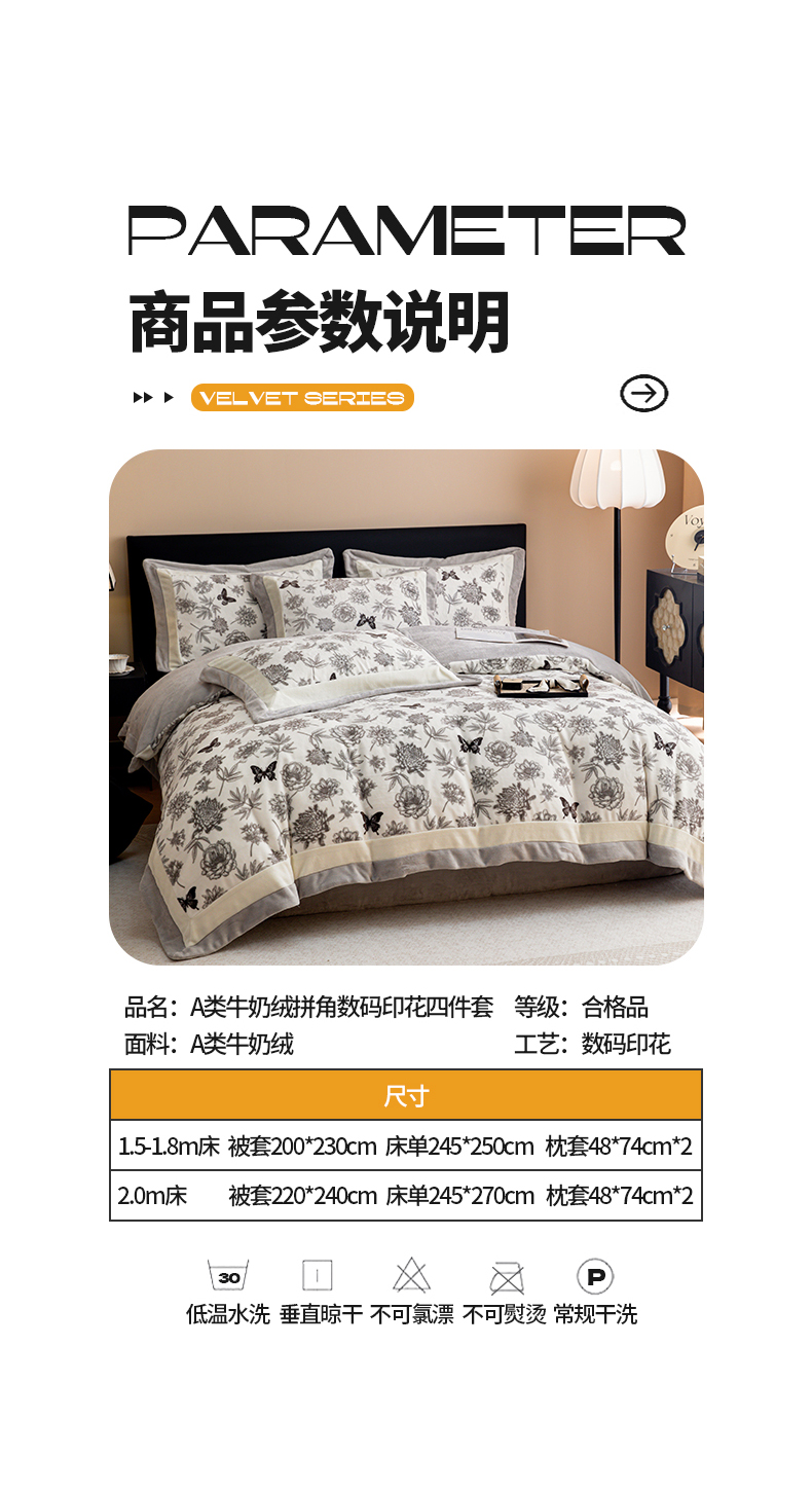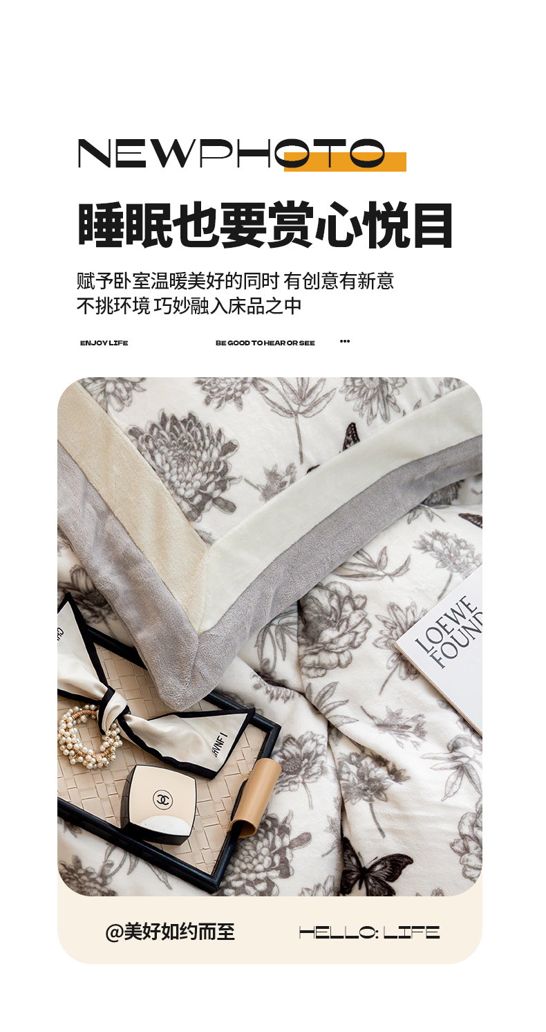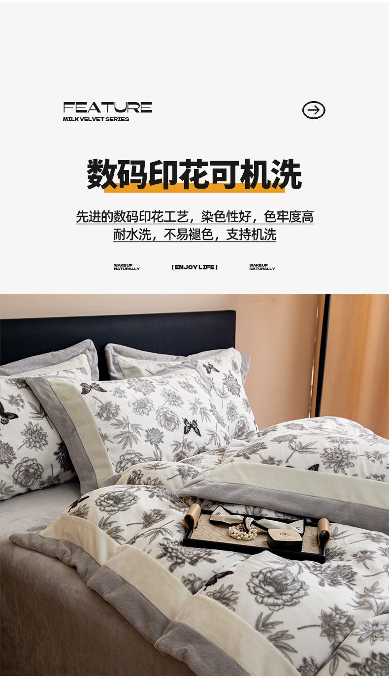 商品名称:懒猫家纺 2025新款牛奶绒拼角印花轻奢风四件套 浪漫花蝶-灰