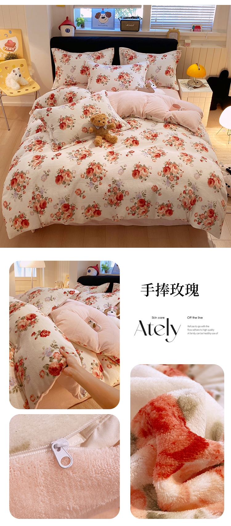 商品名称:佰亿莱 2025直播新款印花小清新法莱绒牛奶绒四件套手捧玫瑰