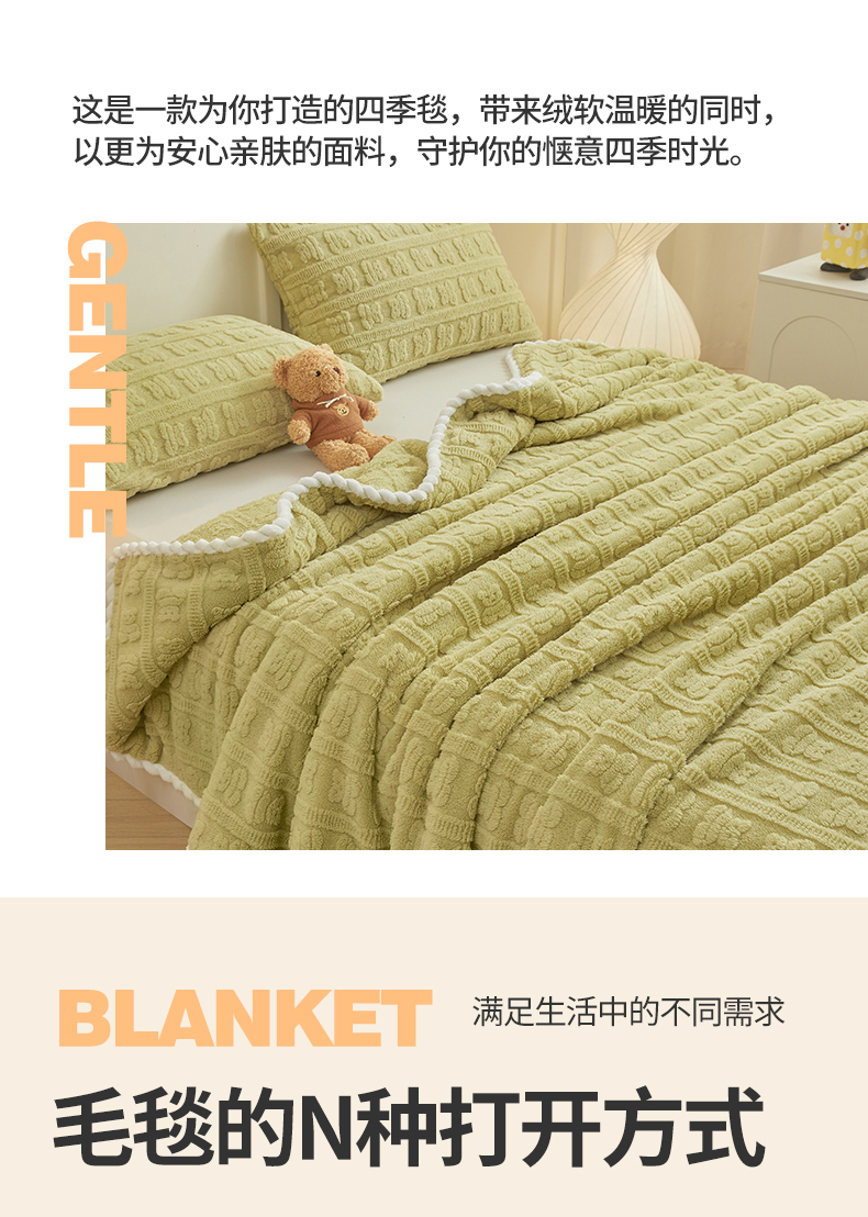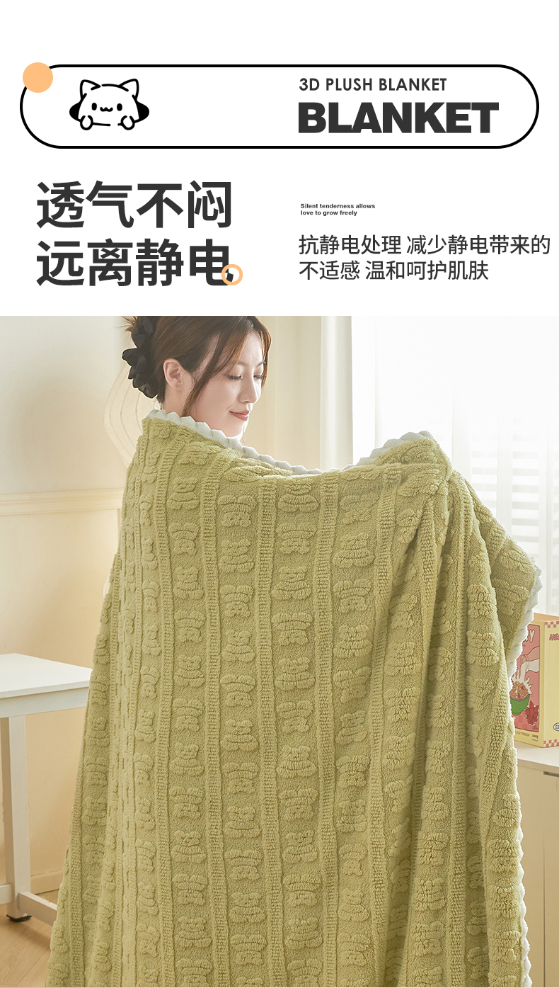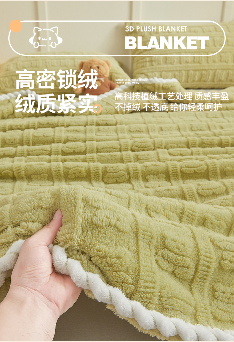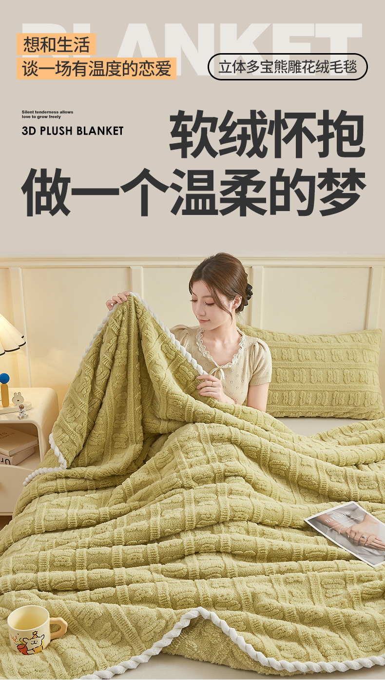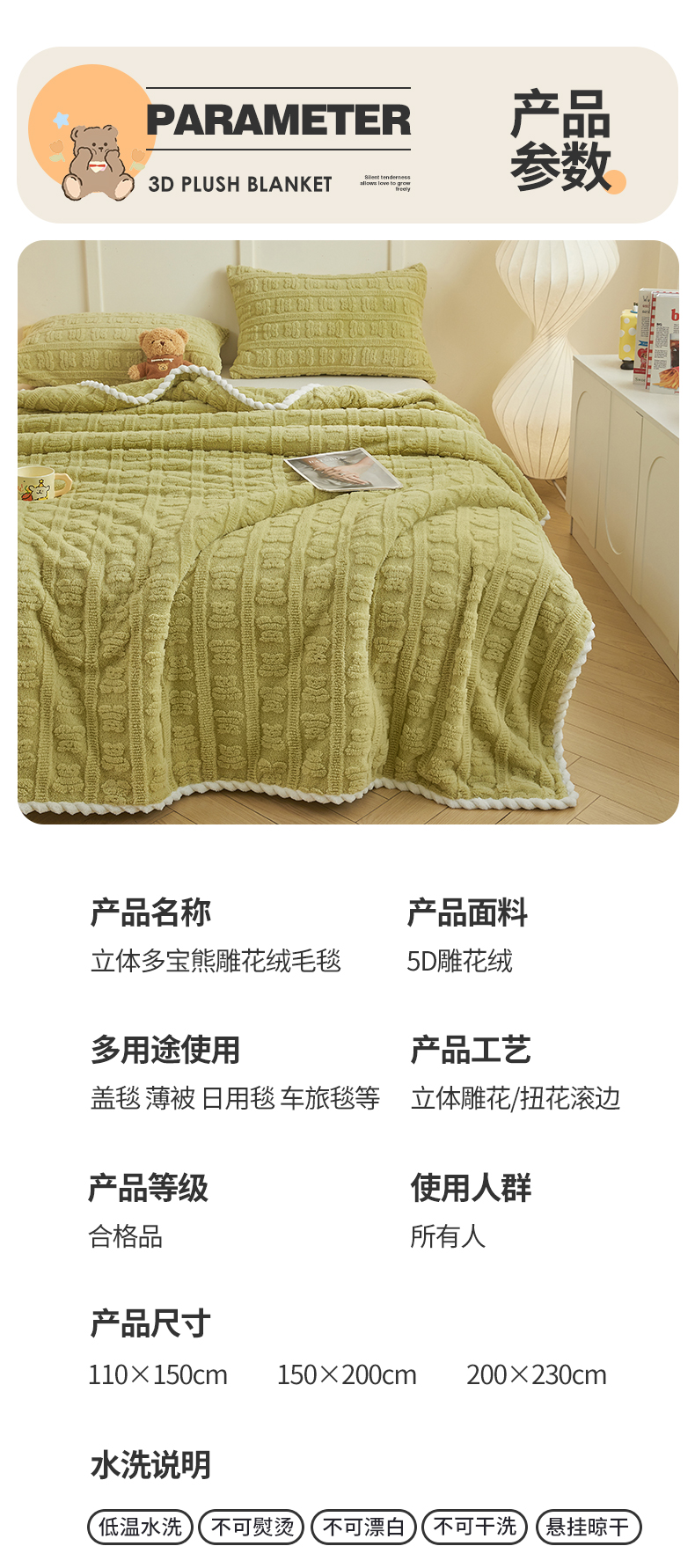 商品名称:世纪绒品 2025新款A类立体牛奶绒雕花绒单层毛毯毯子-多宝熊 多宝熊 果绿