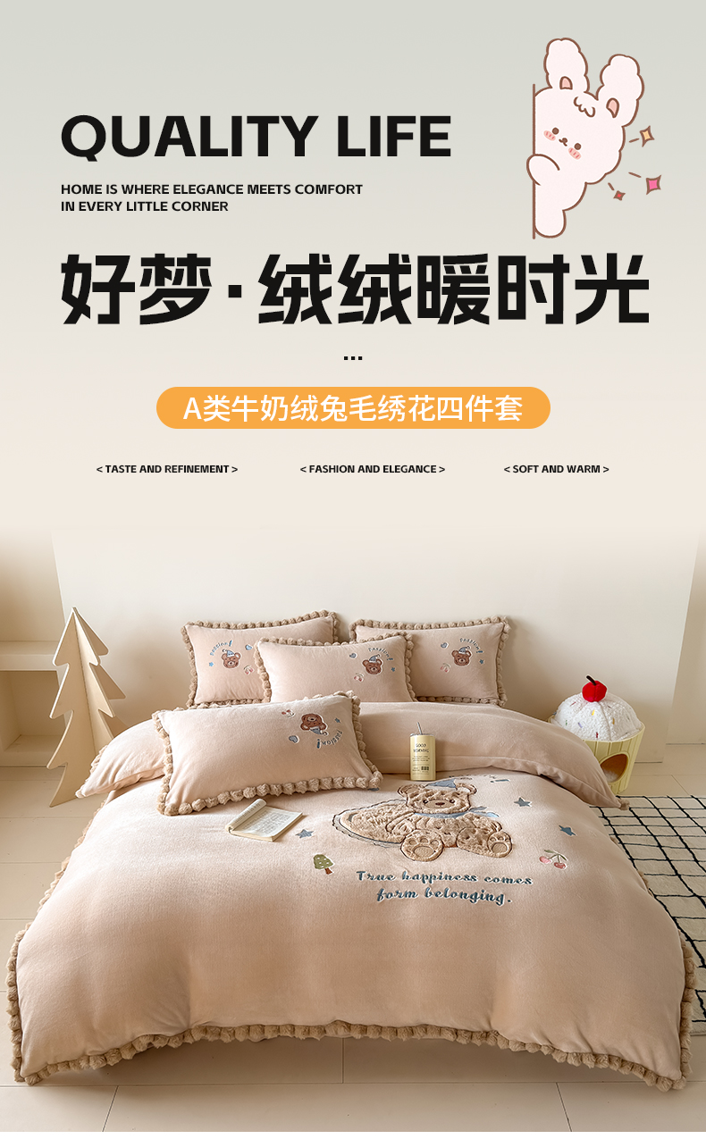 商品名称:卡罗兰 2025新款牛奶绒兔毛绣花四件套 爱心熊-紫