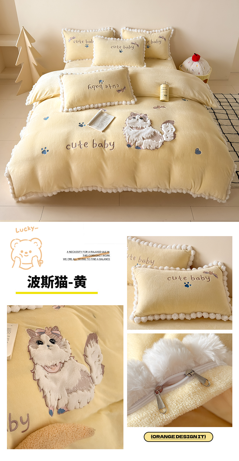 (总)卡罗兰 2025新款牛奶绒兔毛绣花四件套,波斯猫-黄,波斯猫-粉,爱心熊-灰,爱心熊-紫,波斯猫-紫,波斯猫-蓝
