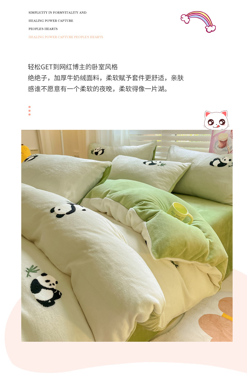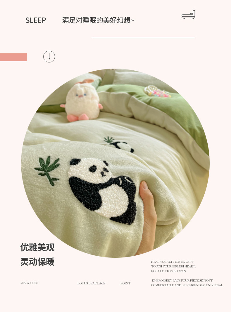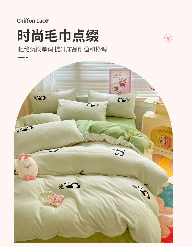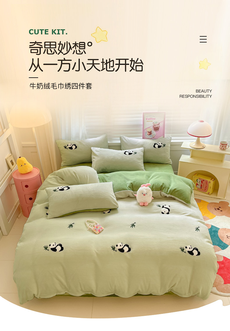 当前位置: 91家纺网 > 商品网购 > 床品套件 > 四件套 > 牛奶绒四件套 > 丽涵家纺 2025秋冬新品210克牛奶绒毛巾绣四件套卡通绣花学生床笠三件套 呆萌熊猫-巩绿