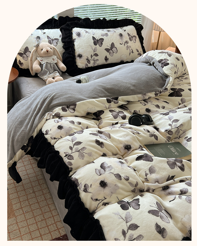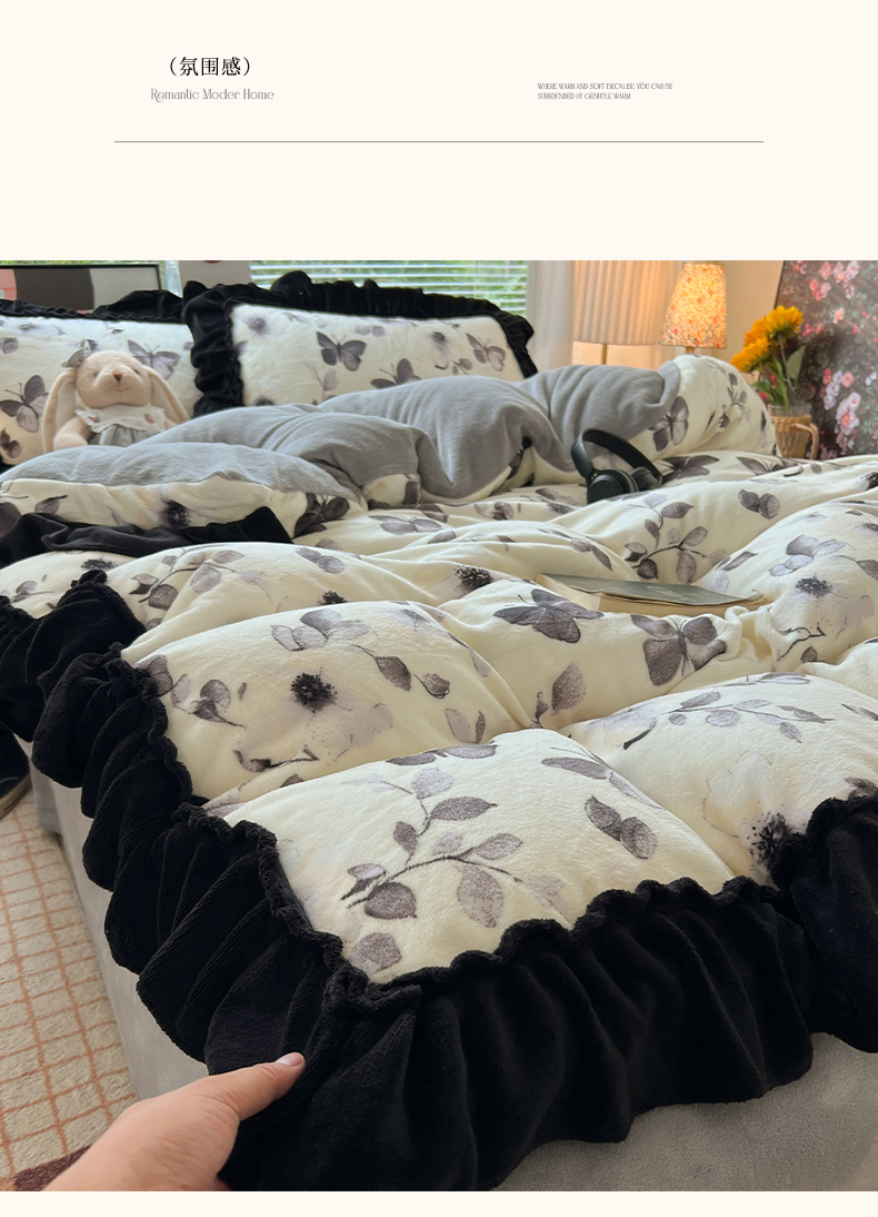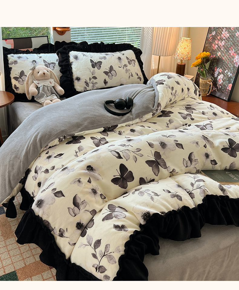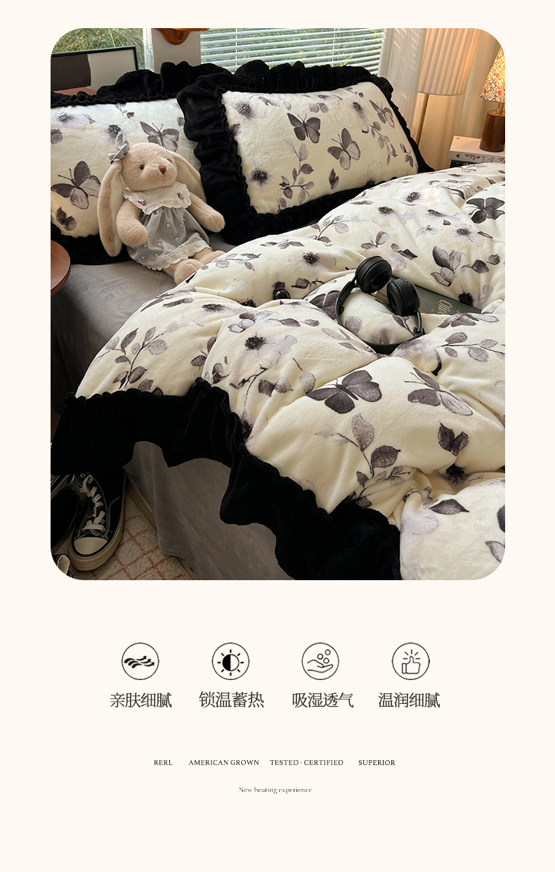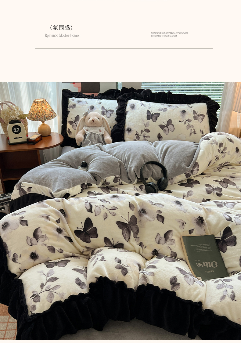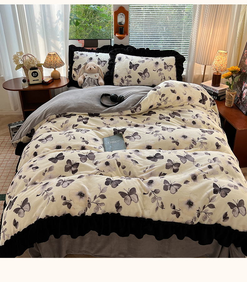 当前位置: 91家纺网 > 商品网购 > 床品套件 > 四件套 > 牛奶绒四件套 > 韩都家居 2025新款法式花边印花牛奶绒四件套 画蝶