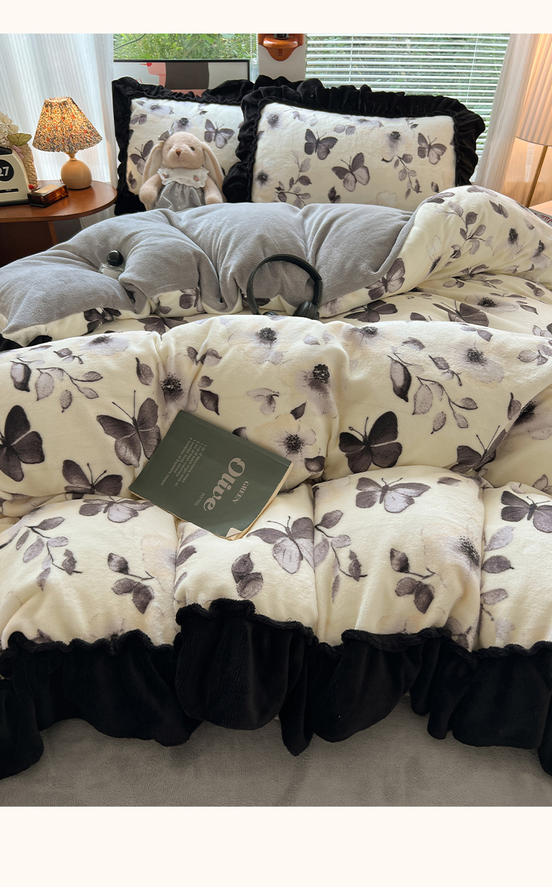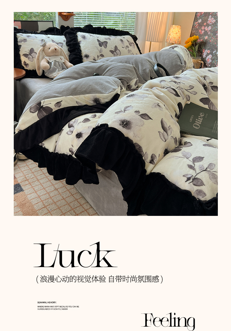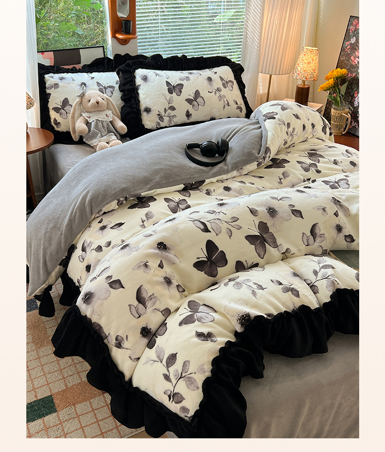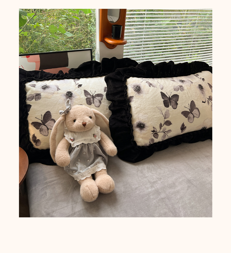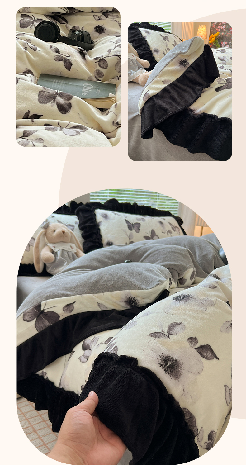 当前位置: 91家纺网 > 商品网购 > 床品套件 > 四件套 > 牛奶绒四件套 > 韩都家居 2025新款法式花边印花牛奶绒四件套 画蝶