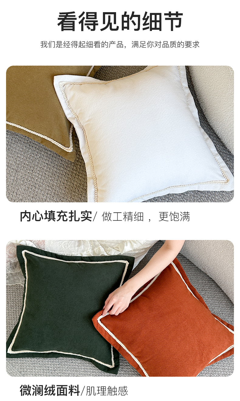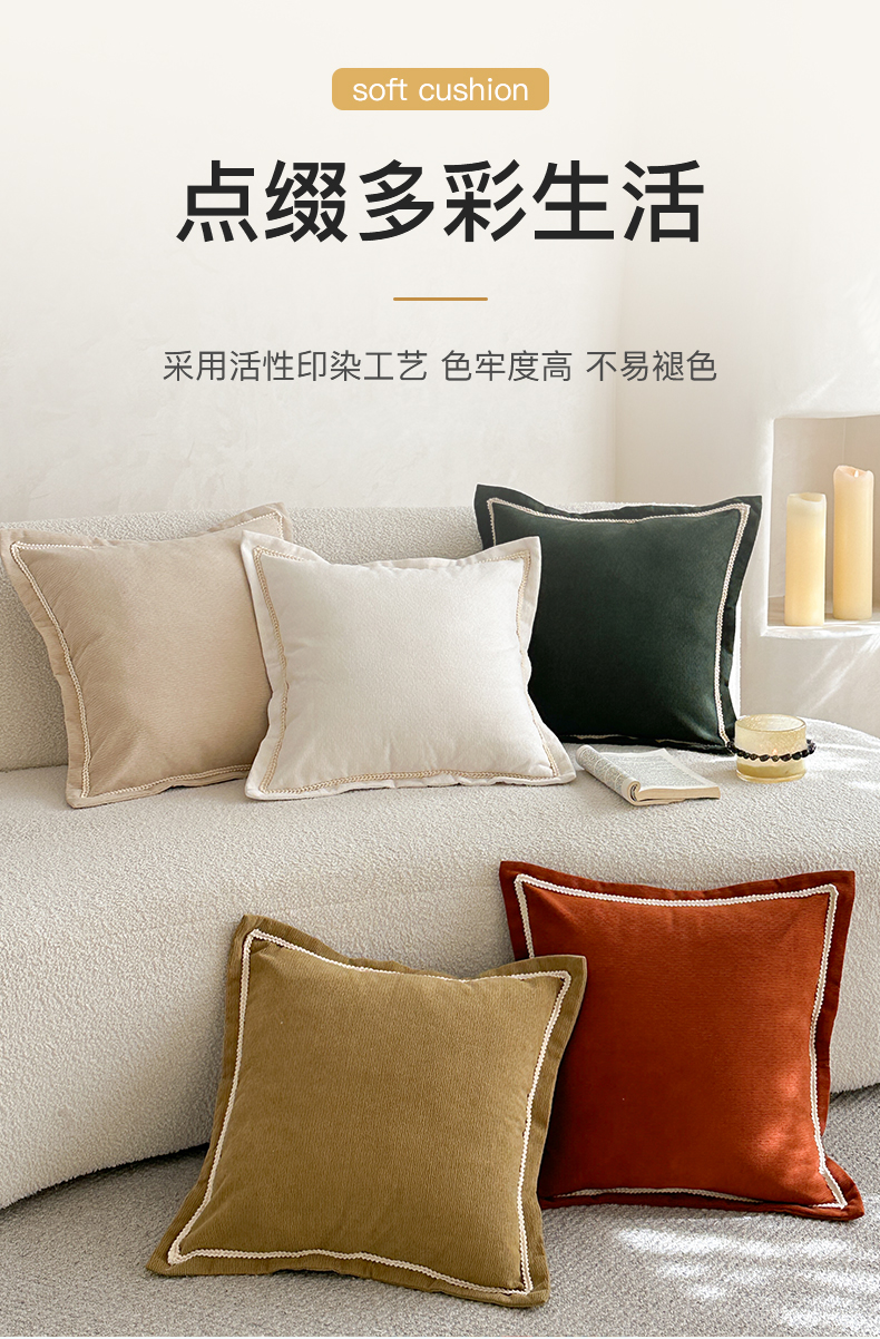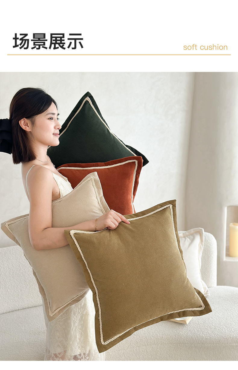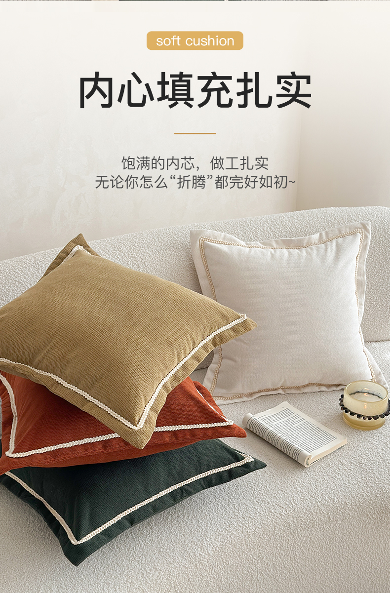 (总)美茉家居 2025新款加厚高端沙发布雪尼尔滚边方枕抱枕,缎面红,孔雀绿,南瓜橘,烟雨灰,珍珠白