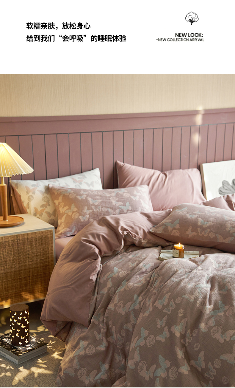 宜代光年 2025新款彩色色织大提花纱布四件套 花枝棠-粉
