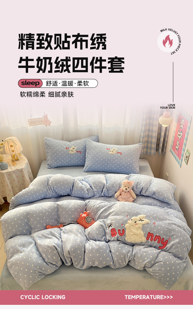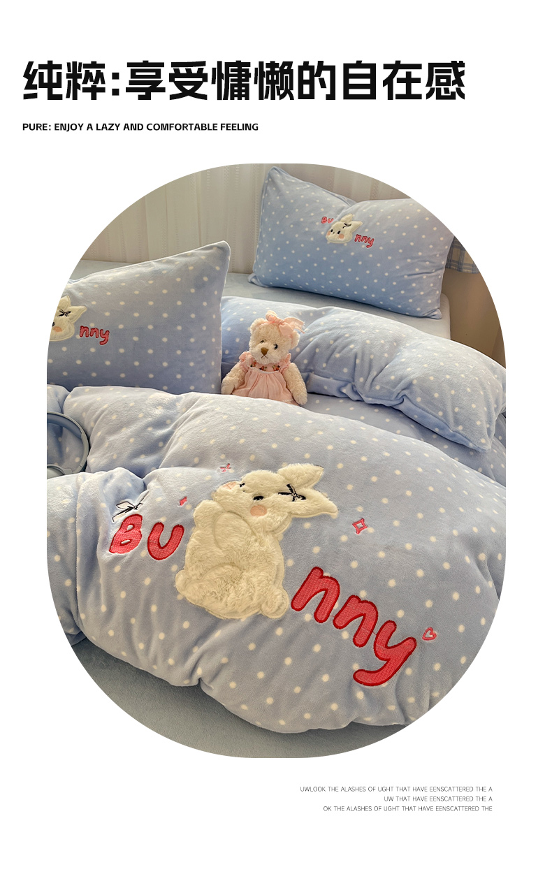 红嘴企鹅 2025新款精致贴布绣牛奶绒四件套 Bunny兔-蓝