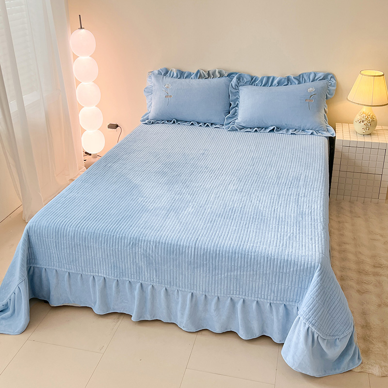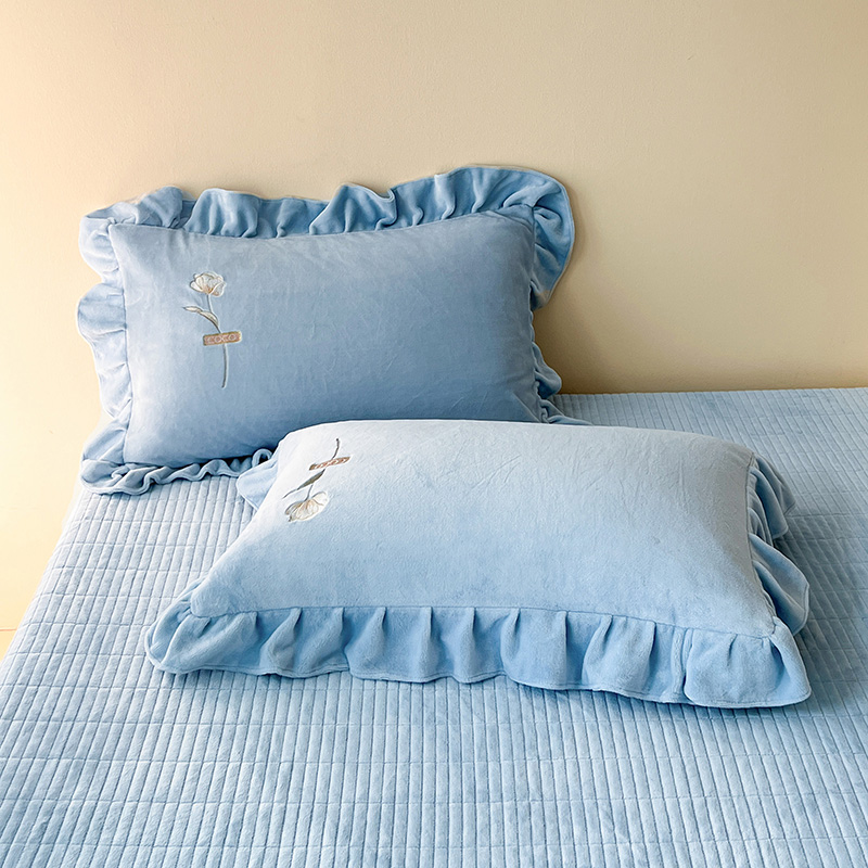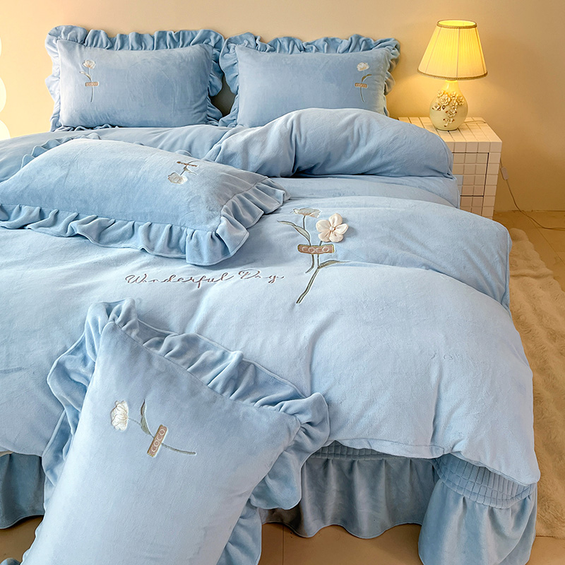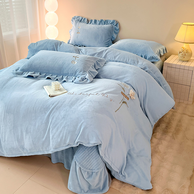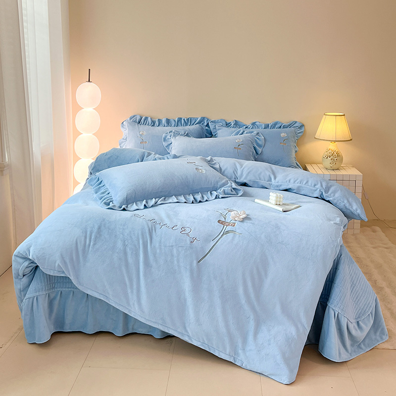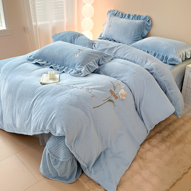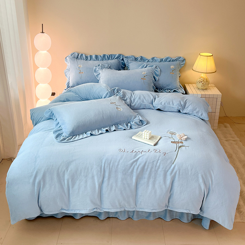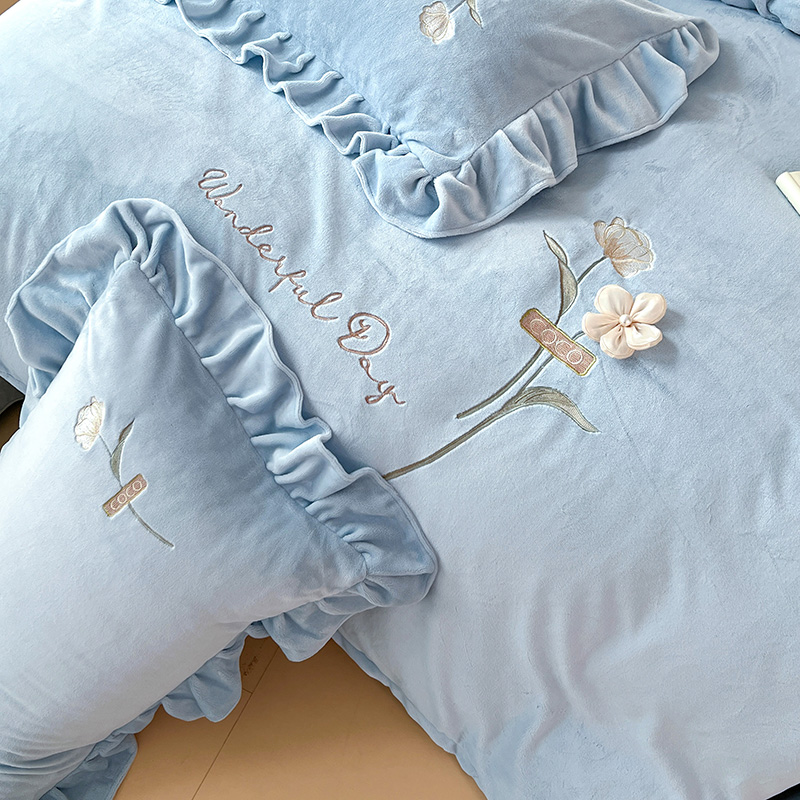 商品名称:梦莱斯 2025新款全消光床盖款牛奶绒刺绣四件套-山茶花 山茶花-天蓝