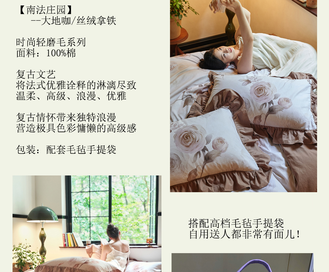 商品名称:曼布缇 2025秋冬新品100s全棉加厚磨毛工艺款四件套 南法庄园场景二 大地咖