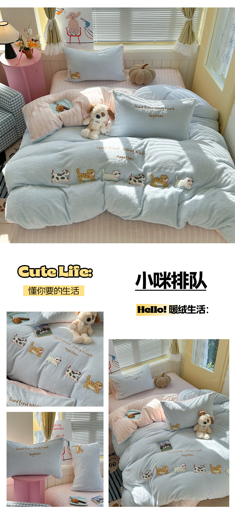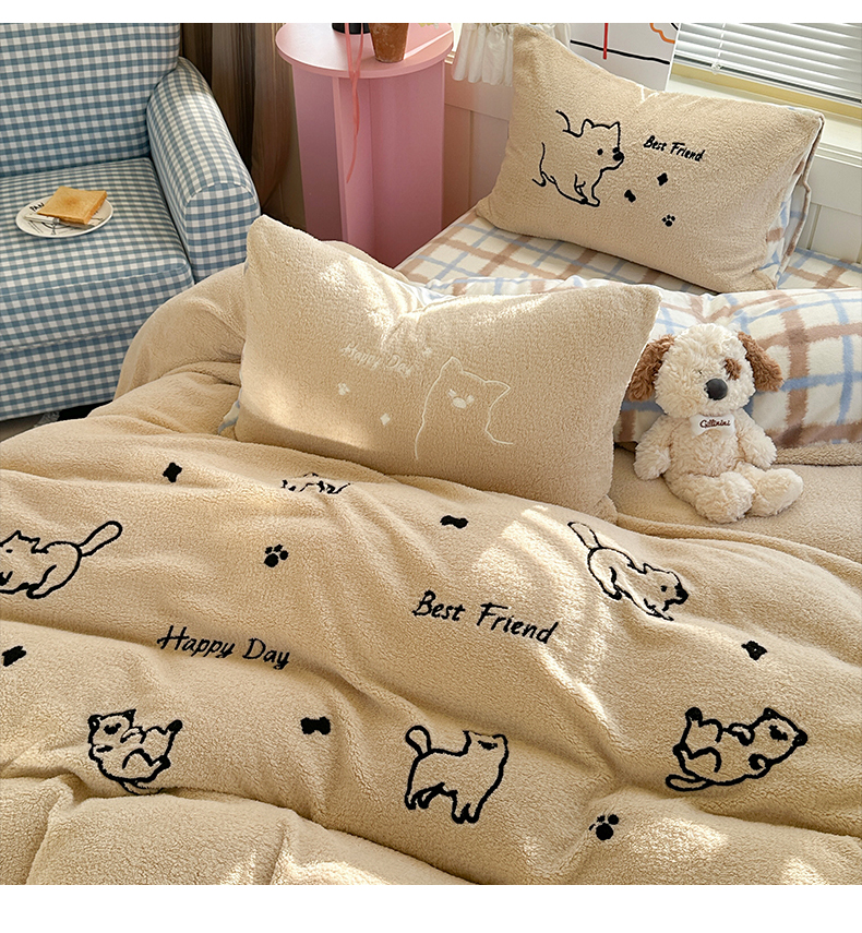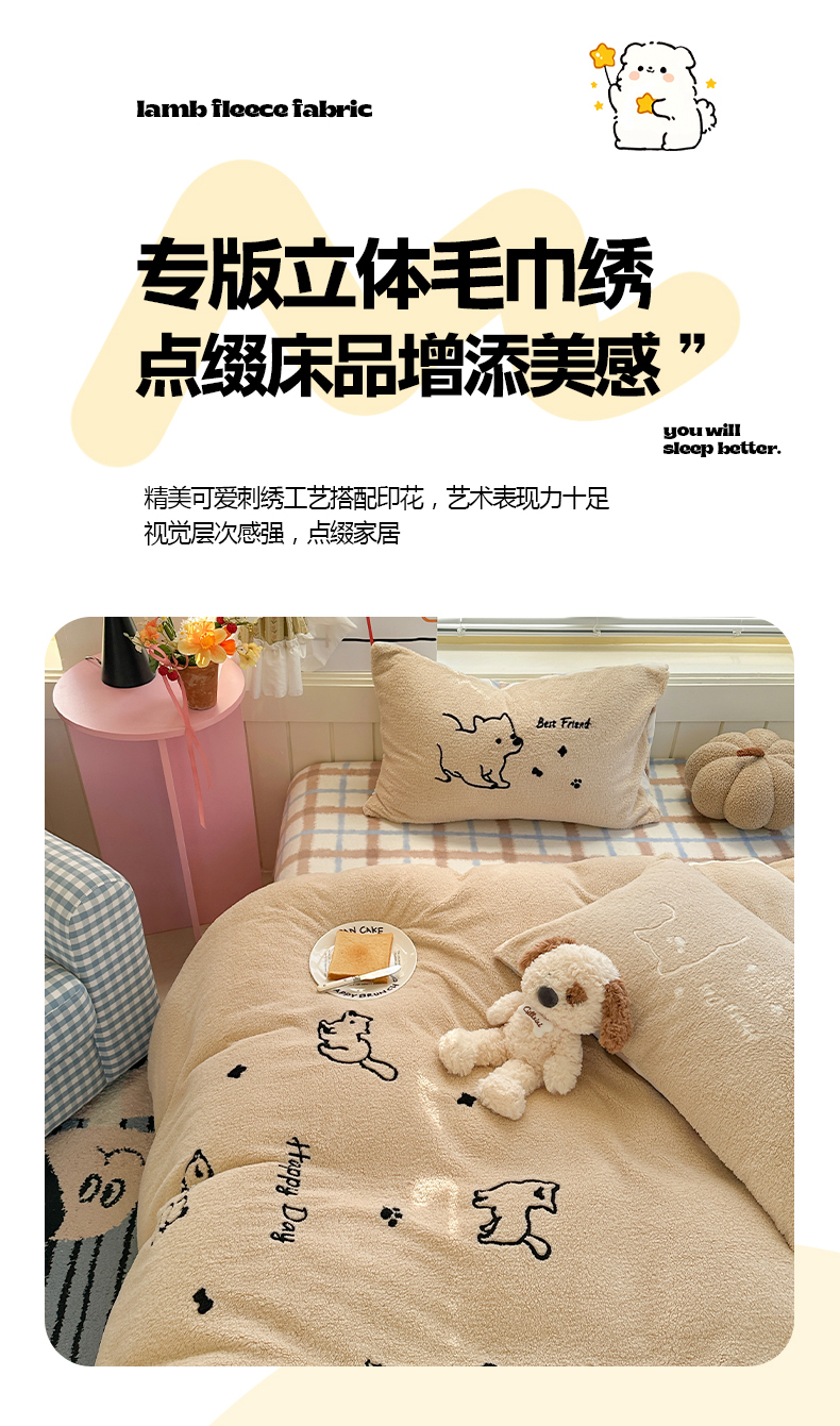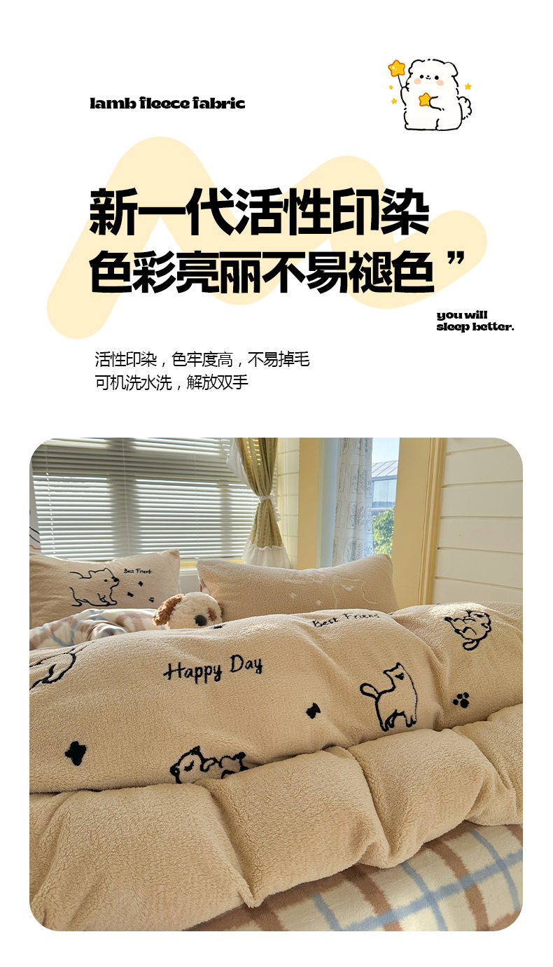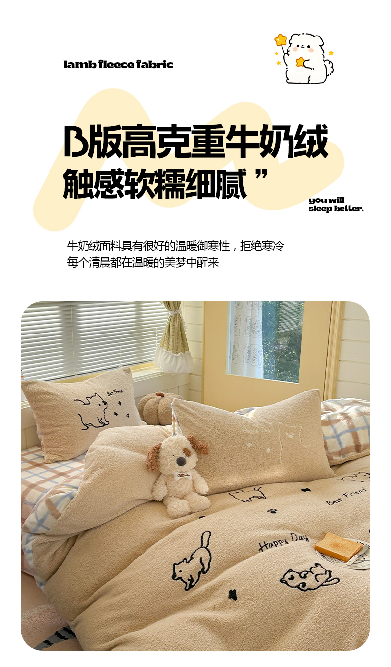 (总)暖生活 2025新款高克重细颗粒羊羔绒四件套,调皮小狗,灰色小象,毛绒小狗,甜点玩偶,小咪排队,幸福小窝
