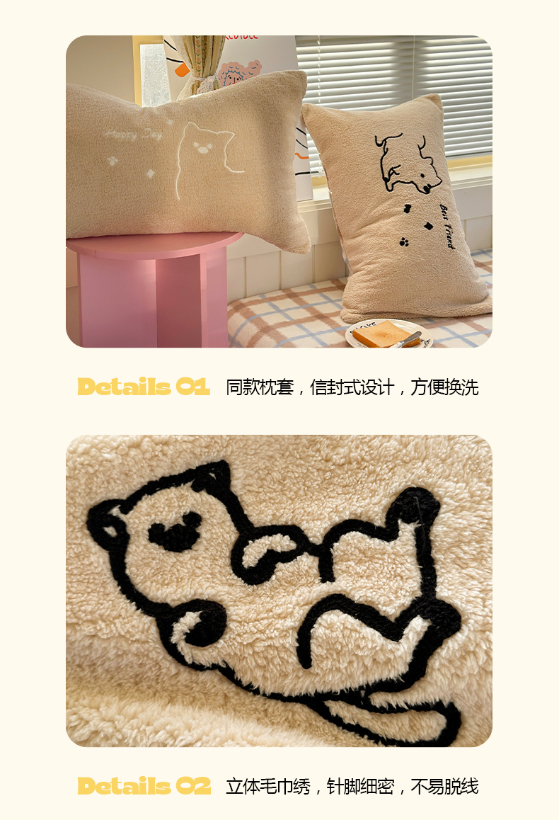(总)暖生活 2025新款兔绒贴布绣牛奶绒套件四件套(会员-5),小泰迪,红围巾小狗,线团小猫,泳圈企鹅