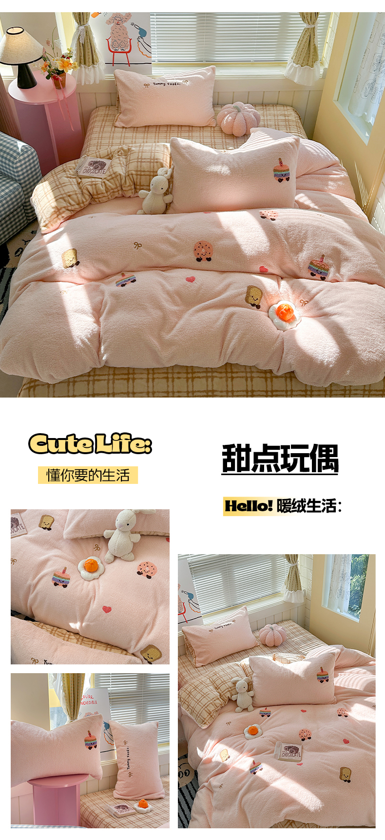 商品名称:暖生活 2025新款高克重细颗粒羊羔绒四件套 甜点玩偶