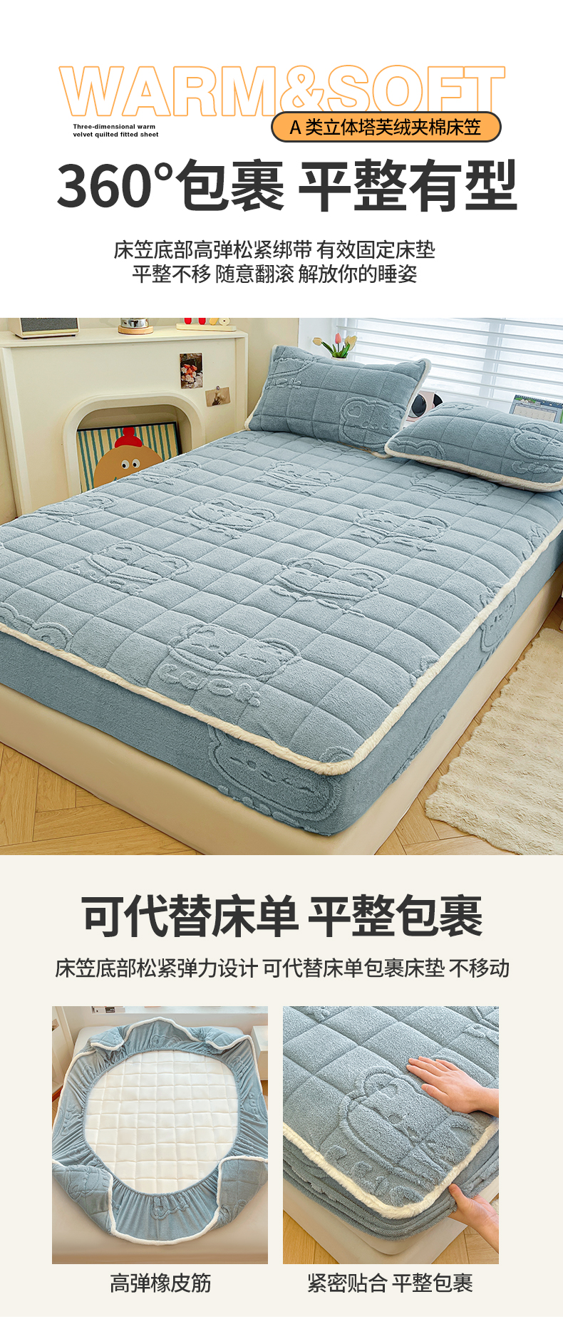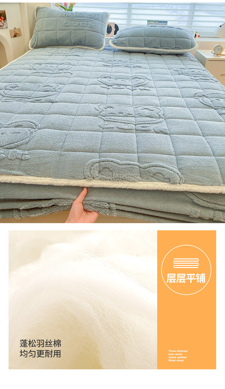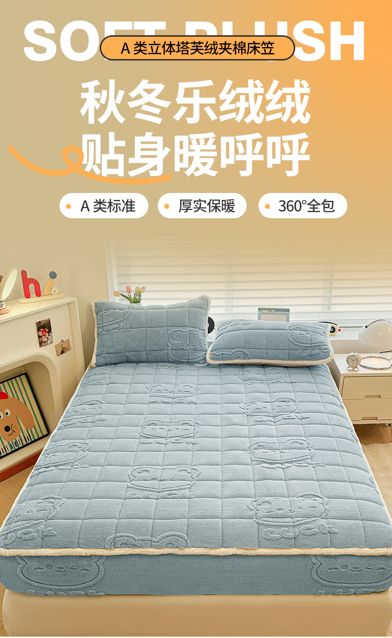 予梦家纺 2025新款塔芙绒加厚夹棉床笠床垫保护套 萌萌熊 苍蓝