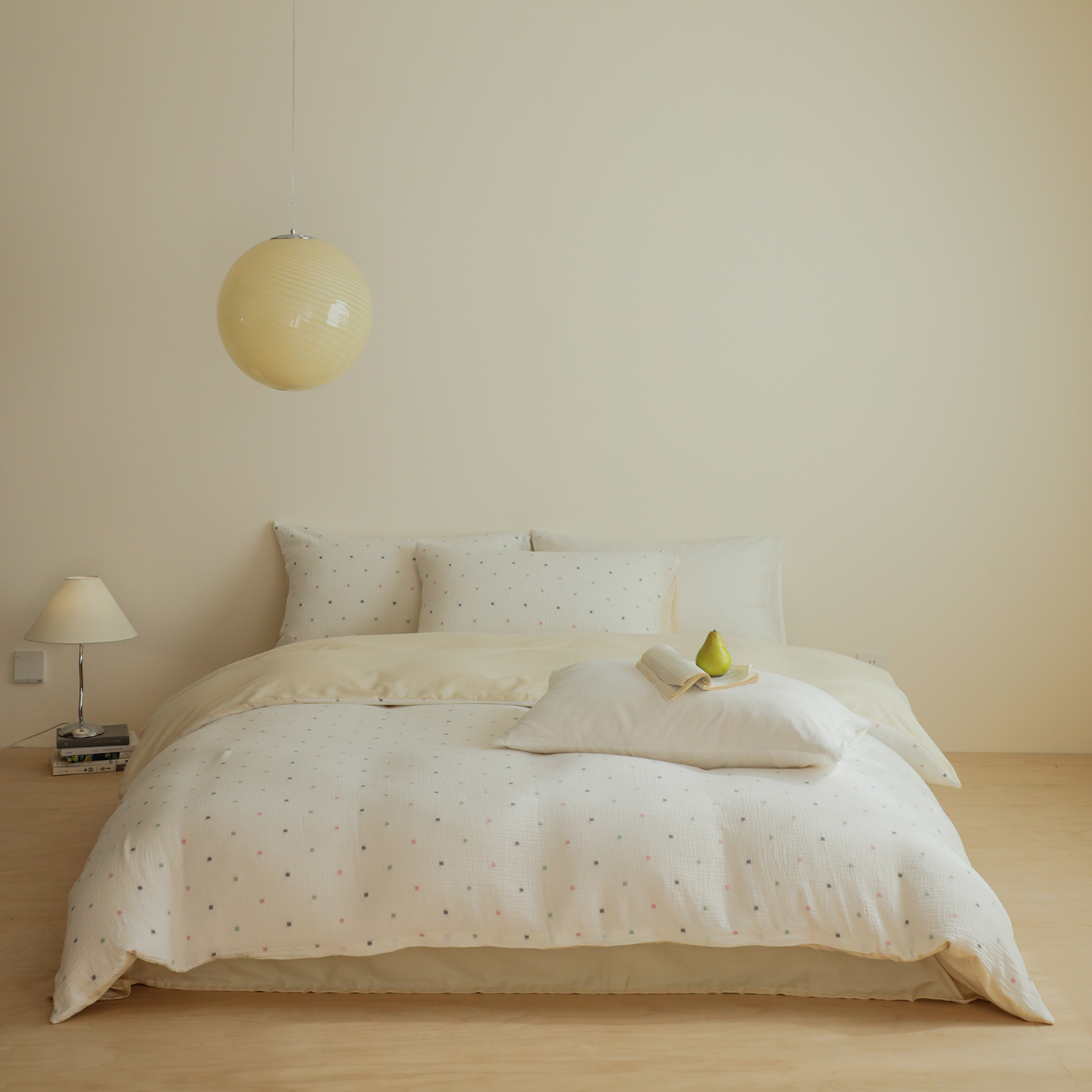 商品名称:小春日和 2025新款全棉双层纱A类母婴四件套纯棉提花纱布床上用品四件套纯色床单亲肤被套民宿套件1.8床笠 叙言-粉