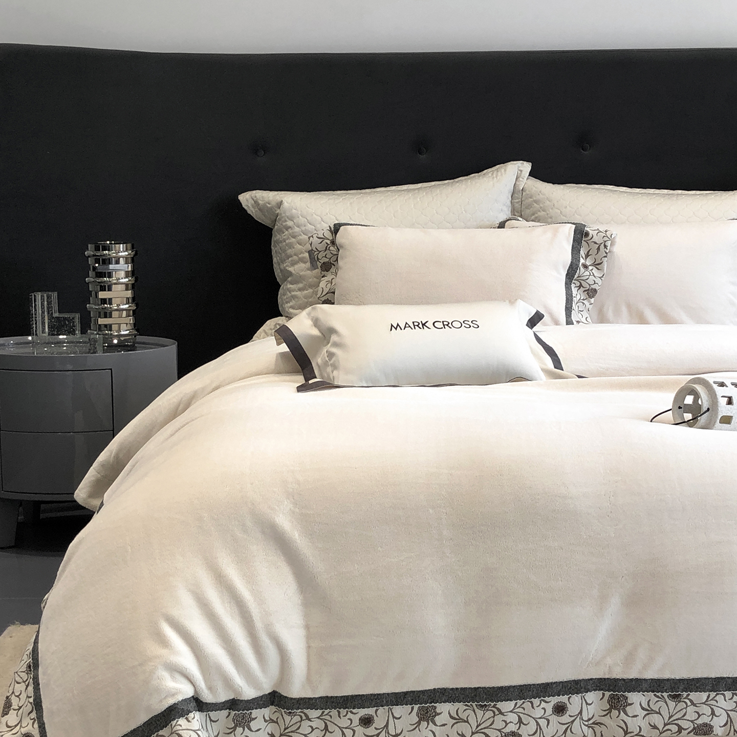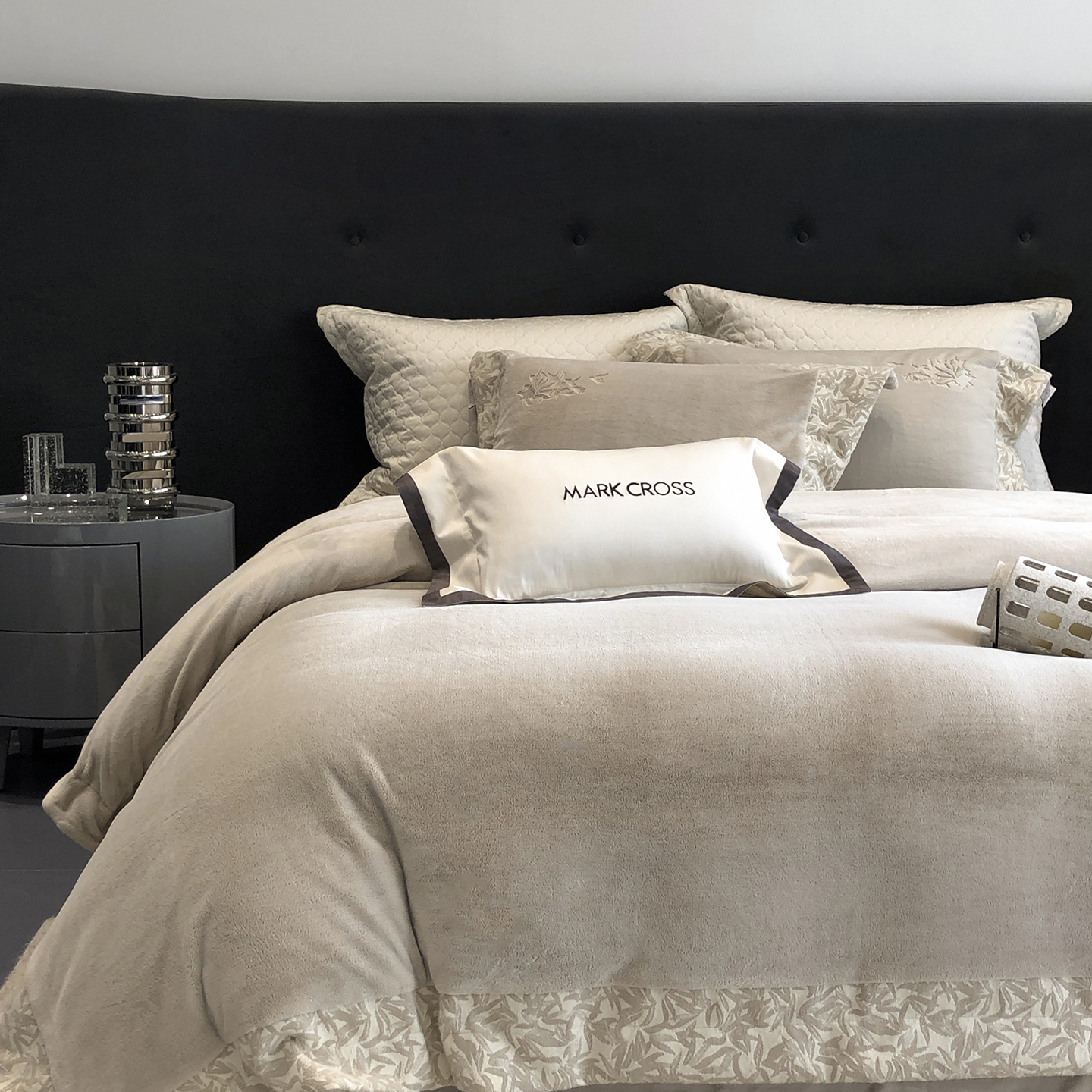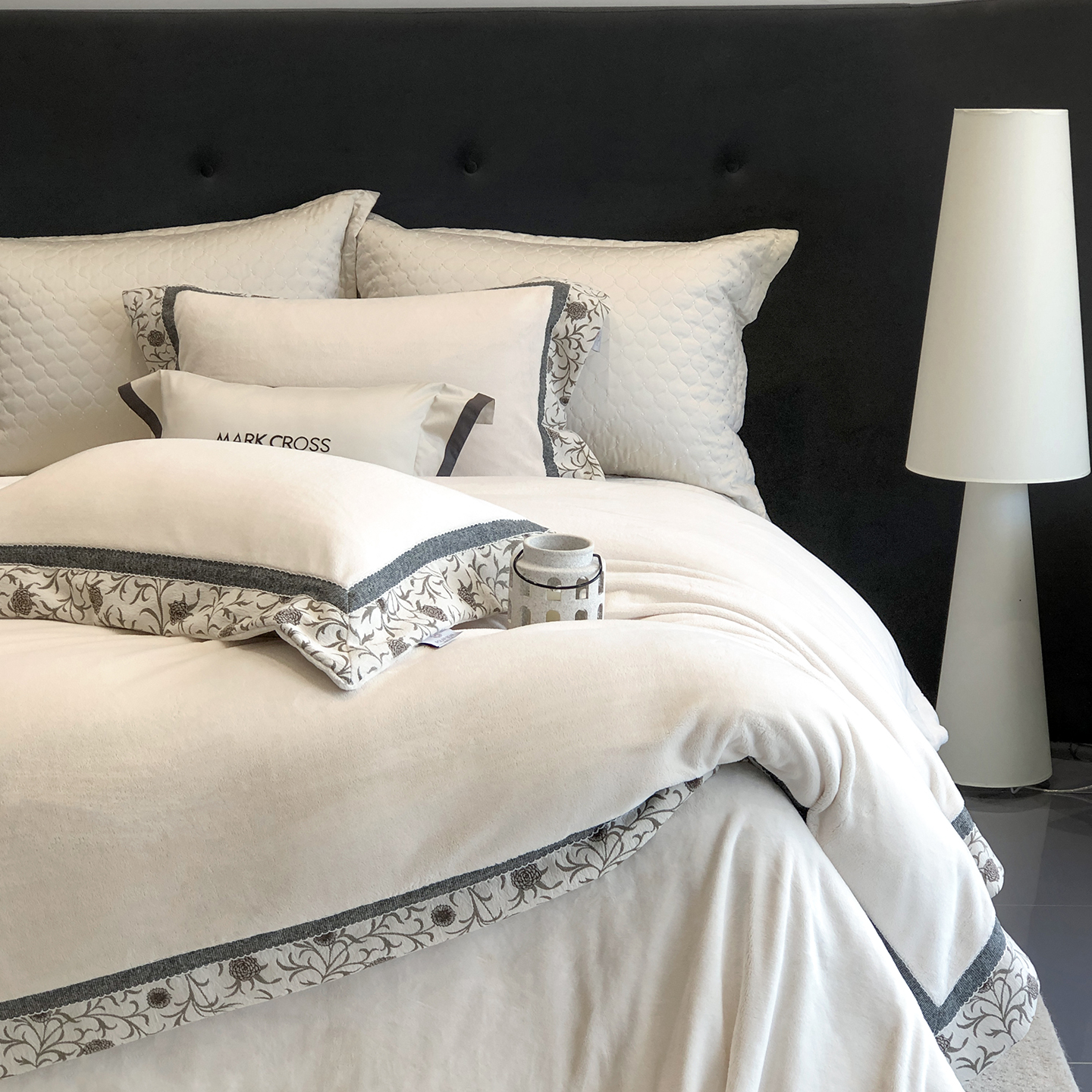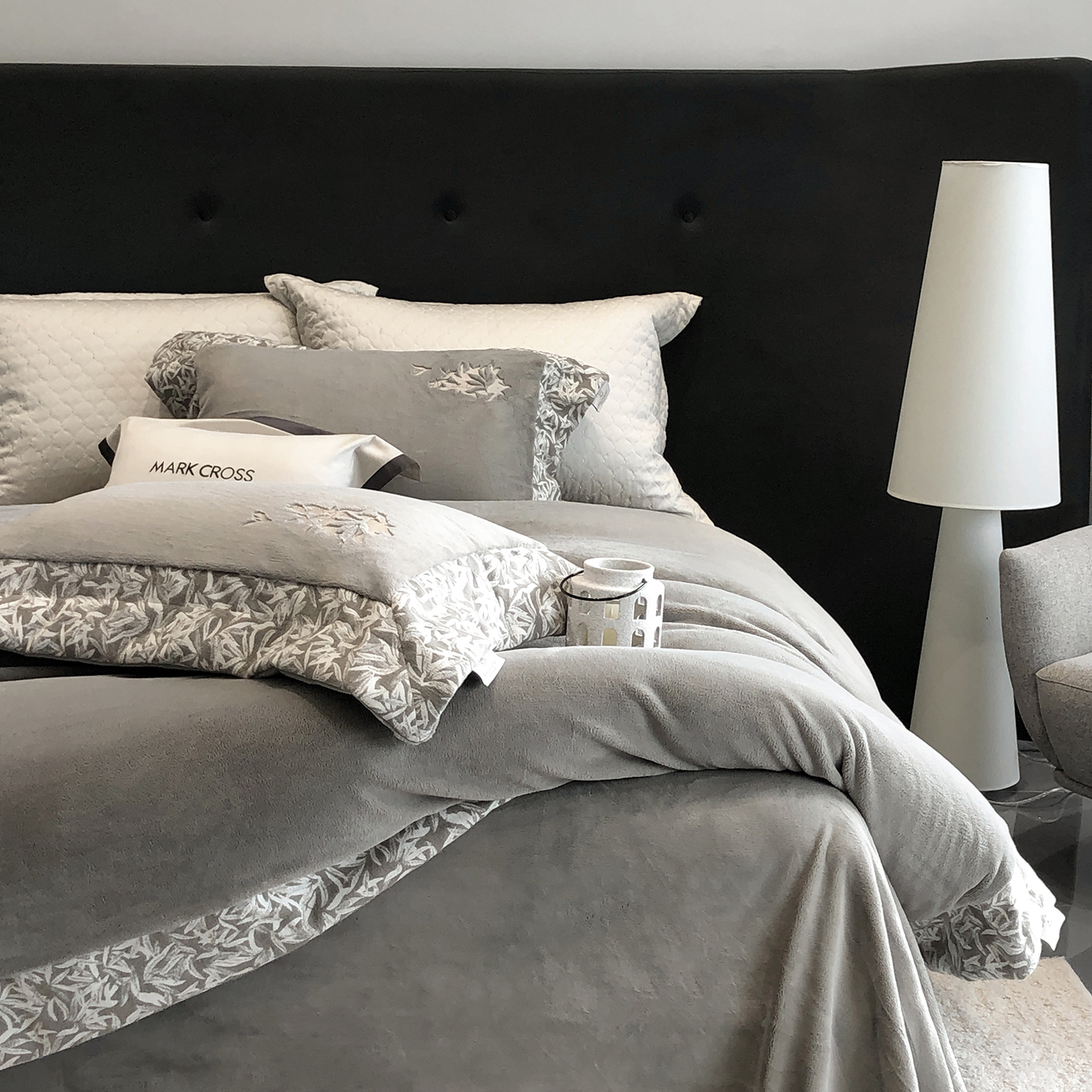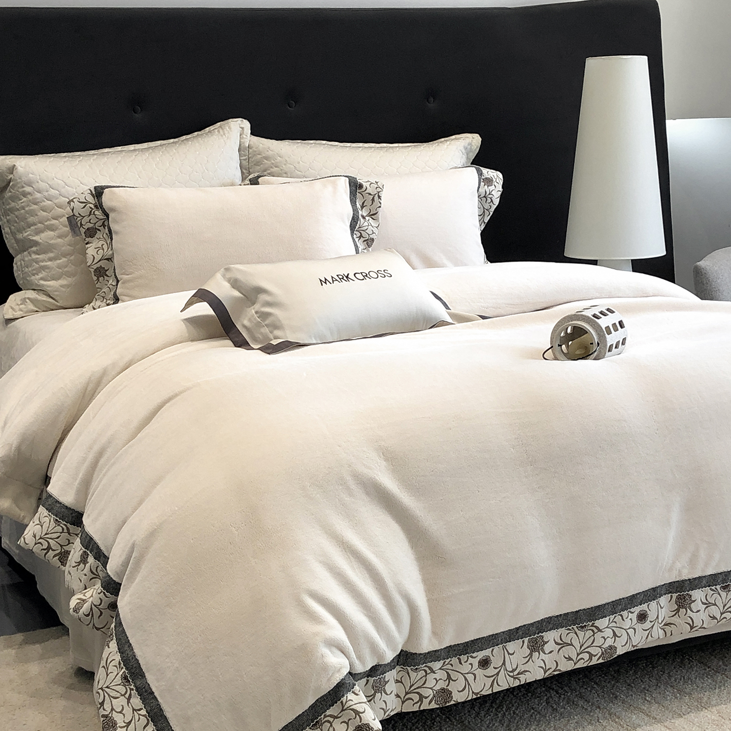 商品名称:佳汐蓝家纺 2025新款熊极绒2.0重工色织大拼边系列四件套 仙本娜梦境-浅影灰