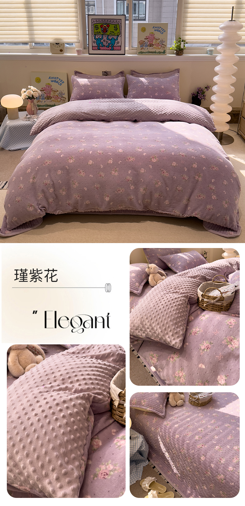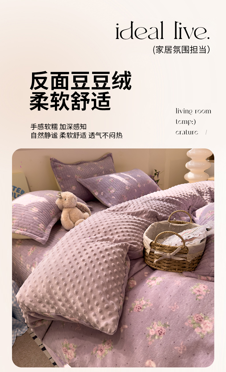 当前位置: 91家纺网 > 商品网购 > 床品套件 > 四件套 > 牛奶绒四件套 > 佰亿莱 2026新款牛奶绒豆豆绒印花床盖四件套 瑾紫花