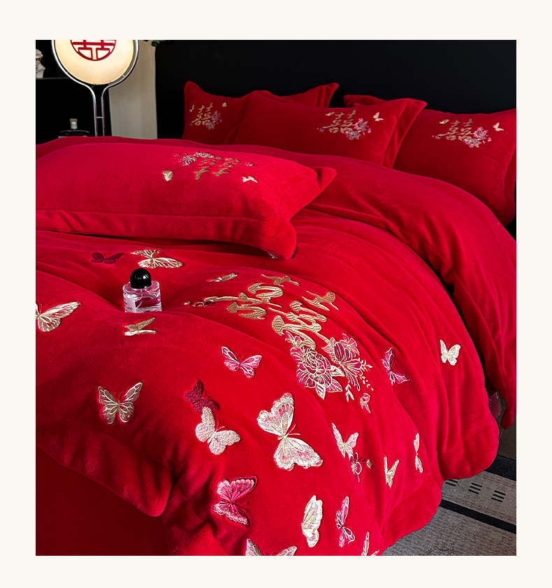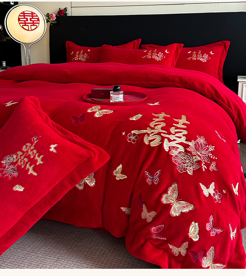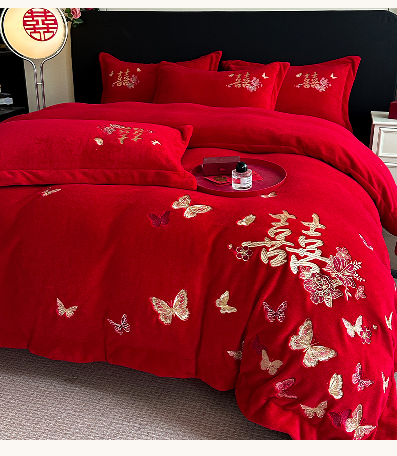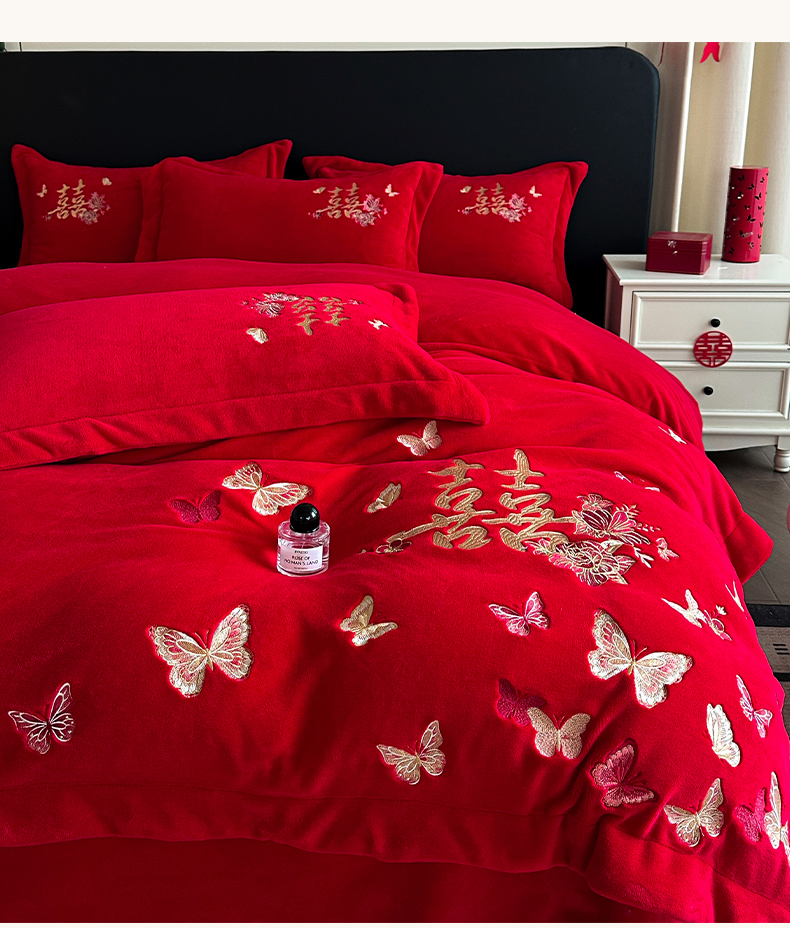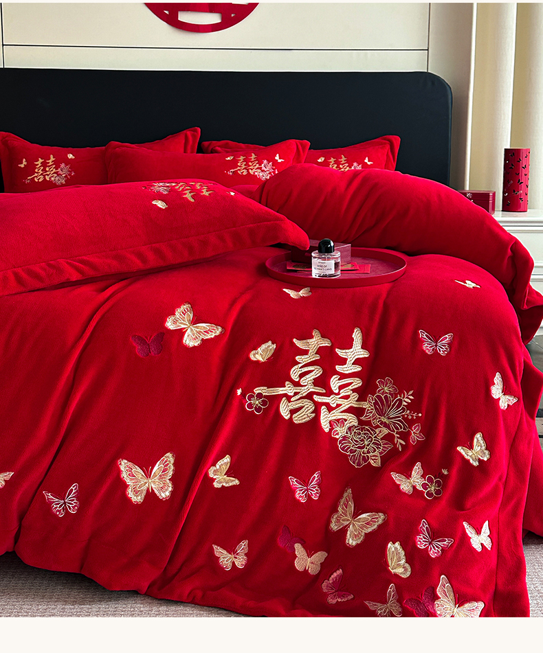 (总)帝王家纺 2025新款加厚保暖牛奶绒婚庆刺绣四件套珊瑚绒红色结婚床品-蝶舞喜事