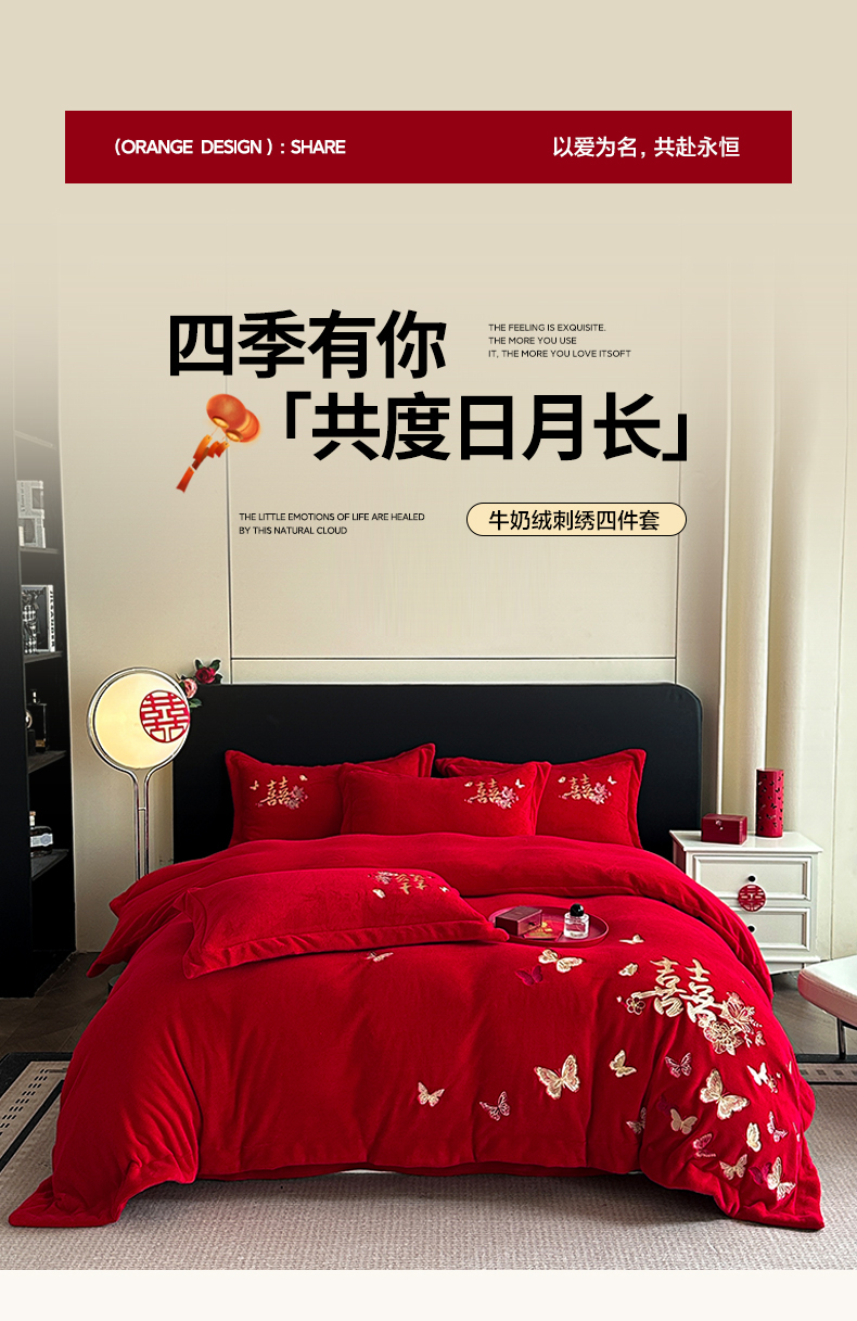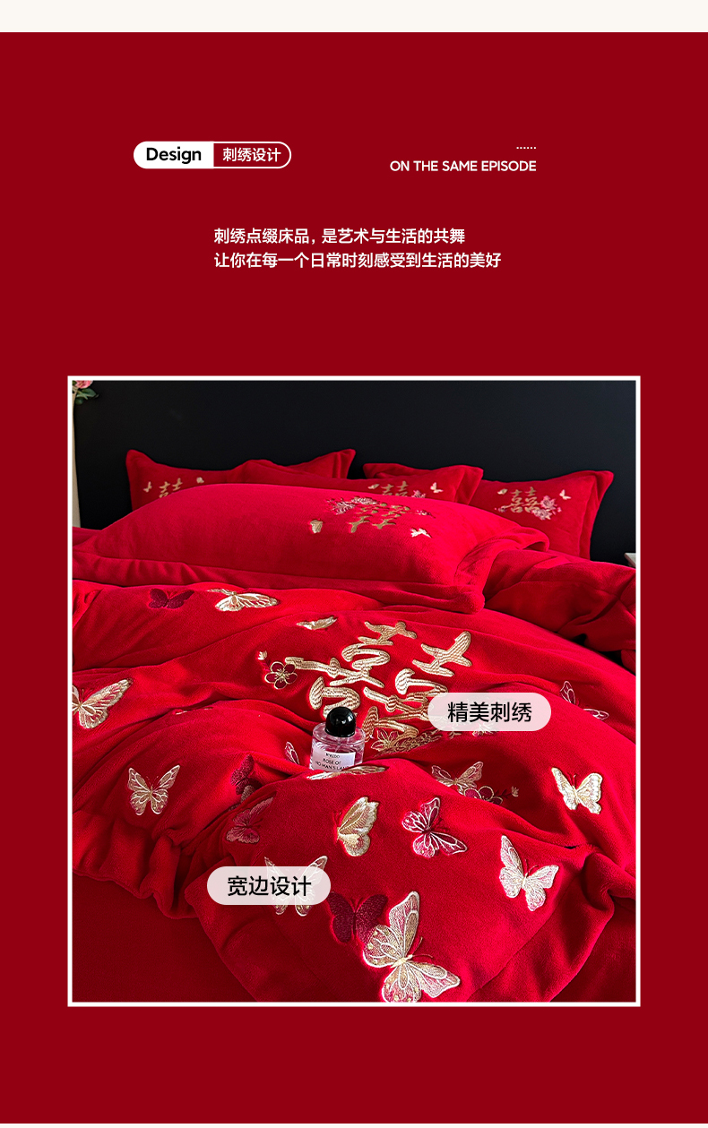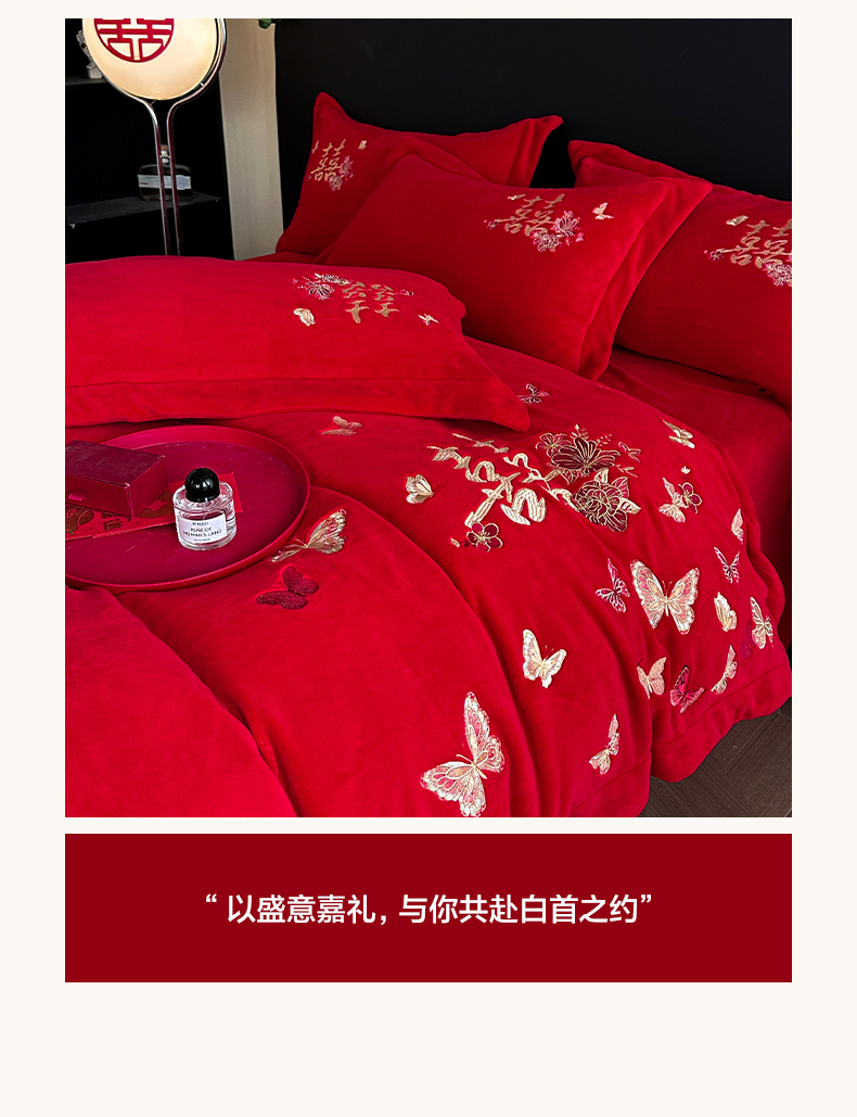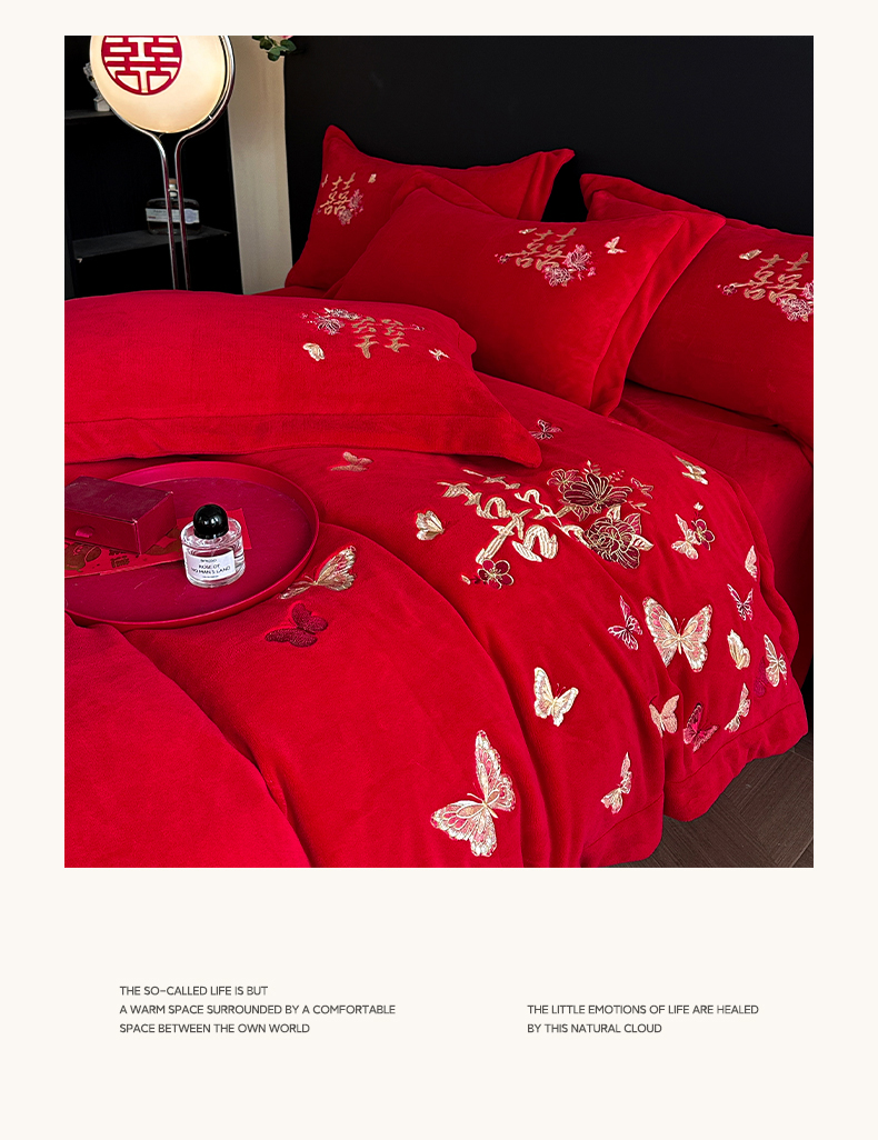 (总)帝王家纺 2025新款加厚保暖牛奶绒婚庆刺绣四件套珊瑚绒红色结婚床品-蝶舞喜事