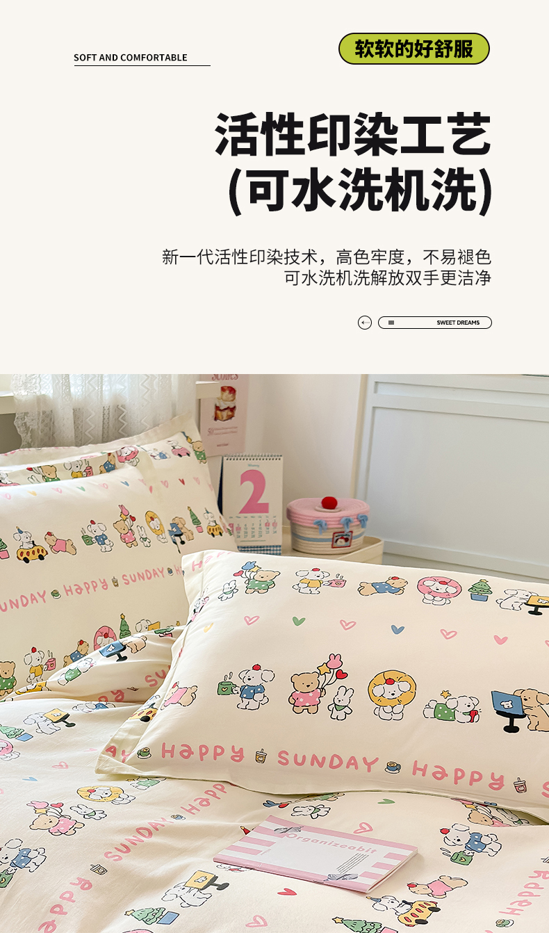(总)拾物记 2023新款喷气全棉卡通小清新系列单床单,欢乐萌熊,奶油兔-红