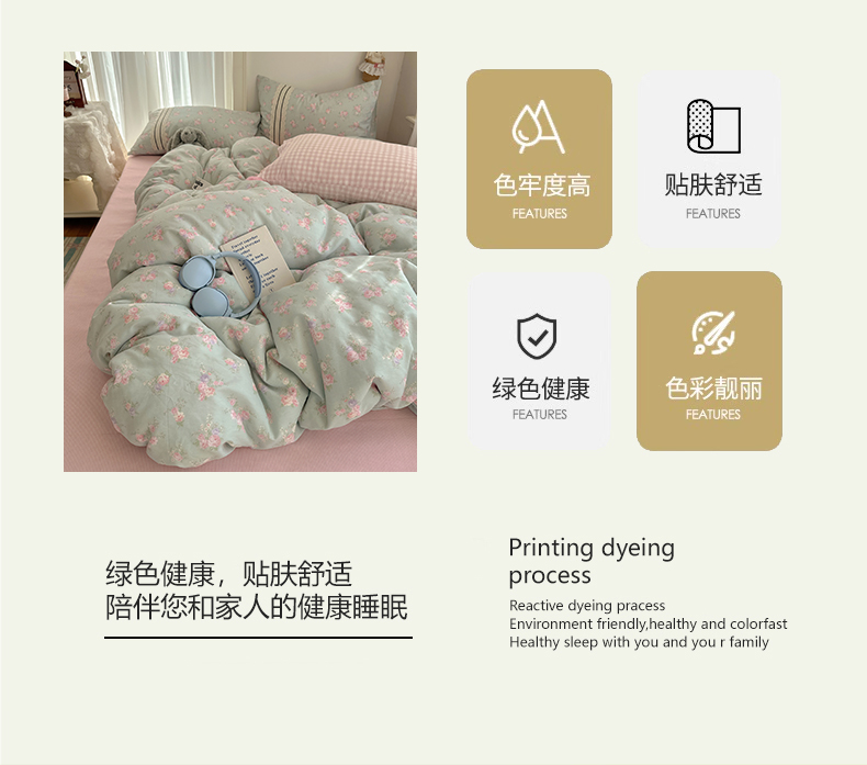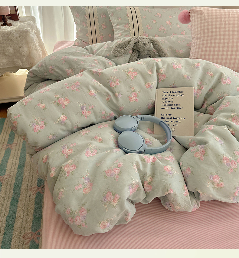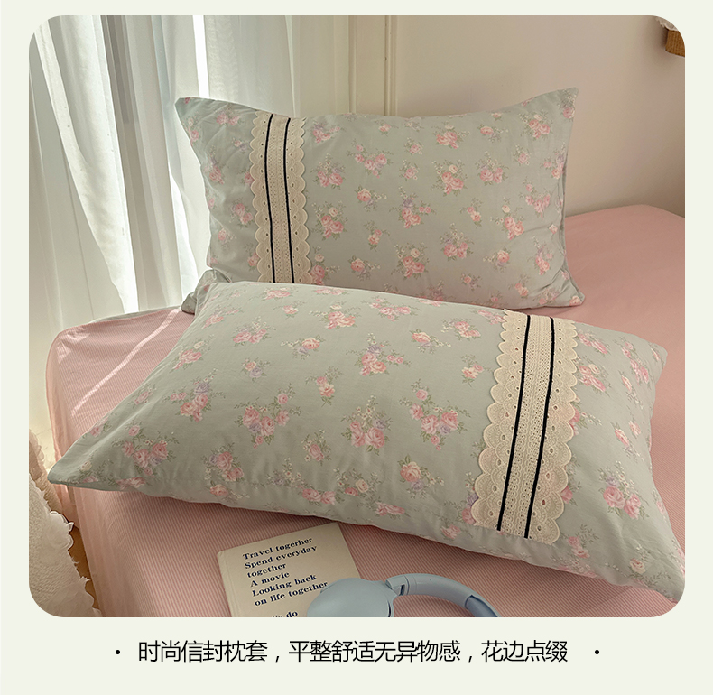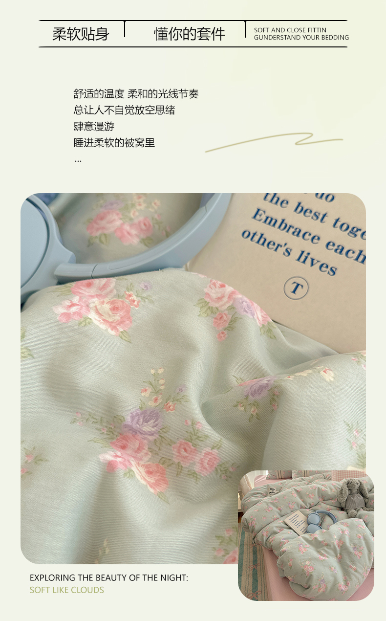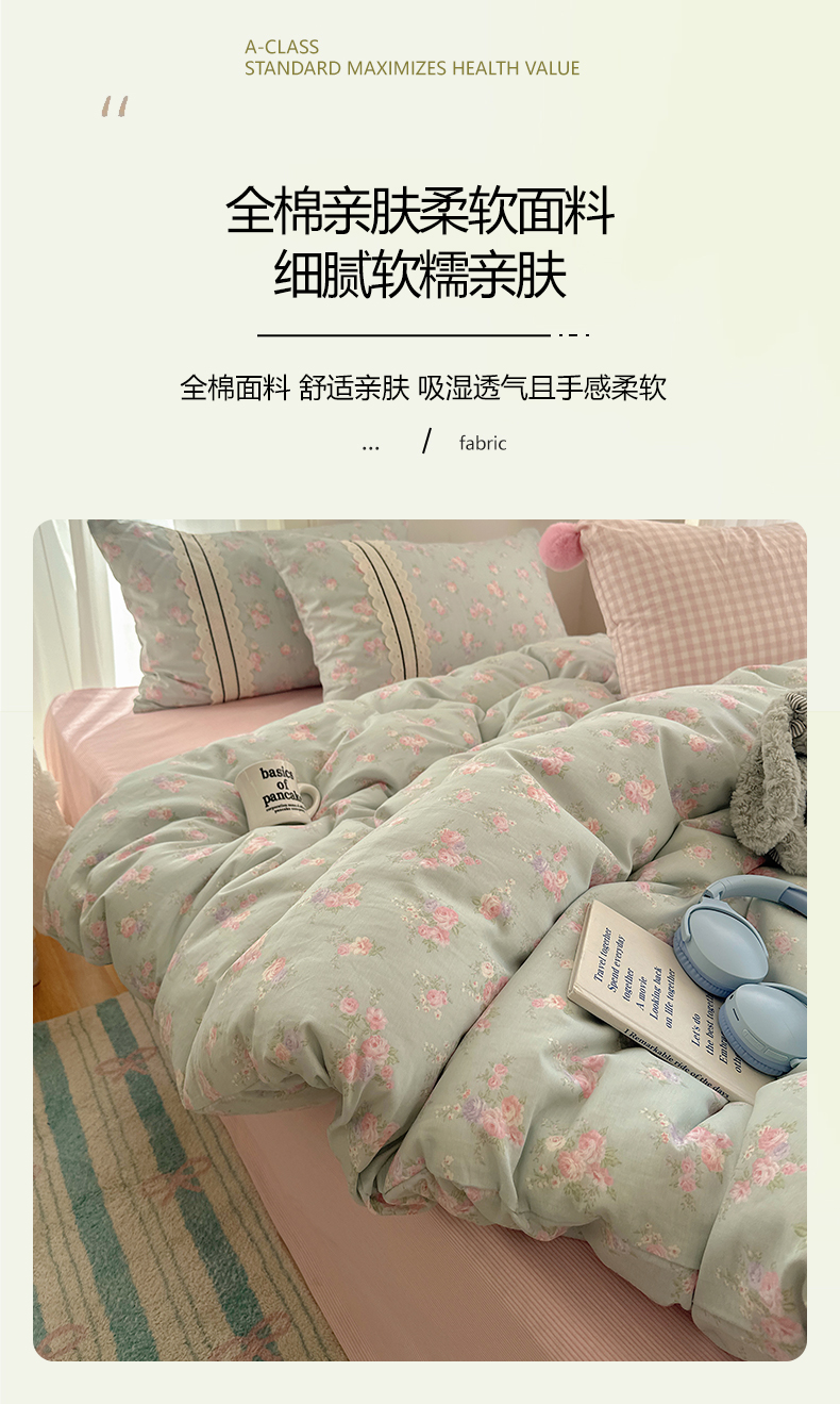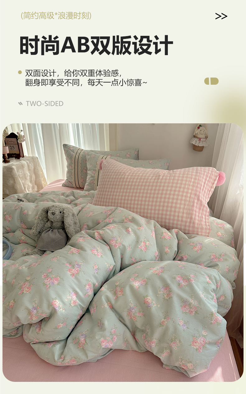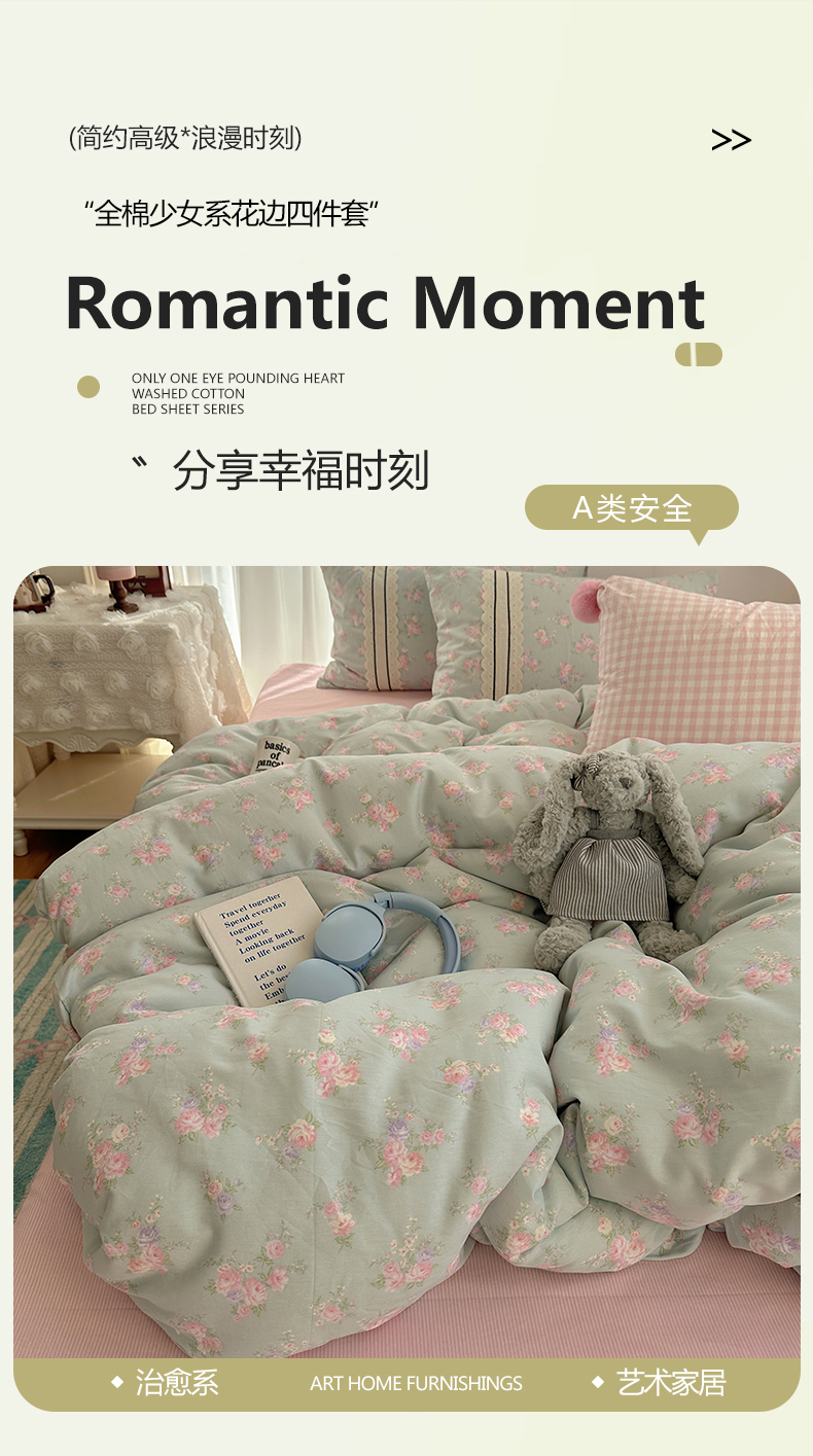 (总)三朵家纺 2026新款A类云柔水洗棉韩版法式花边云朵棉四件套,春夕集,罗逸维绿,如漫,惜花灰绿,赫拉
