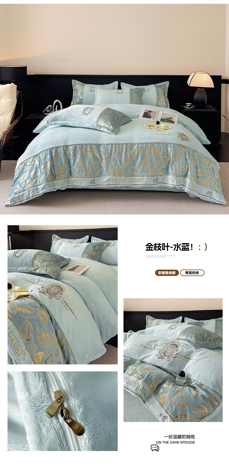 (总)帝王家纺 2025新款冬季刺绣加厚保暖烫金牛奶绒四件套珊瑚绒轻奢高级感,灰色,柔粉,青蓝,香槟,米白