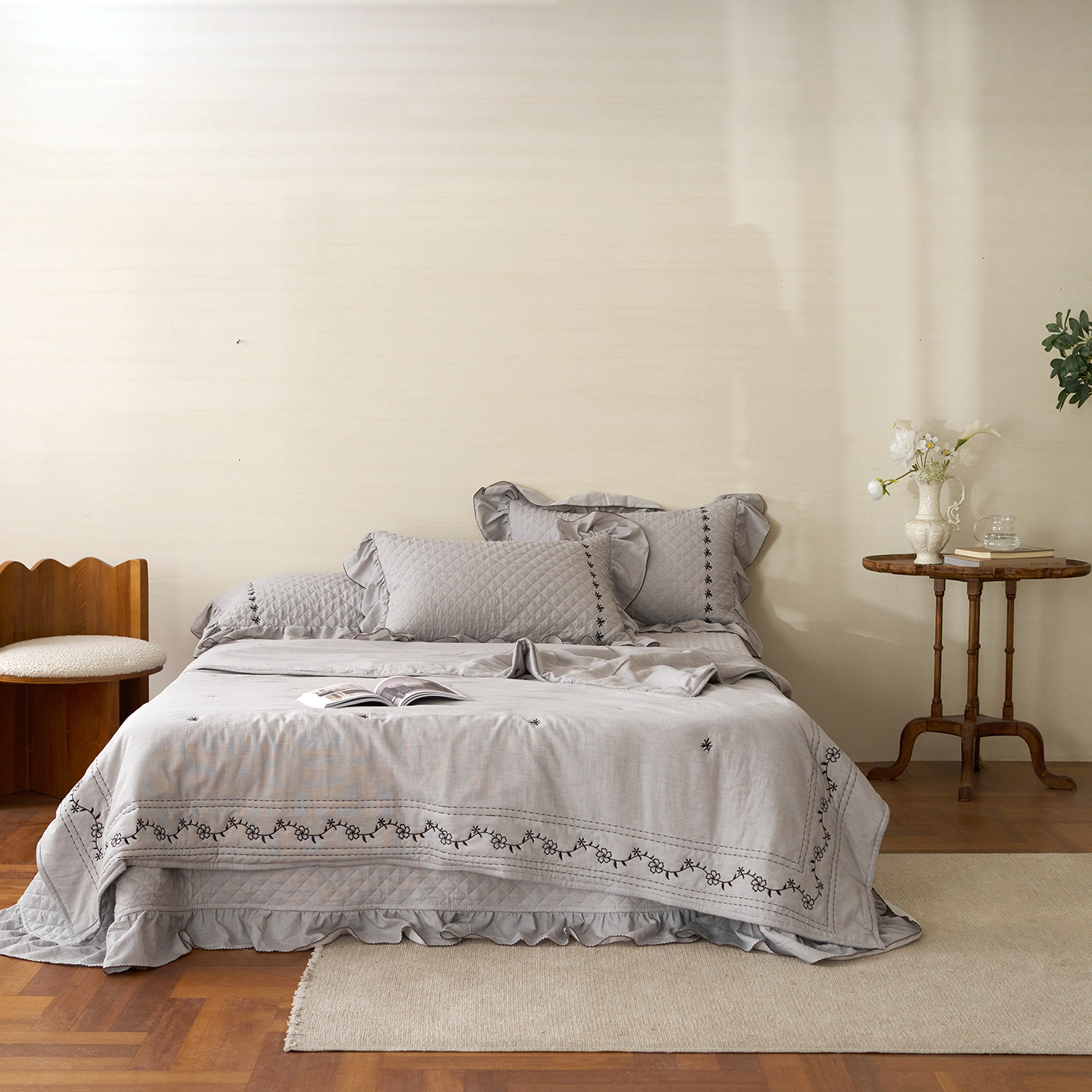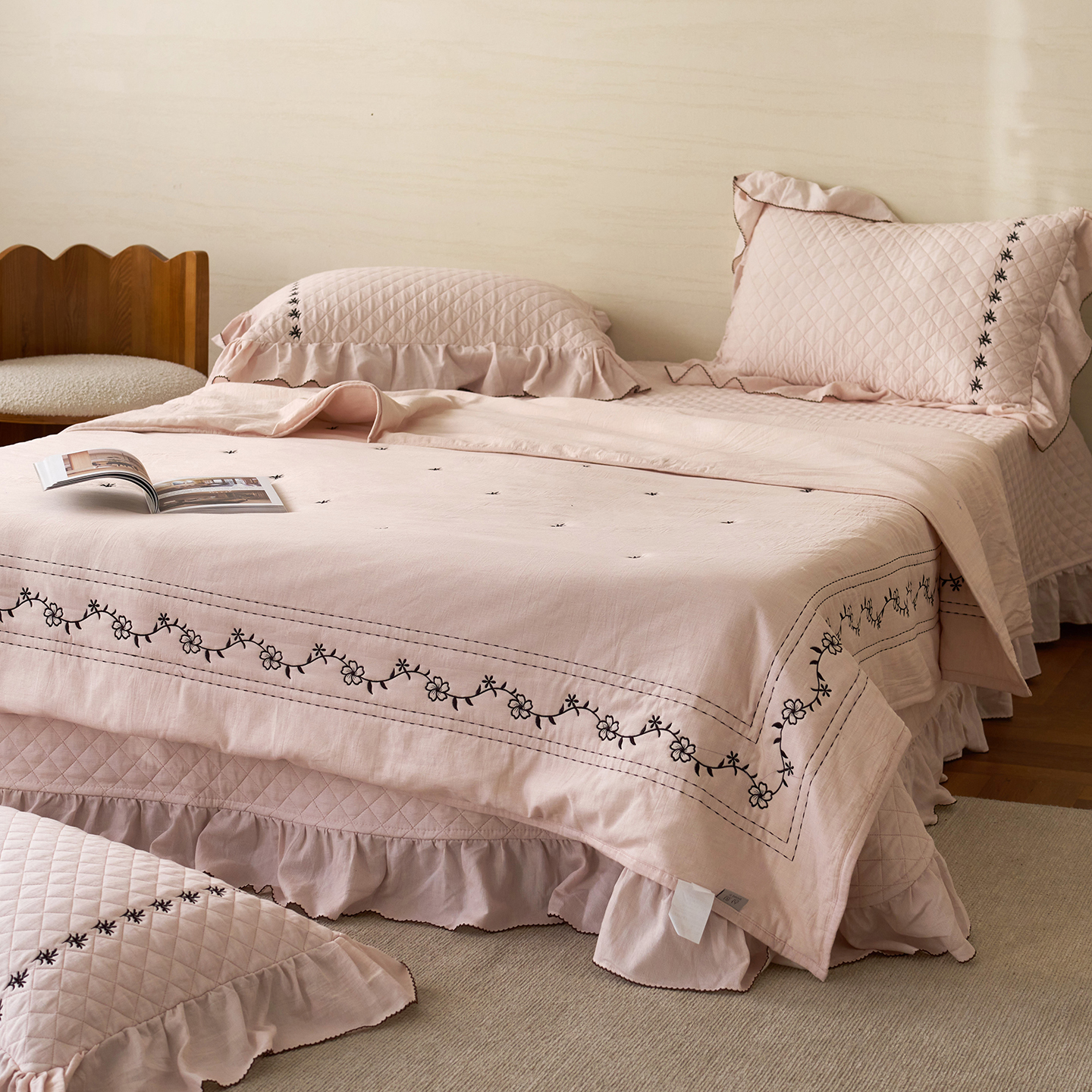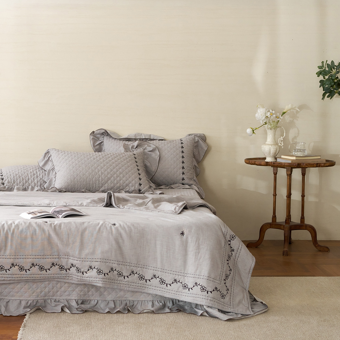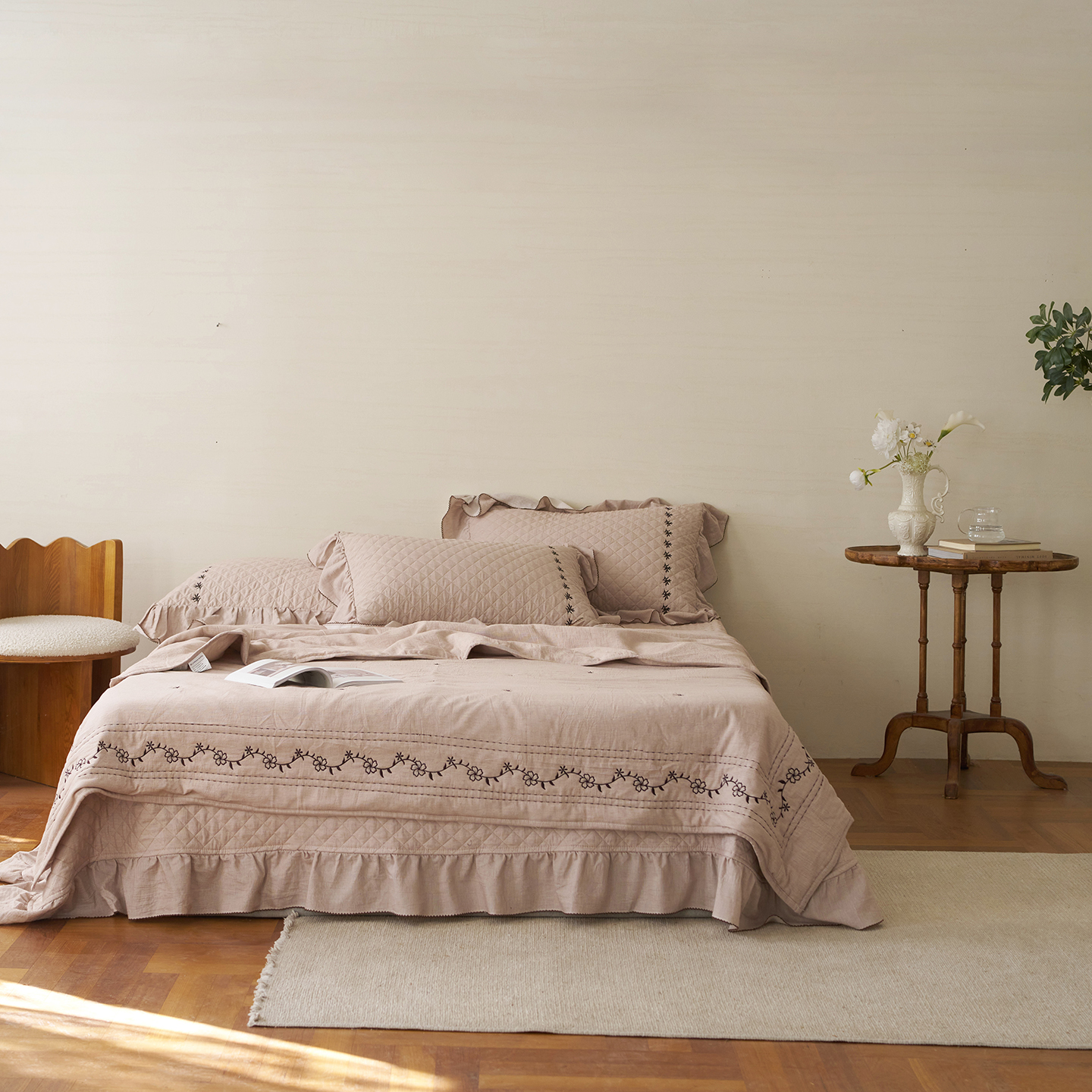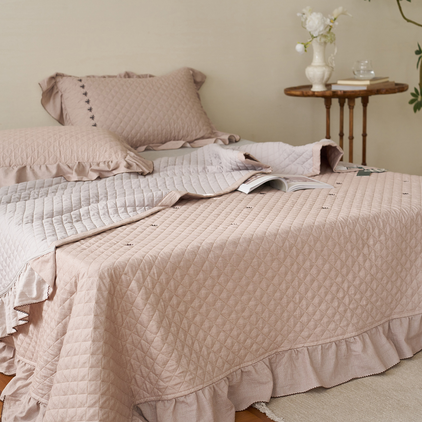 (总)上喜 2026新款棉麻小花刺绣款床盖多功能被子系列,麻本色,麻粉色