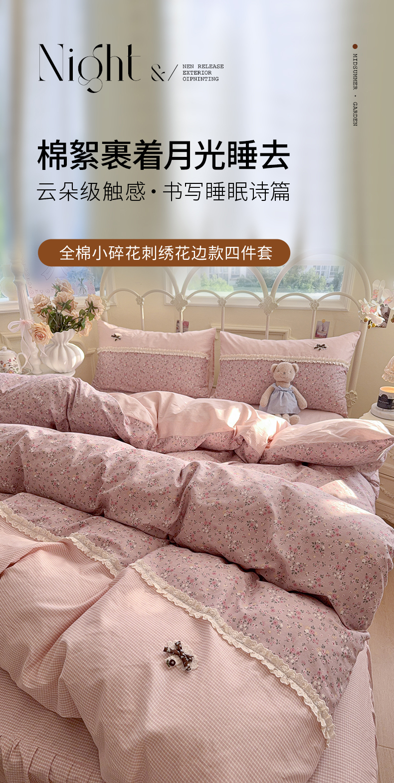 当前位置: 91家纺网 > 商品网购 > 床品套件 > 四件套 > 全棉普通四件套 > 安莱生活 2026年新品全棉纯棉小碎花刺绣花边款四件套-小碎花系列 花漾粉