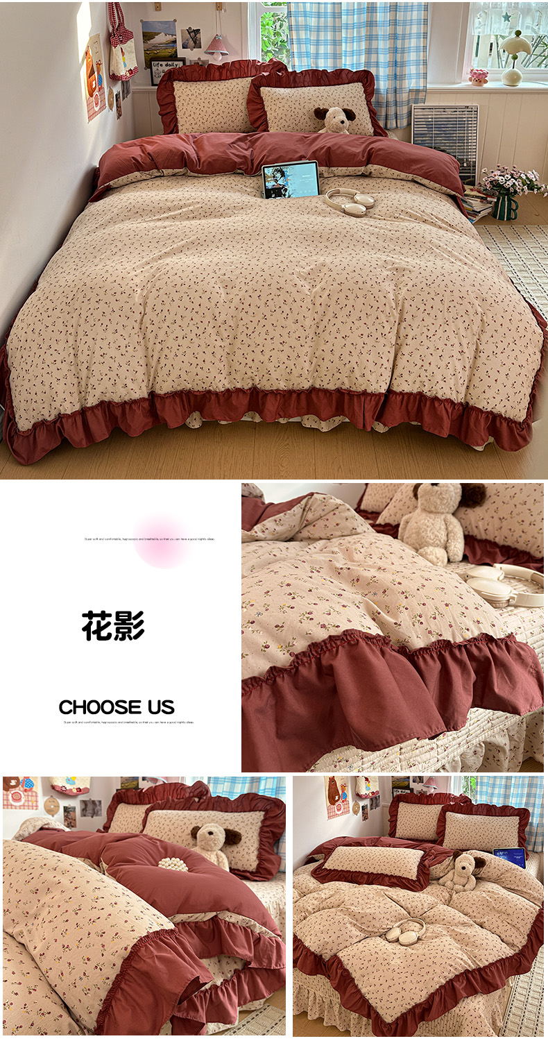 当前位置: 91家纺网 > 商品网购 > 床品套件 > 四件套 > 其它四件套 > 富米莱(原臻工厂) 2026春夏新款仿棉A类韩系大花边床盖床裙四件套 花影