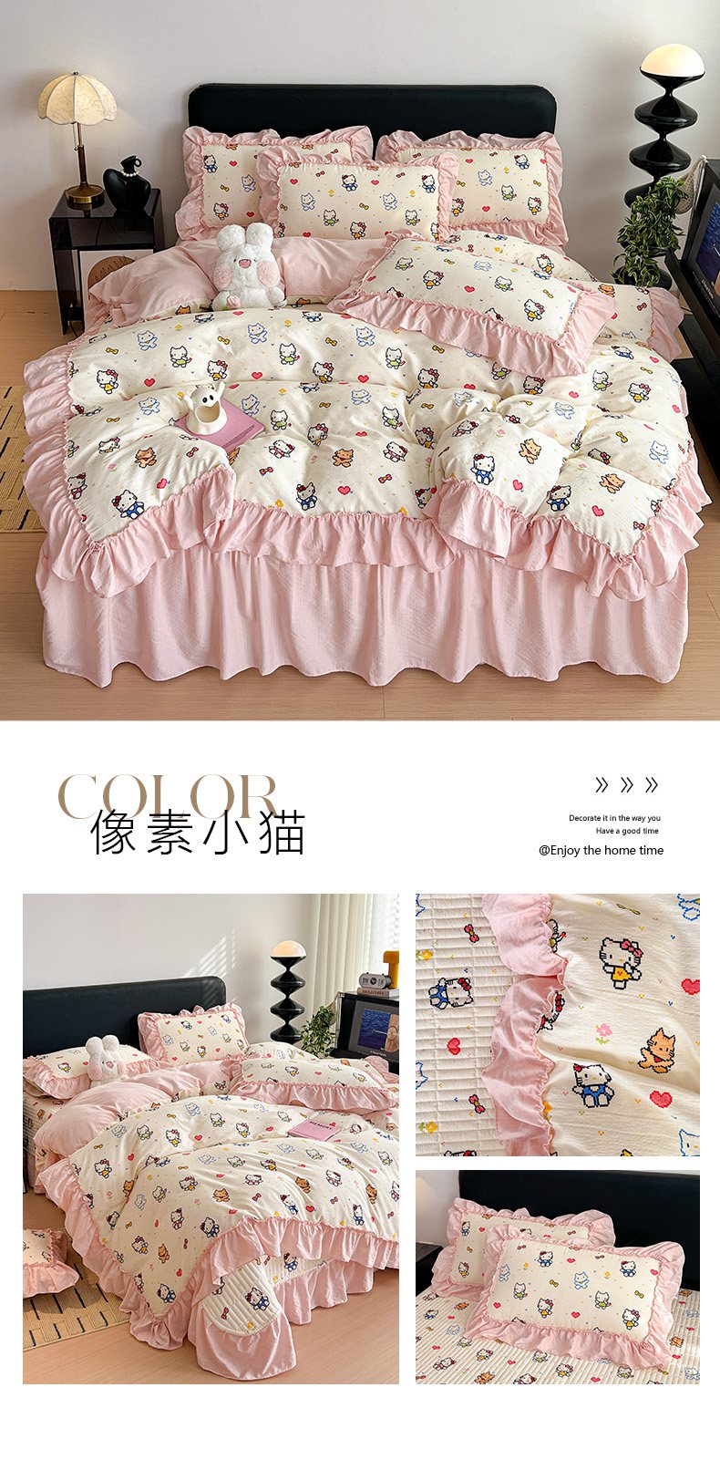 当前位置: 91家纺网 > 商品网购 > 床品套件 > 四件套 > 双层纱四件套 > 富米莱(原臻工厂) 2026新款敲可爱奶呼呼云感双层纱韩国大布袋韩版大花边床盖床裙四件套-超级治愈 木马