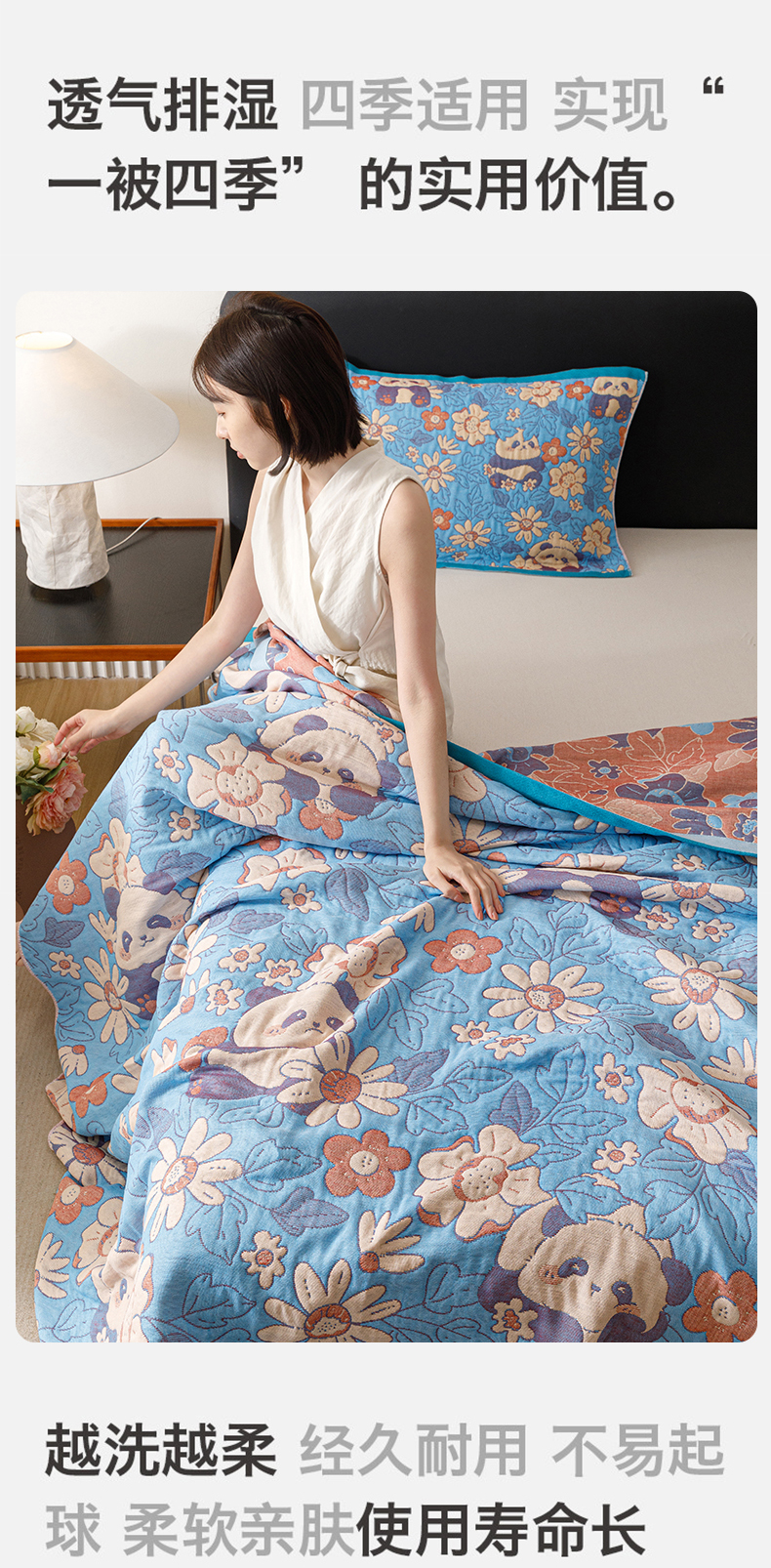 商品名称:朴尔家纺-毛巾被 2026新款彩棉云柔棉三层纱布毛巾被 熊猫派对