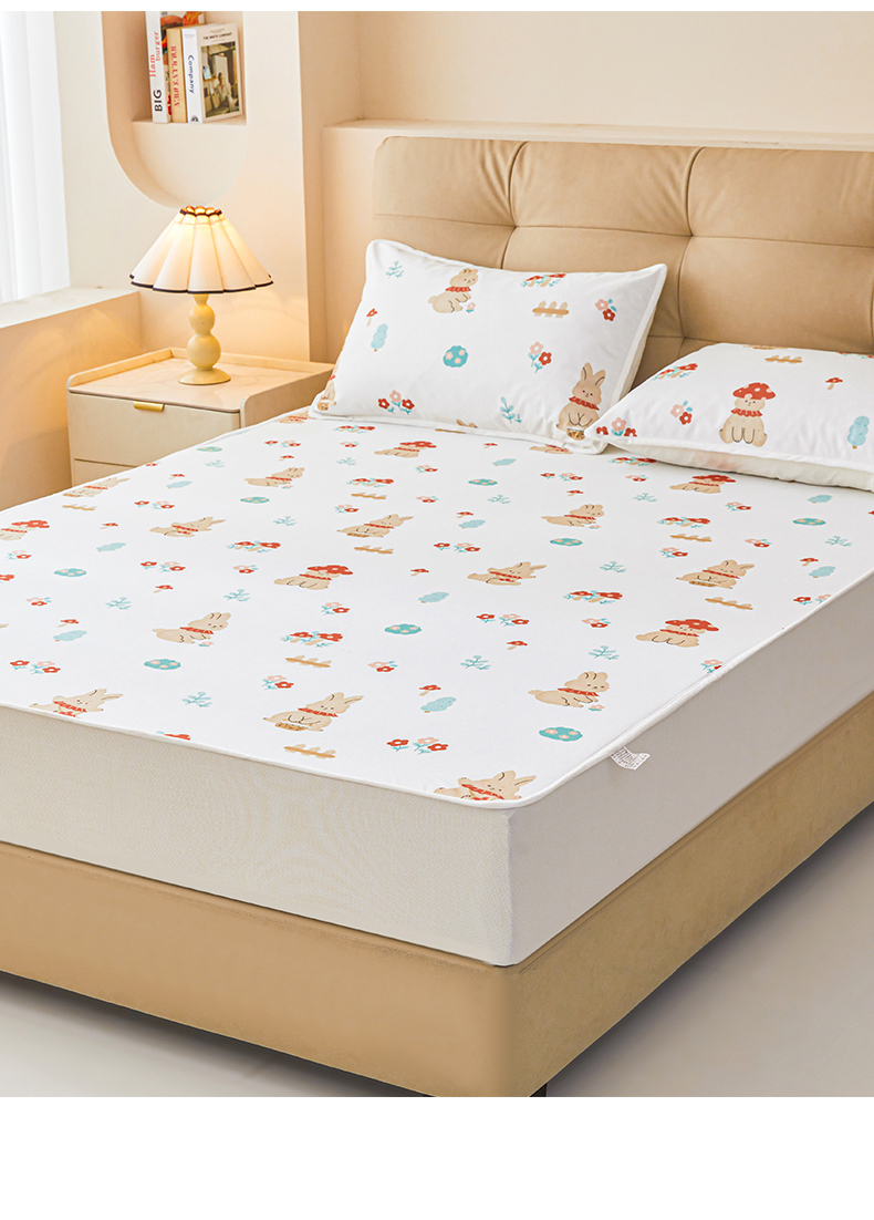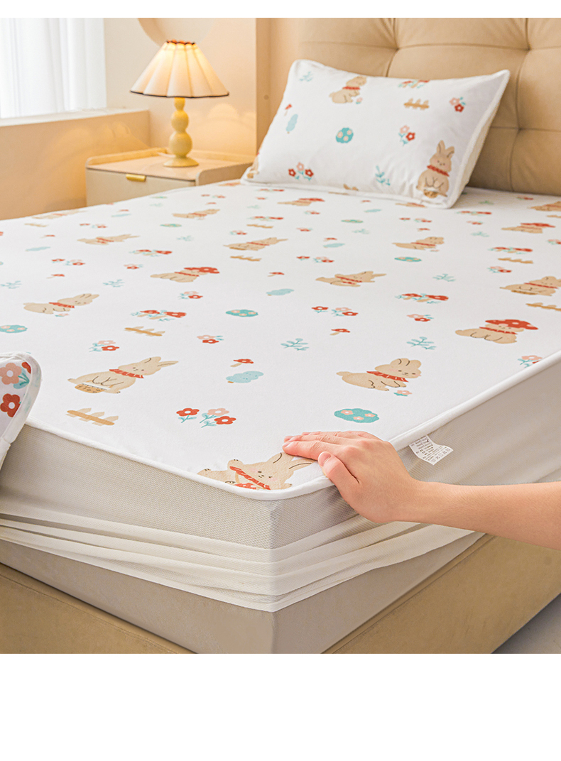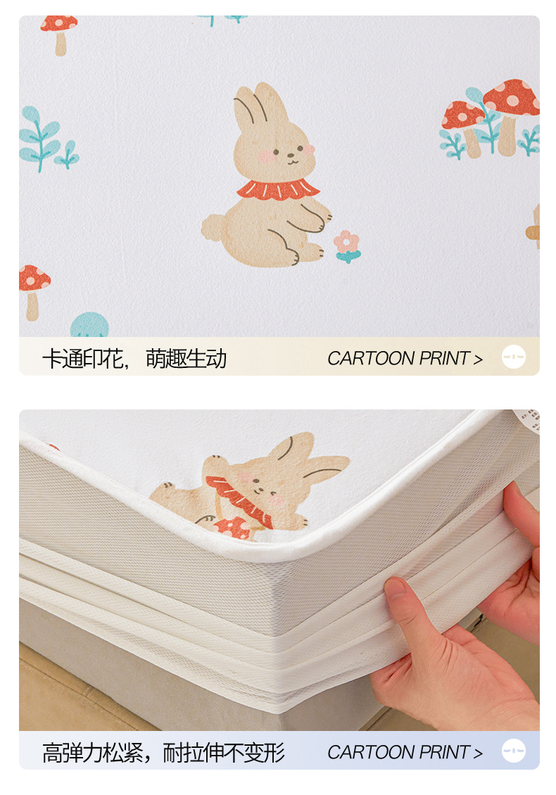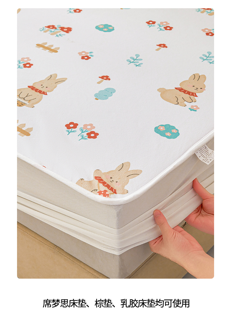 • 91家纺网 家纺一手货源 找家纺 女子家纺 2026春夏新款TPU防水隔尿床护垫床笠款印花小清新卡通儿童床垫保护套 防水床笠-甜梦小兔