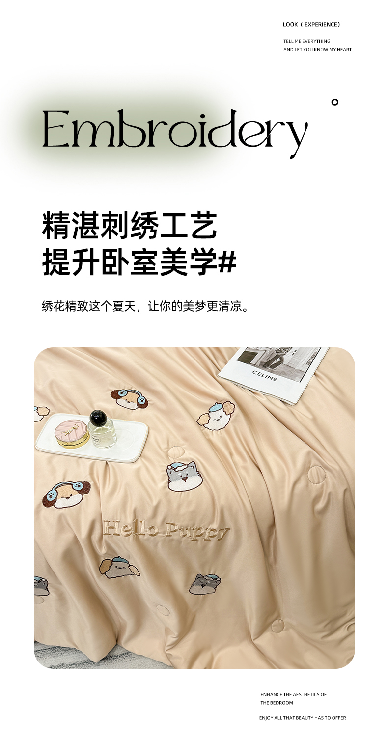• 91家纺网 家纺一手货源 找家纺 (总)欢乐季 2026新款A类水洗冰丝满版刺绣夏被夏凉被空调被四件套,狗狗-梧桐灰,花朵-奶白粉,猫咪-奶白蓝,南瓜-水果奶黄,小熊-奶黄绿,郁金香-奶白紫