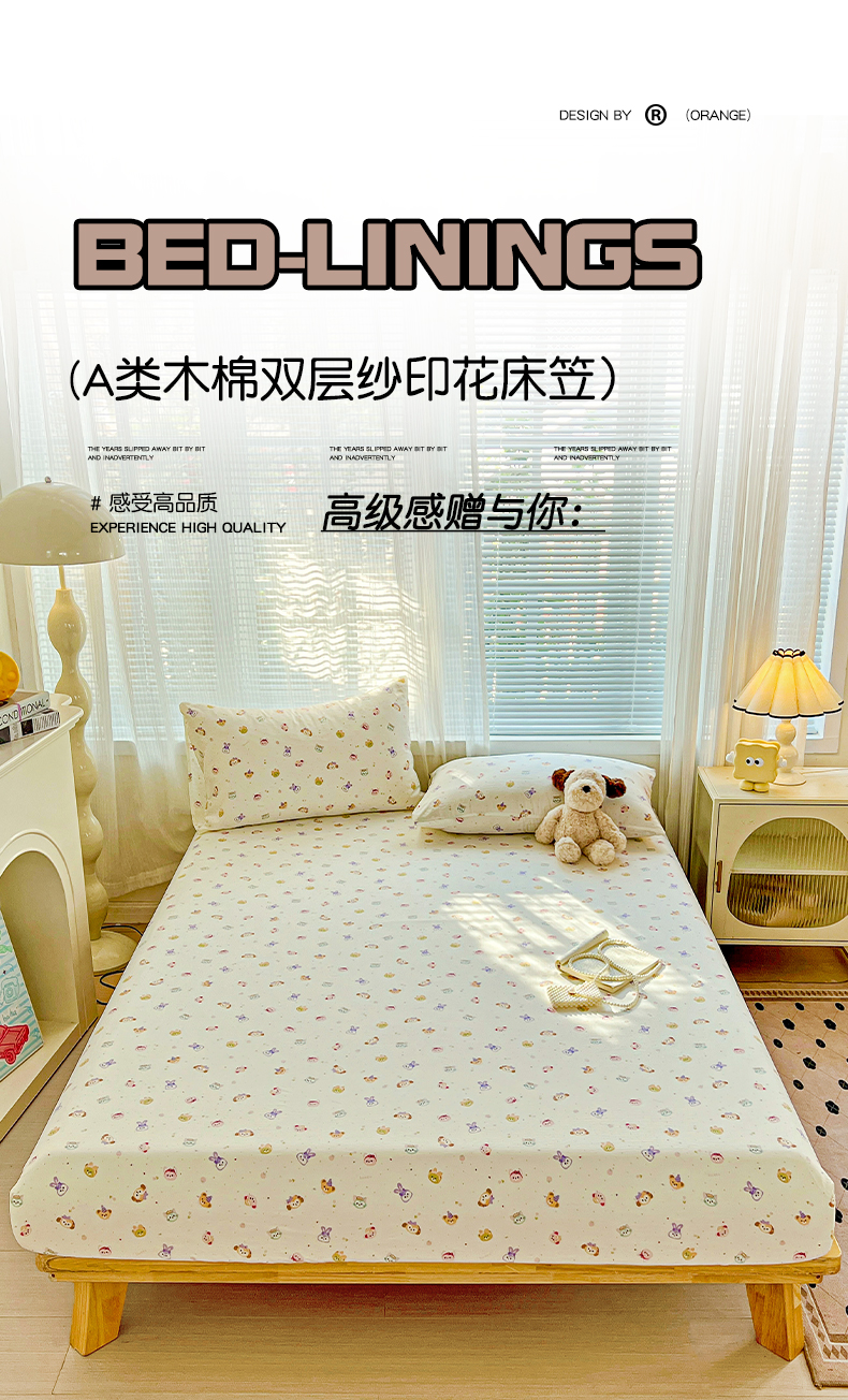 优选 2026新款ins小清新木棉双层纱印花床笠床垫保护罩枕套三件套 宠溺